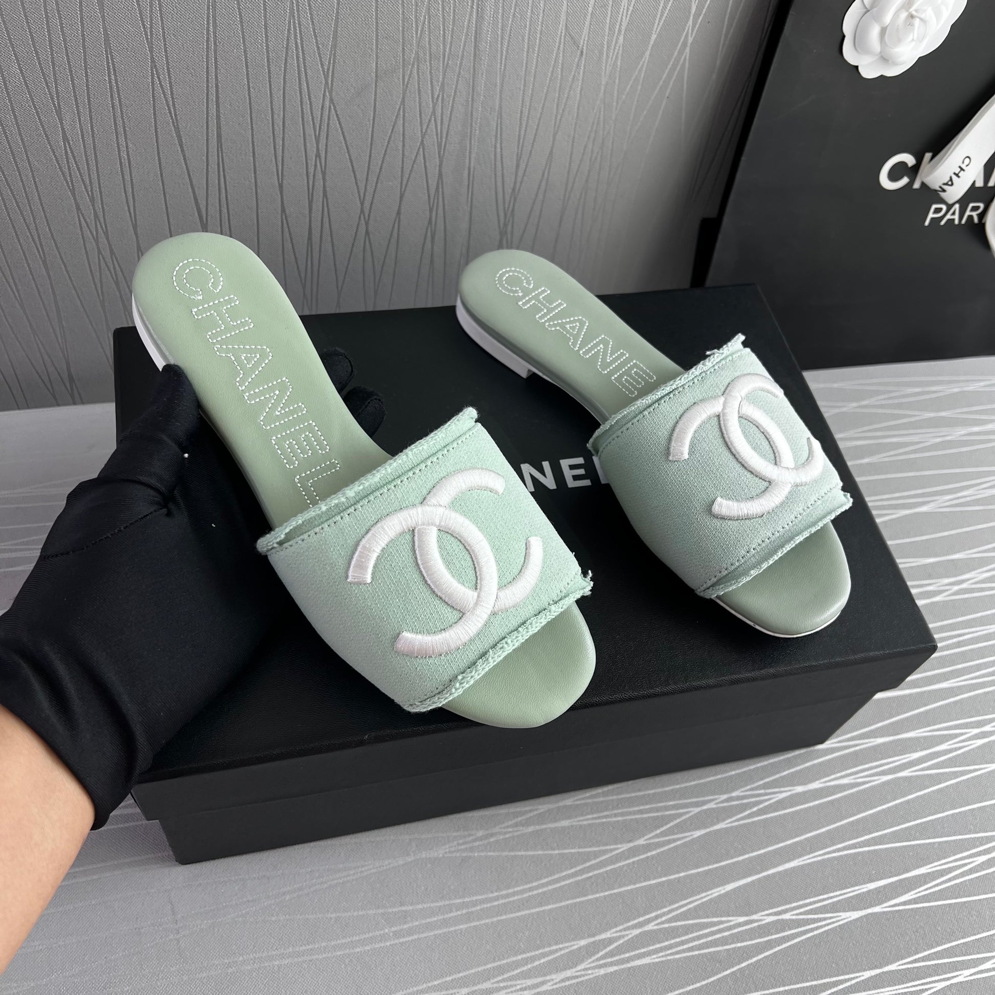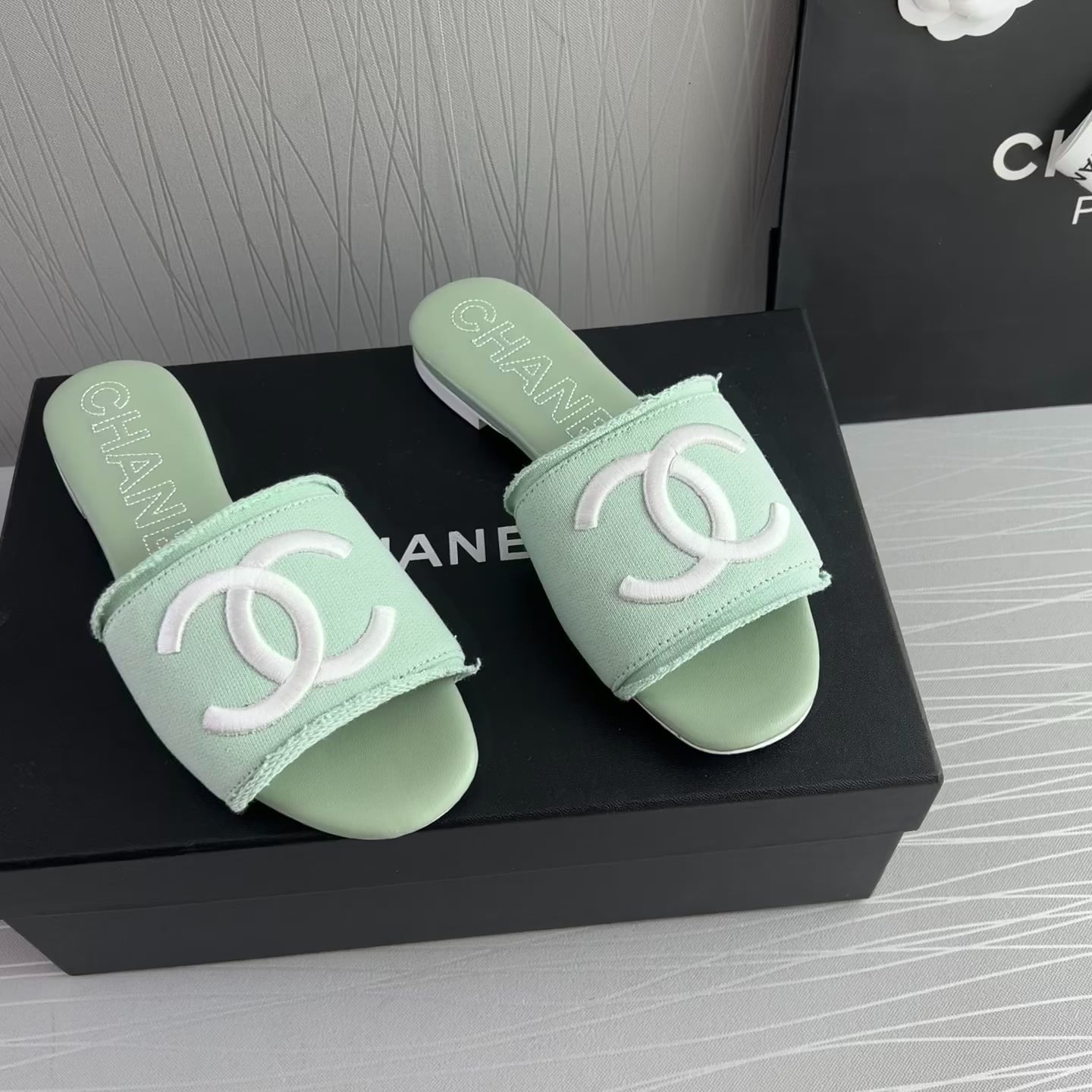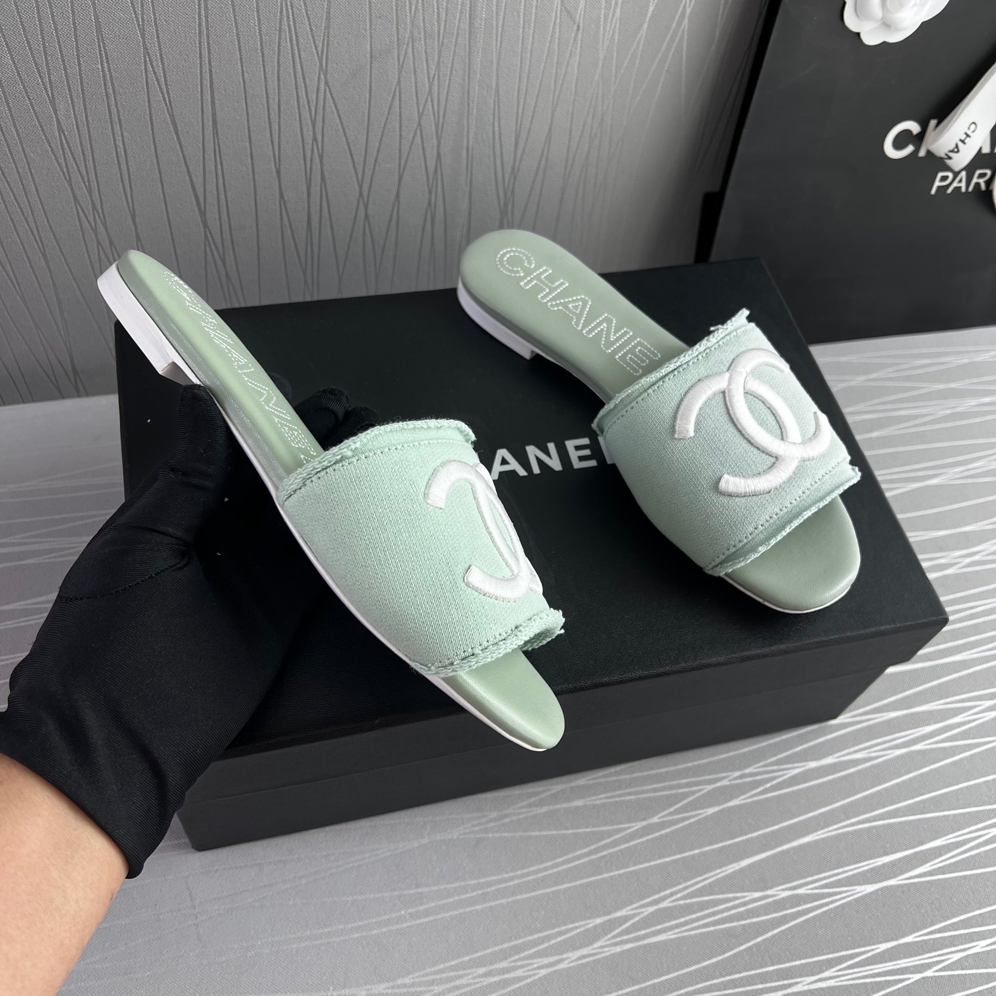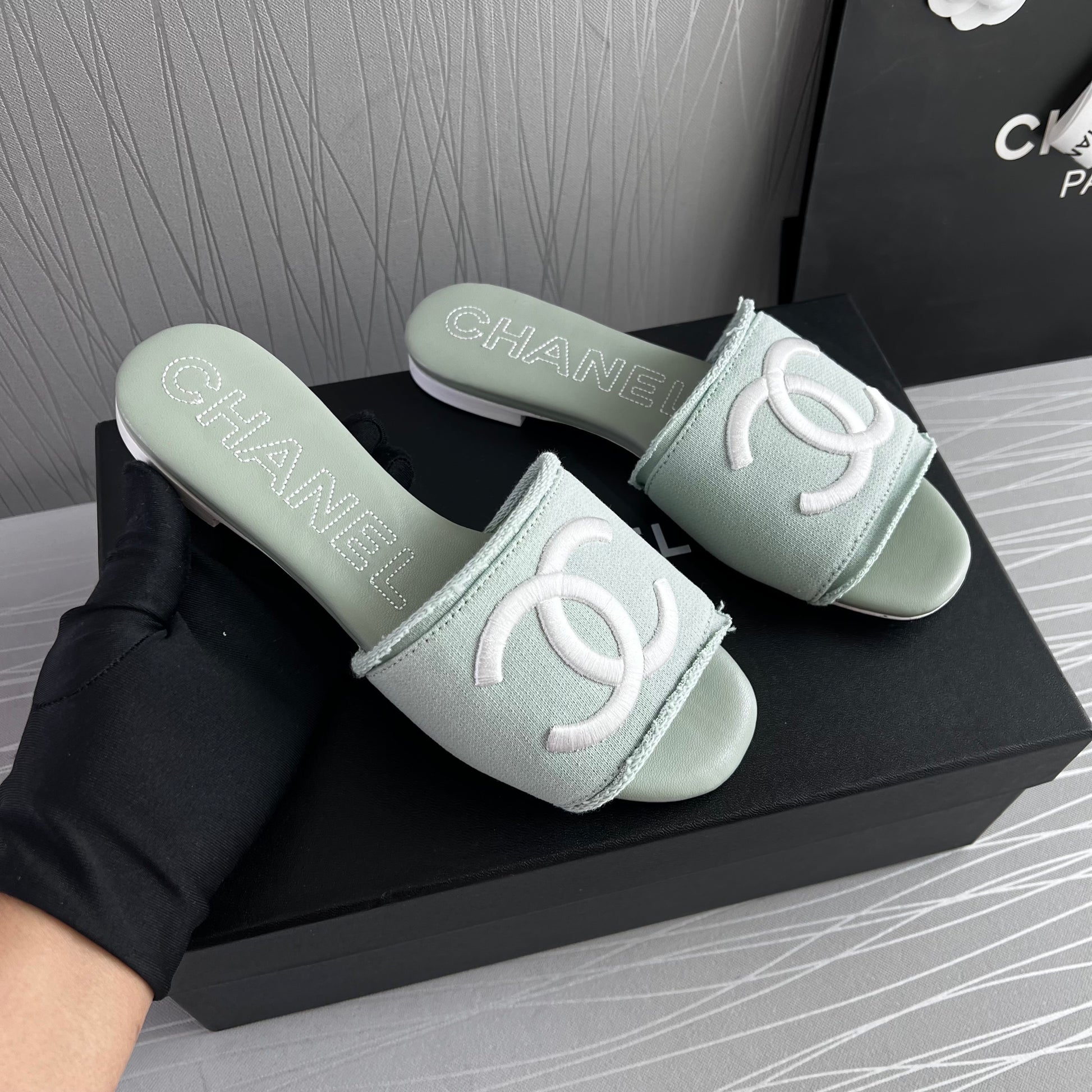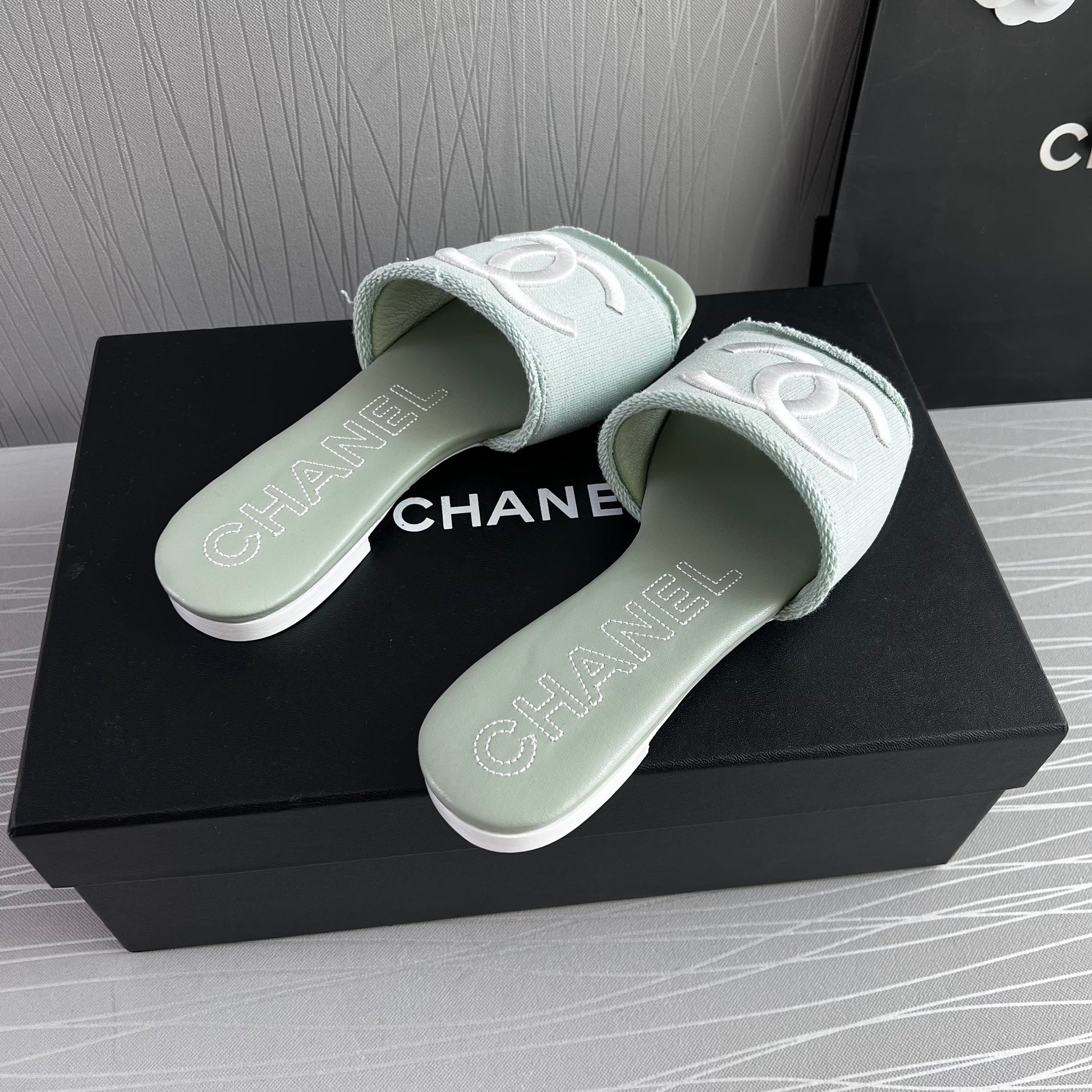 Sandalias C color verde en tela con letras bordadas