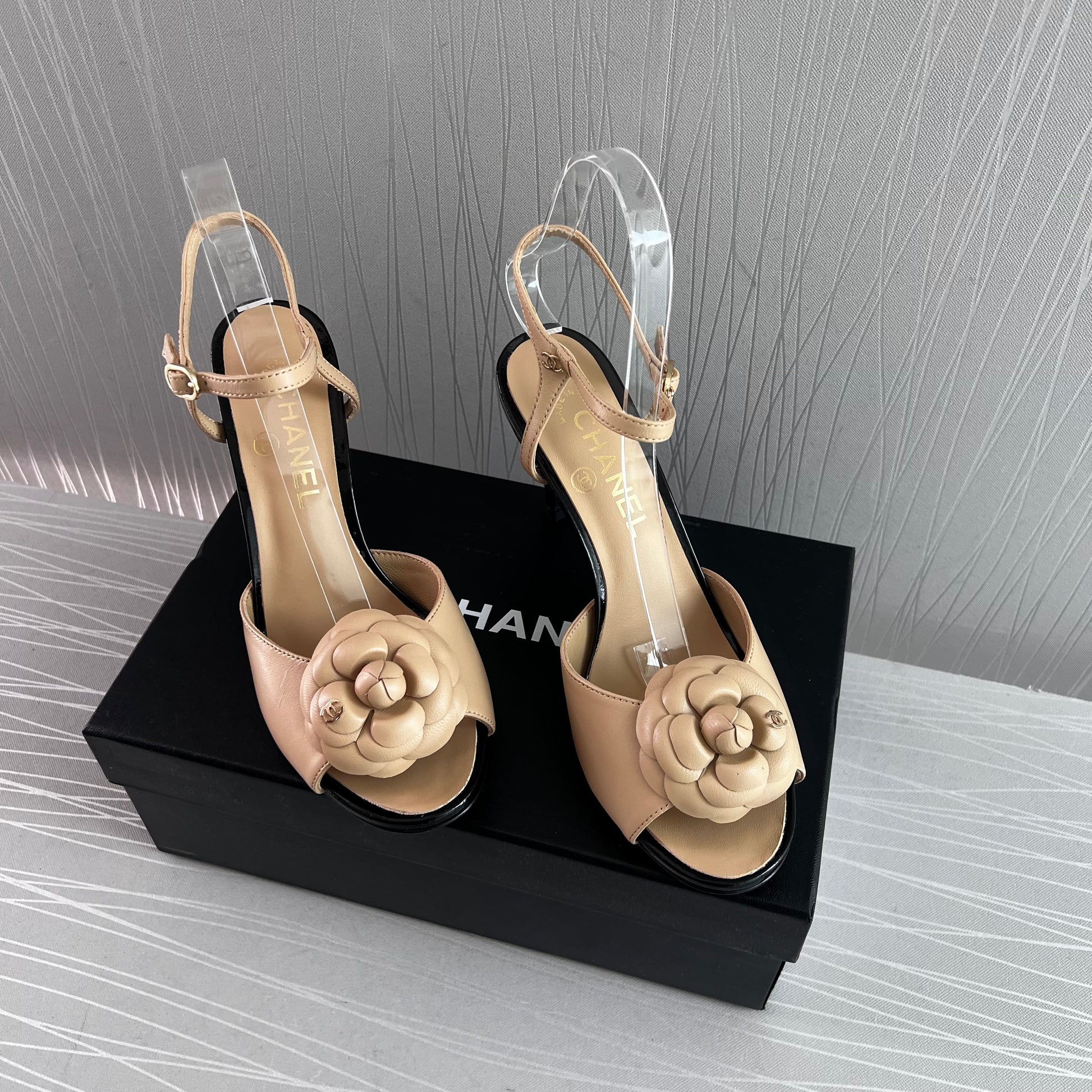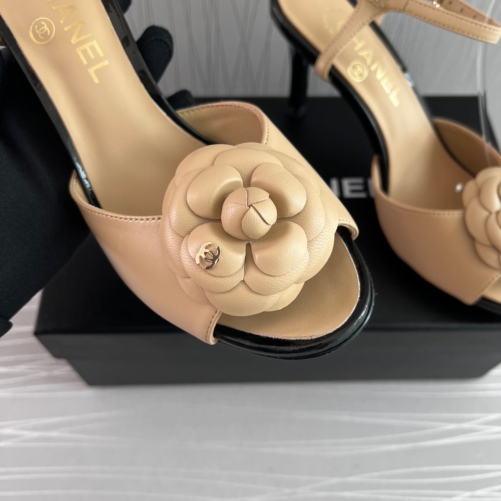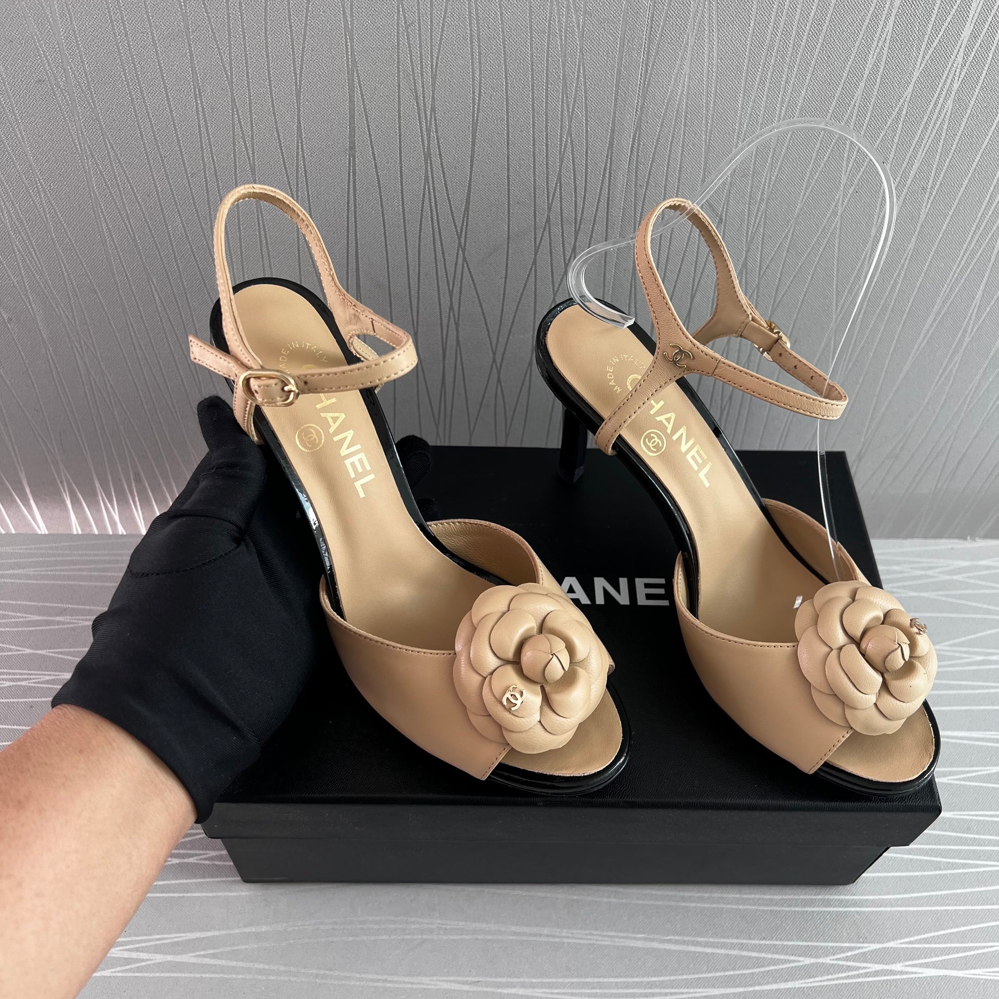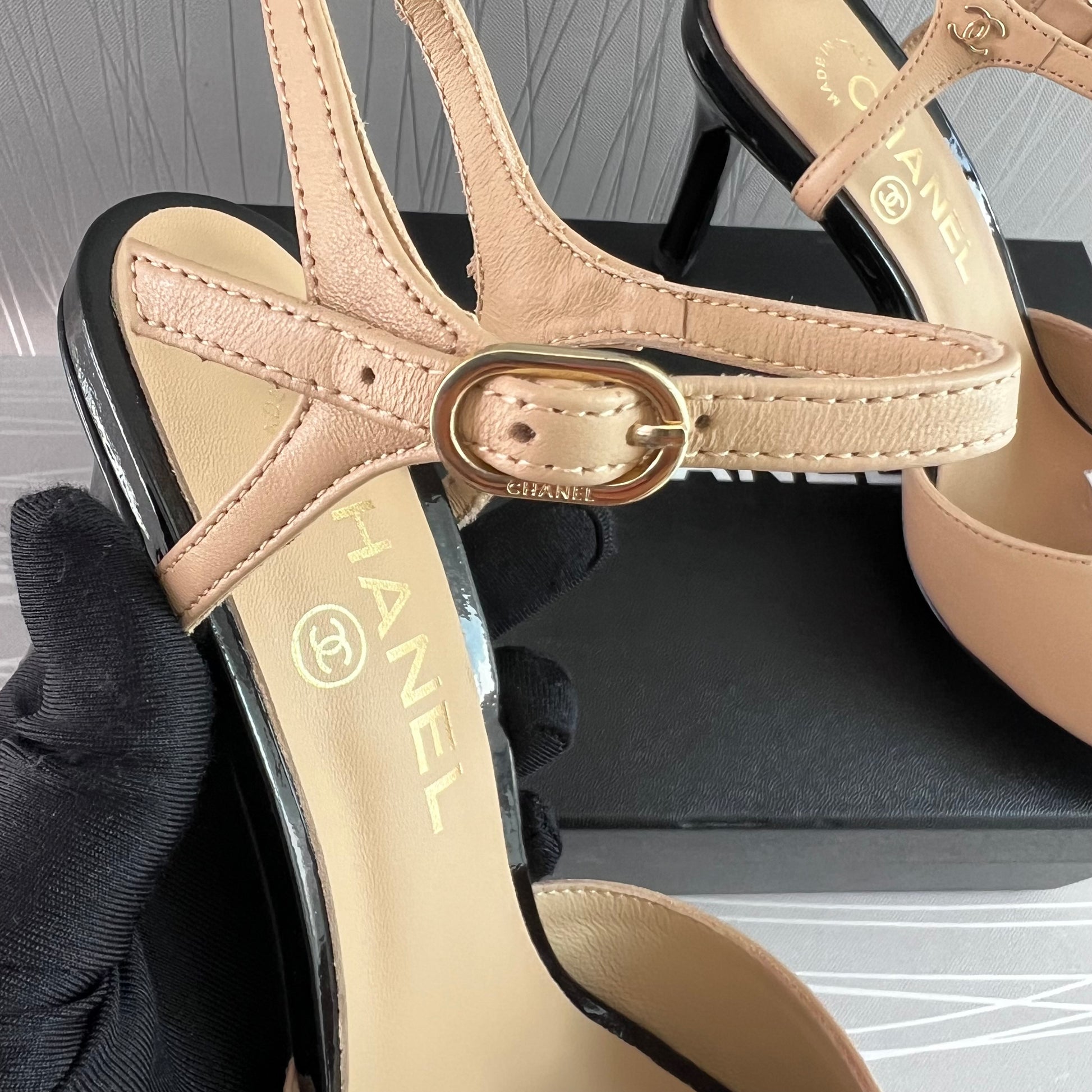 Sandalias en piel color beige combinadas con tacón en negro. Tamaño del tacón 10 cm. Incluye caja y cubrepolvo.