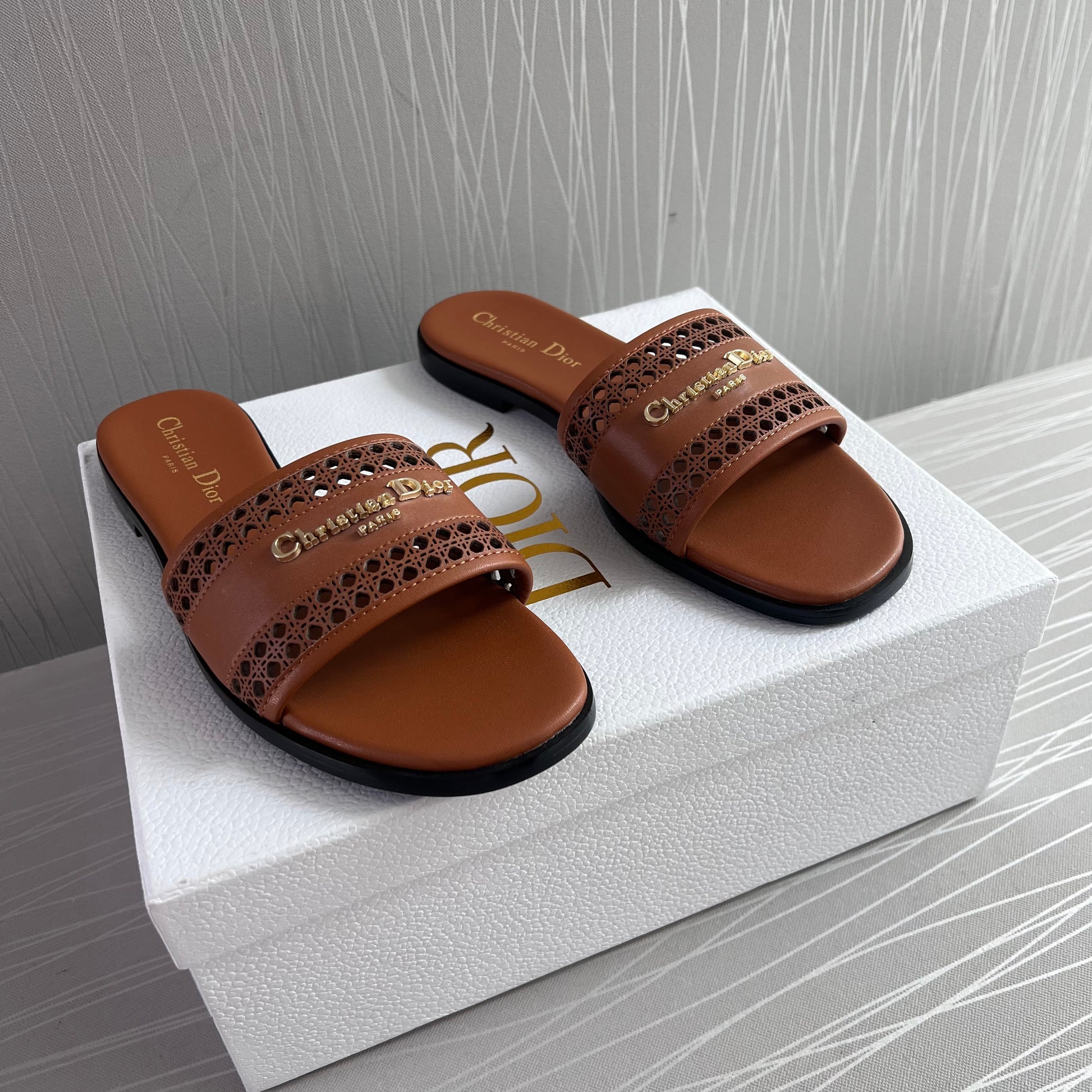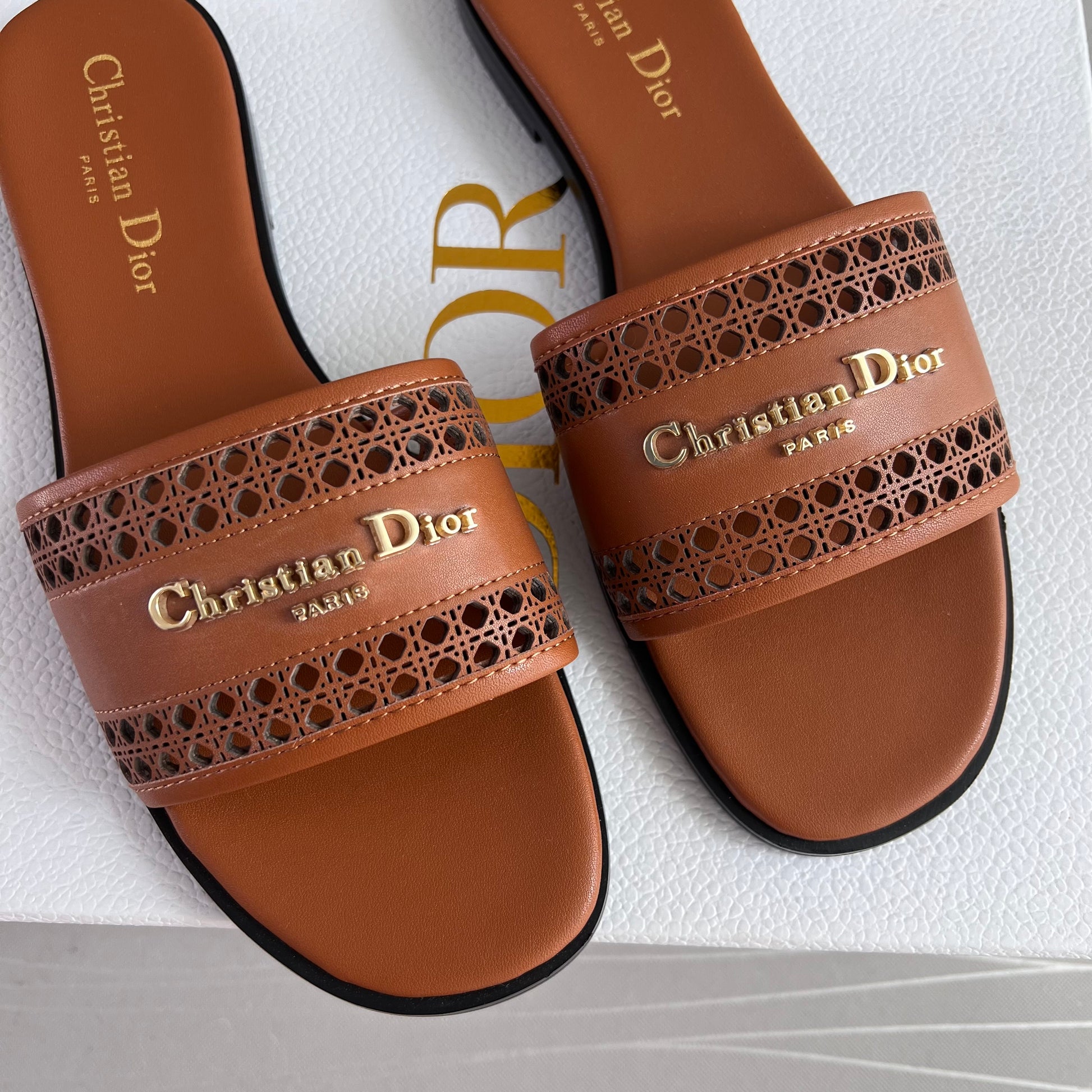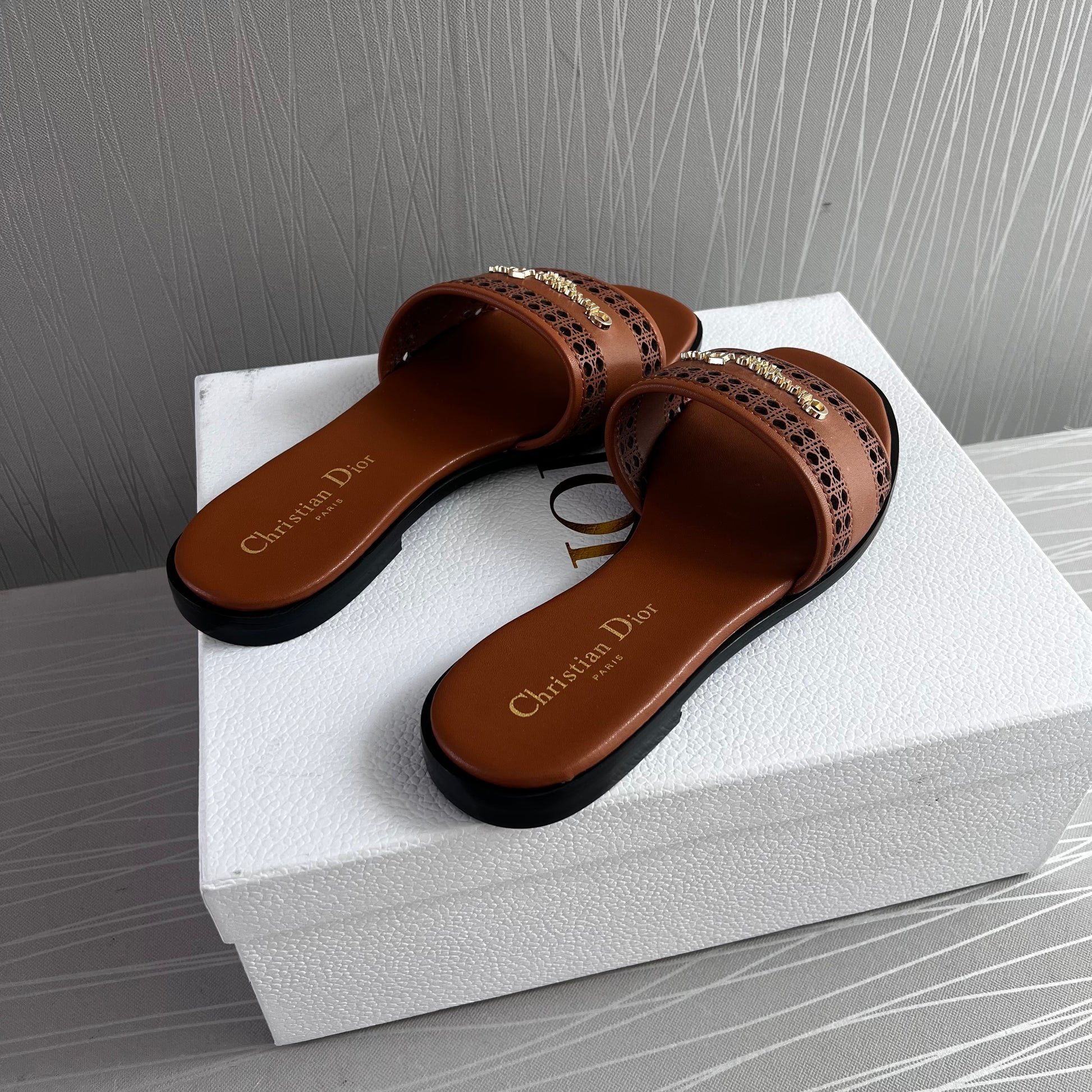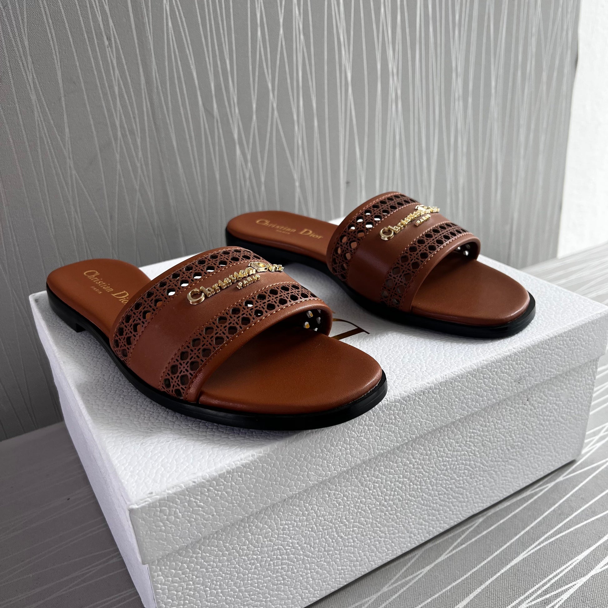 Sandalias D piel color camel con letras doradas. Incluye caja y guardapolvo.