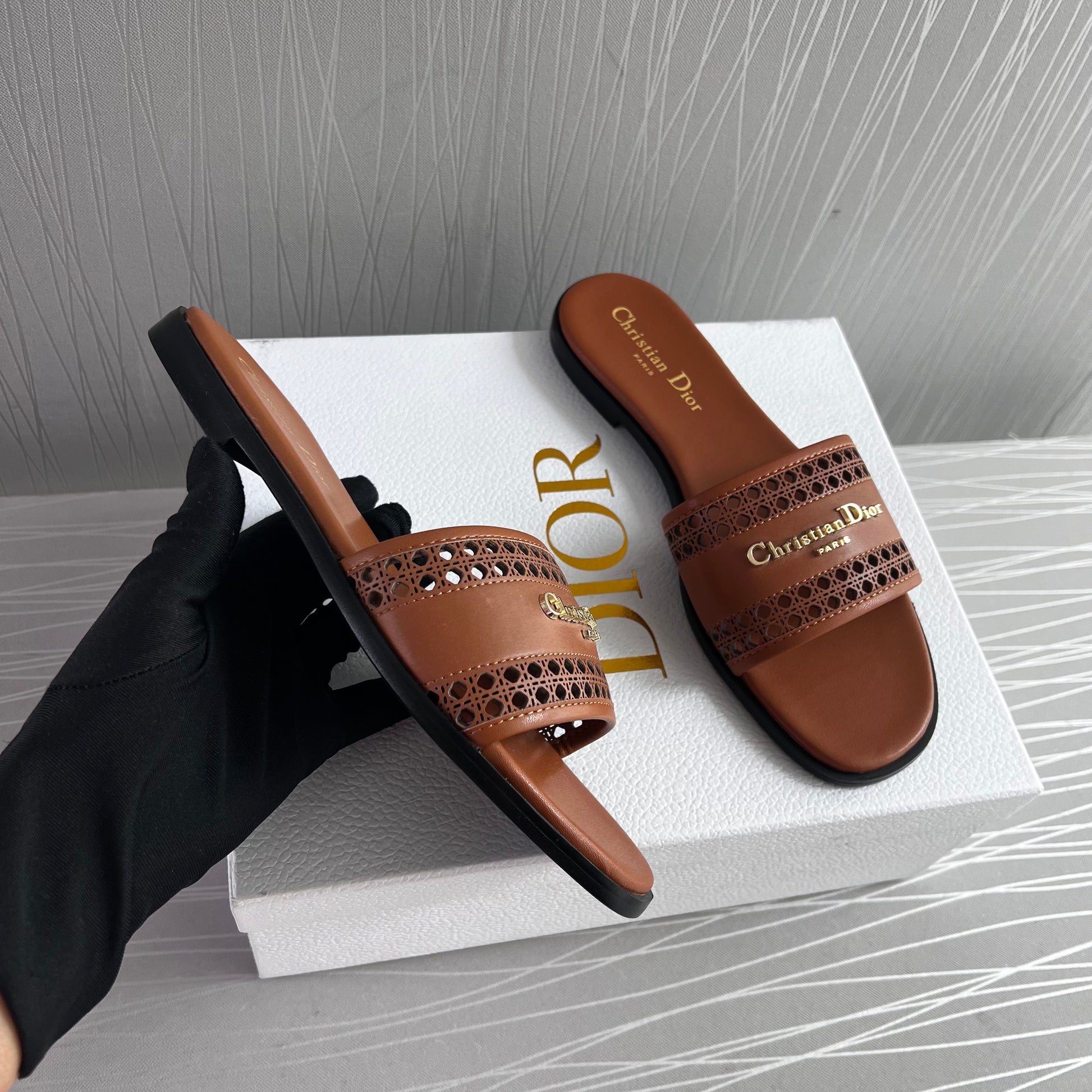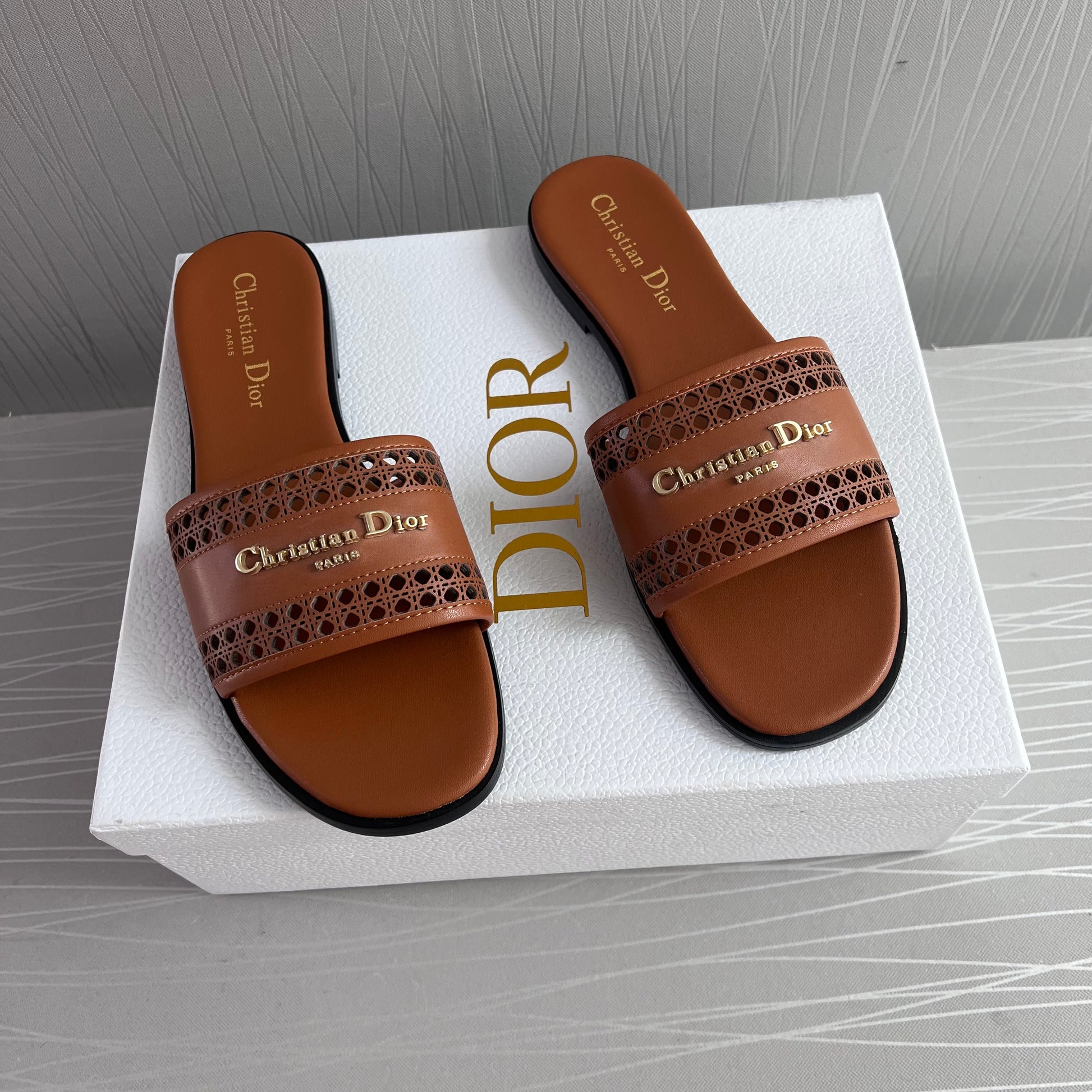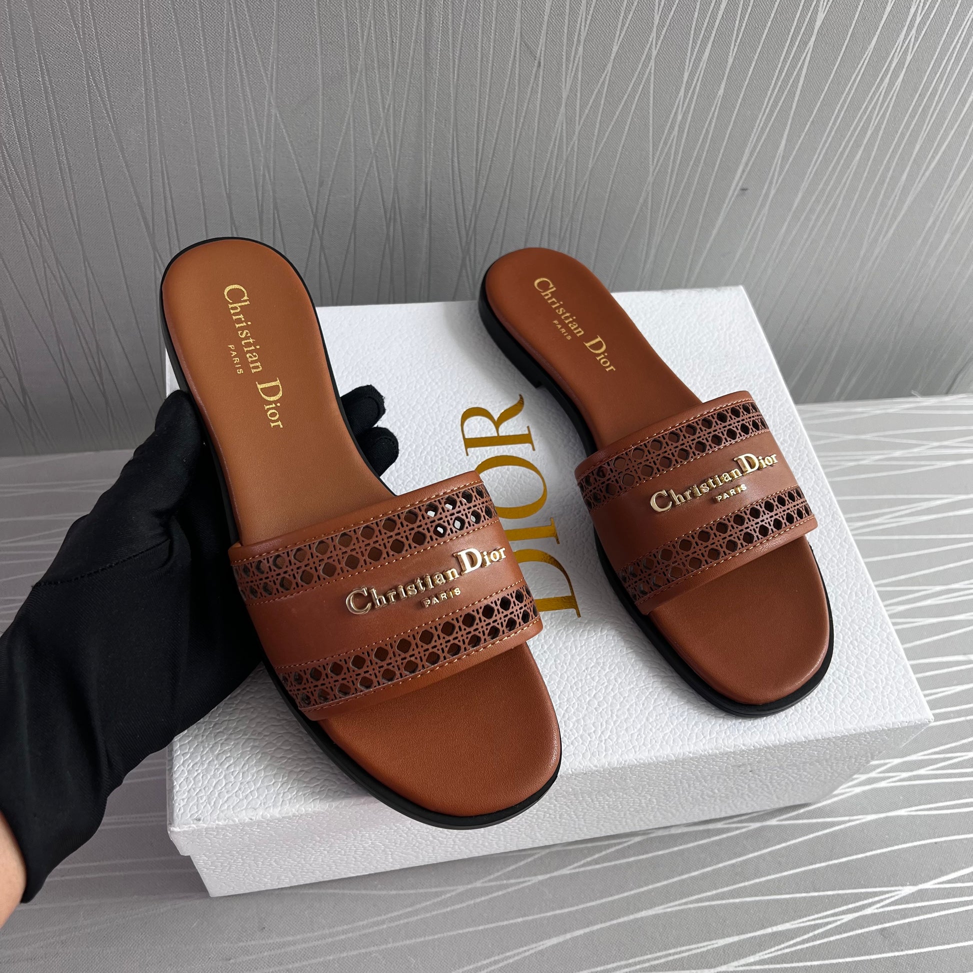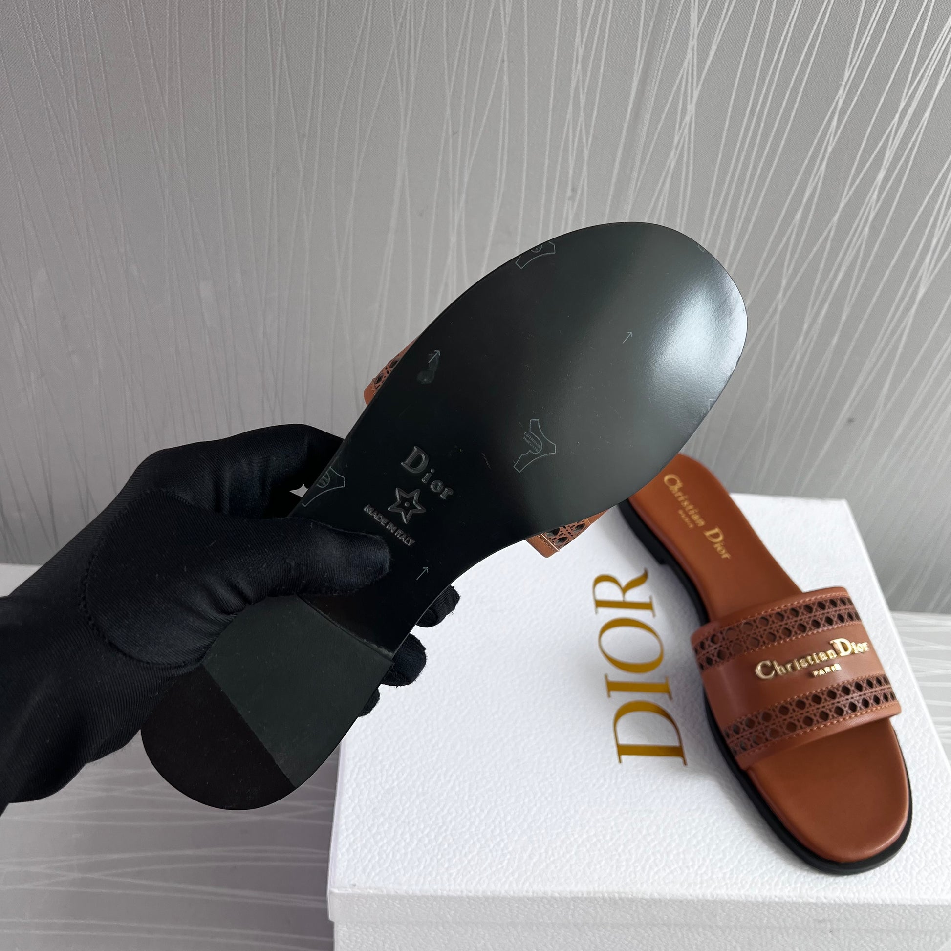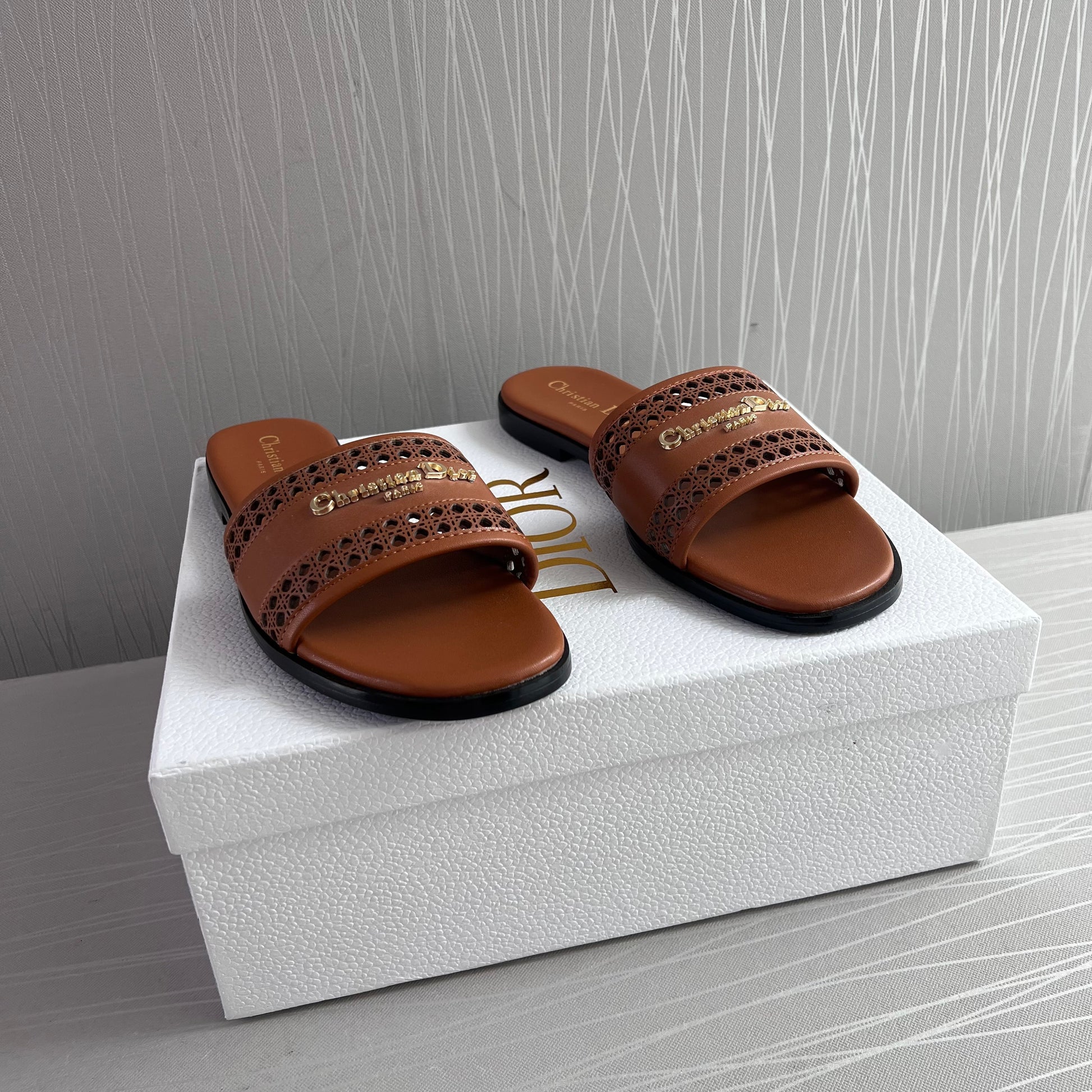 Sandalias D piel color camel con letras doradas. Incluye caja y guardapolvo.