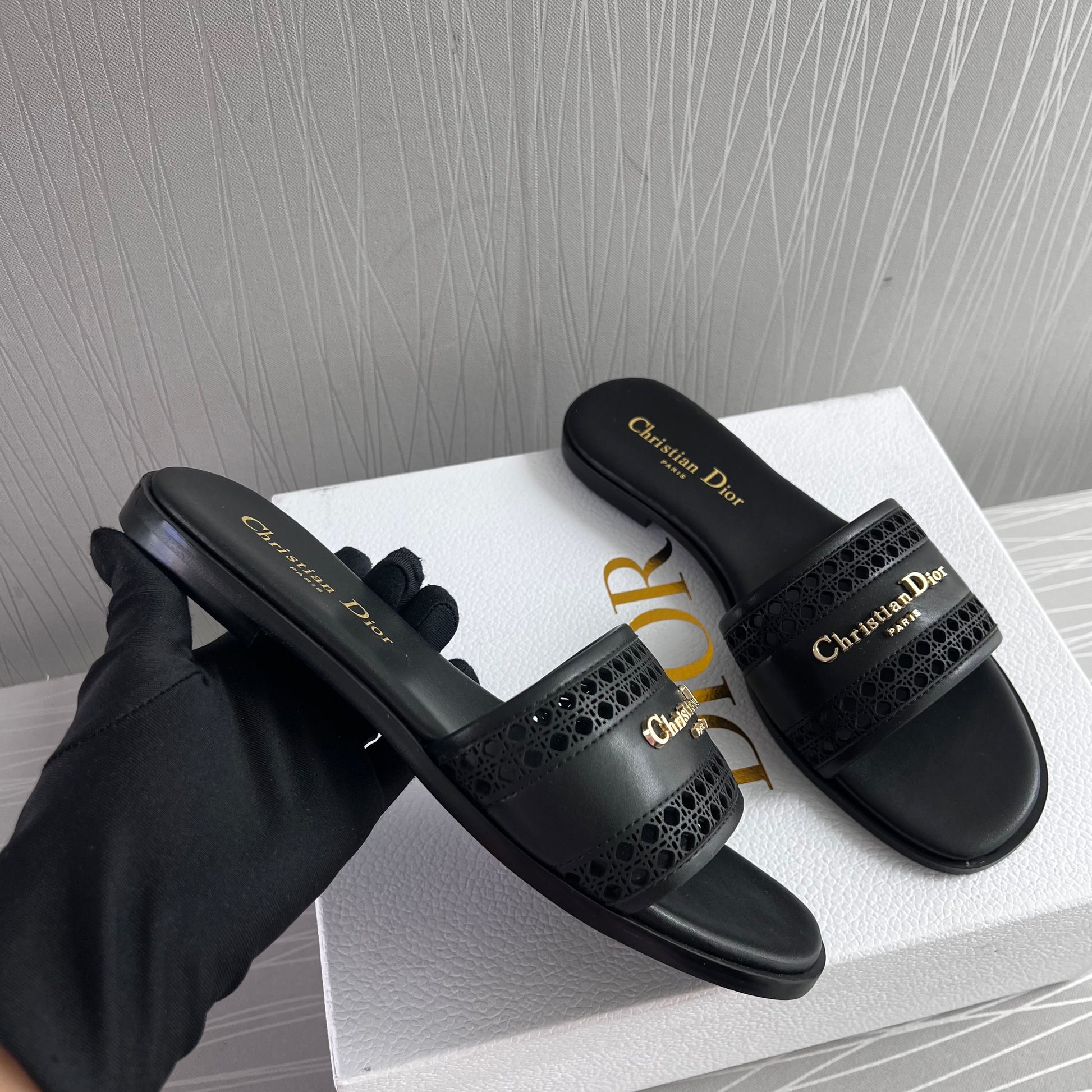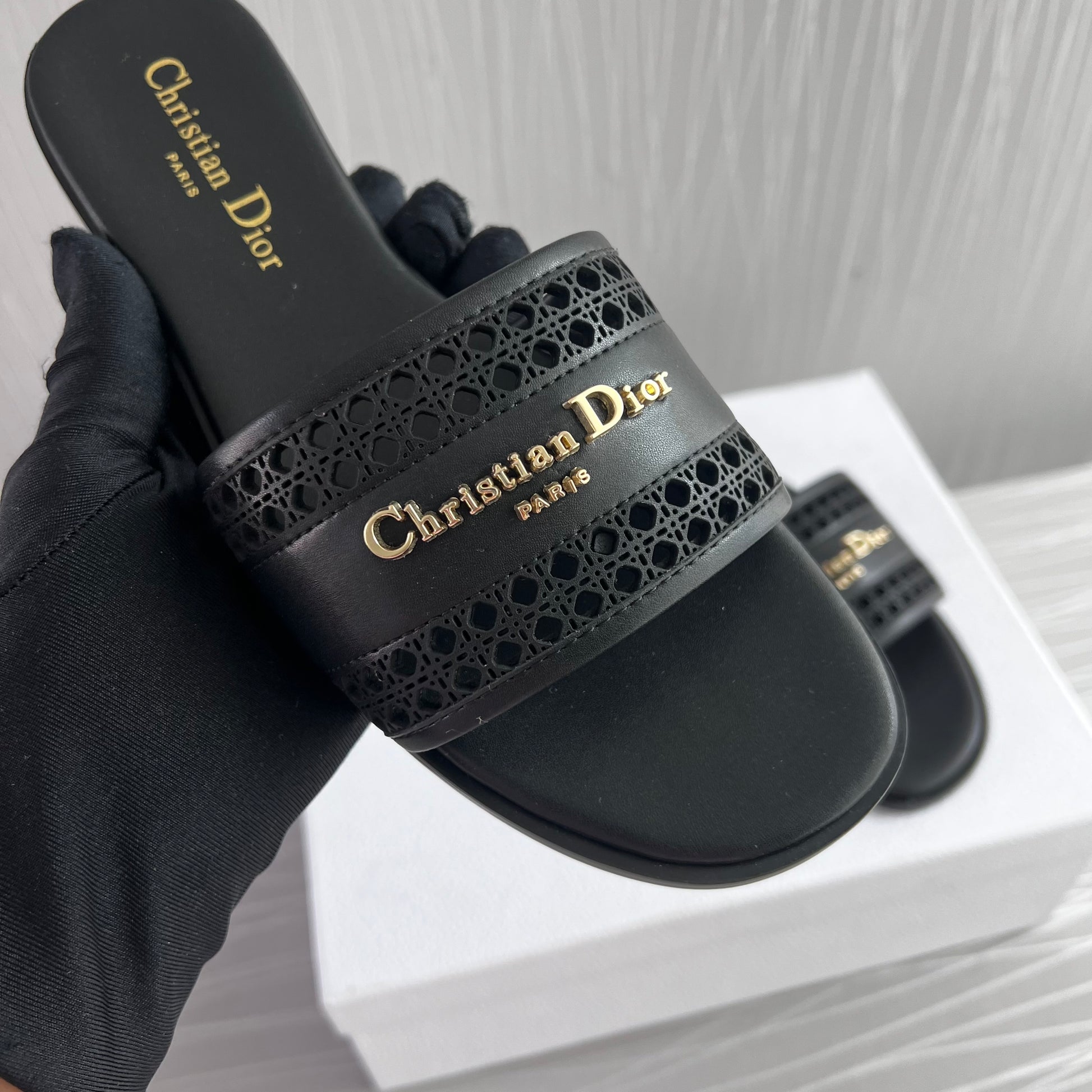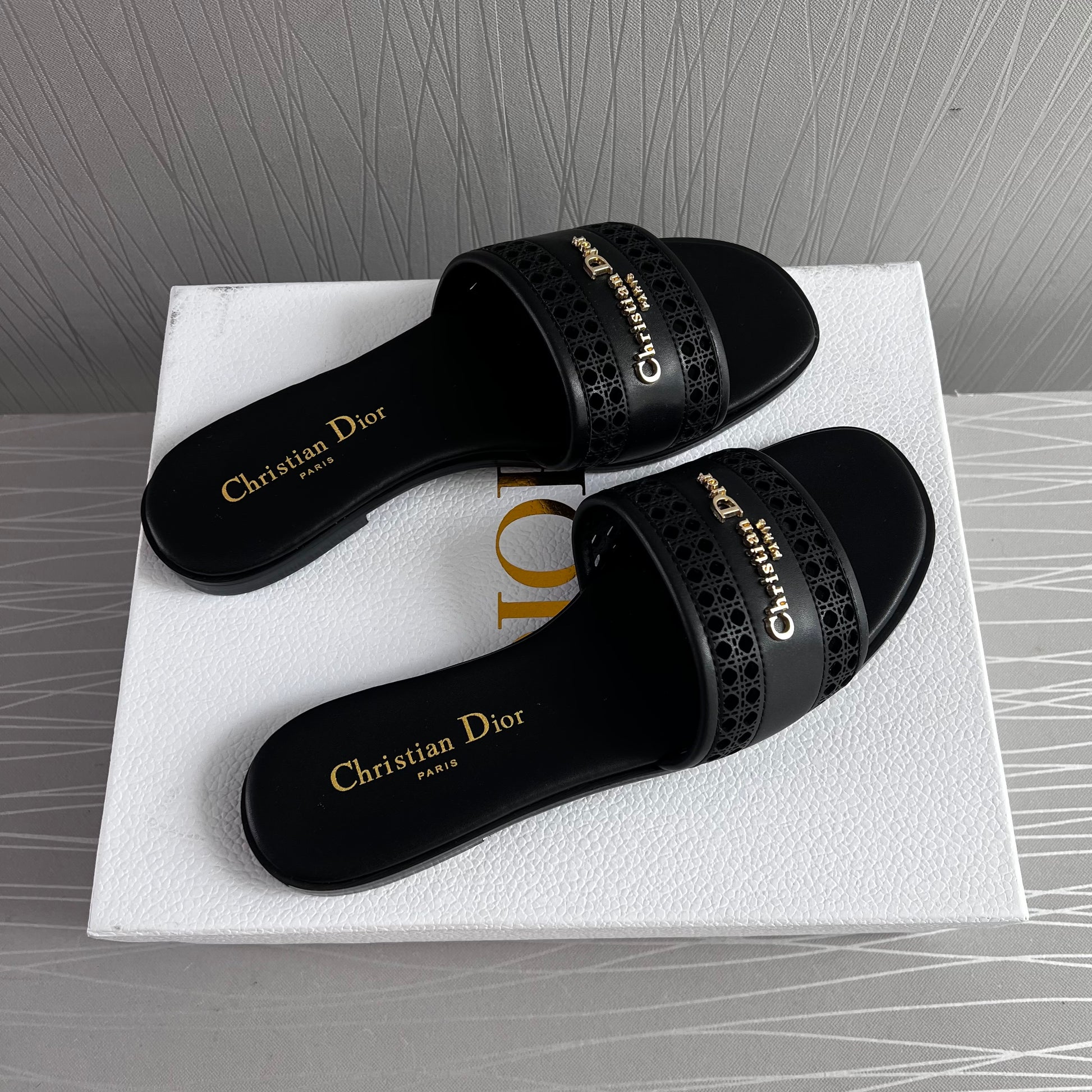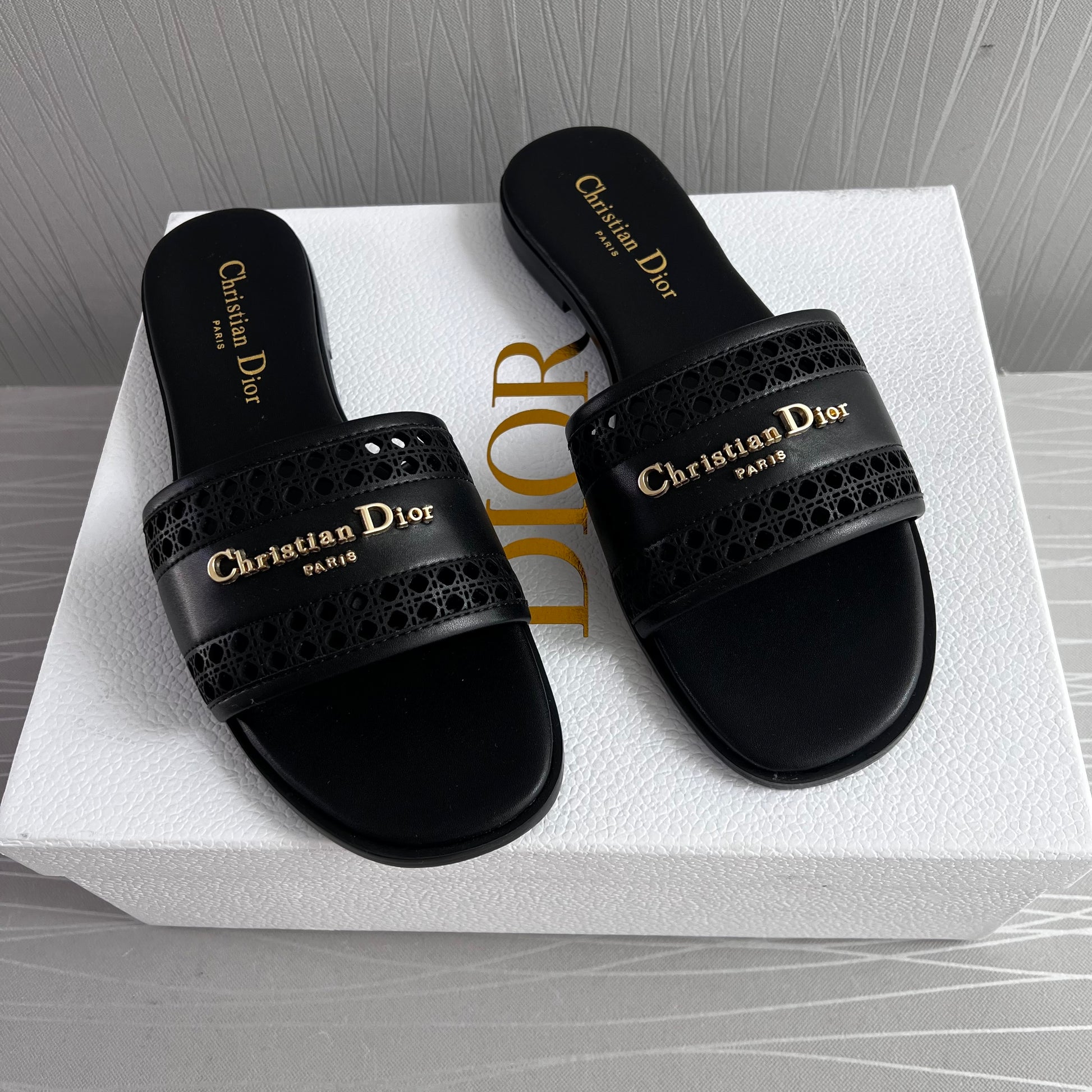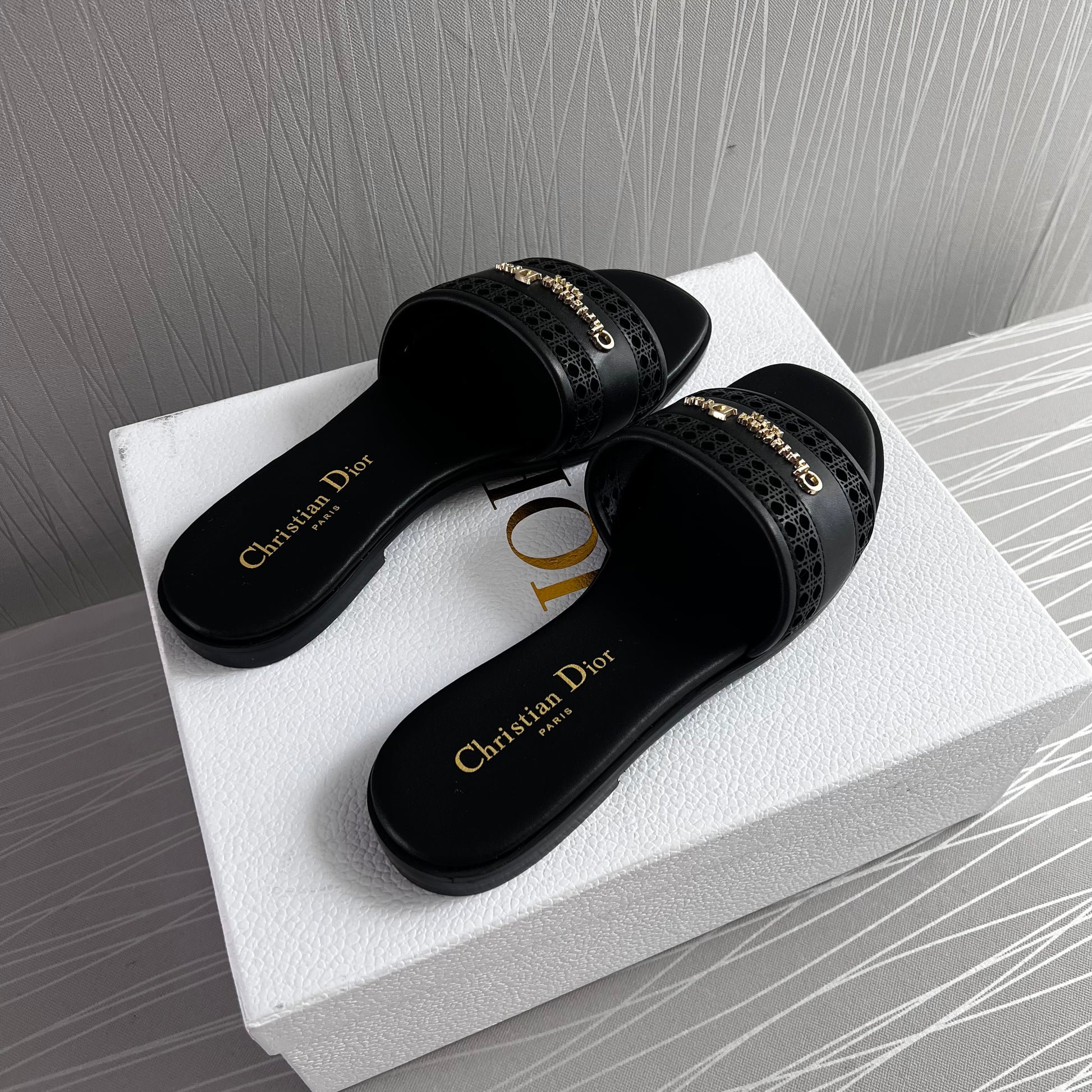 Sandalias D piel color negro con letras doradas. Incluye caja, guardapolvo.