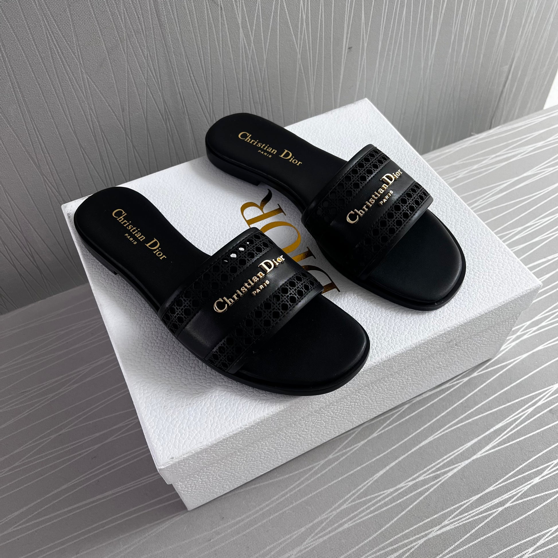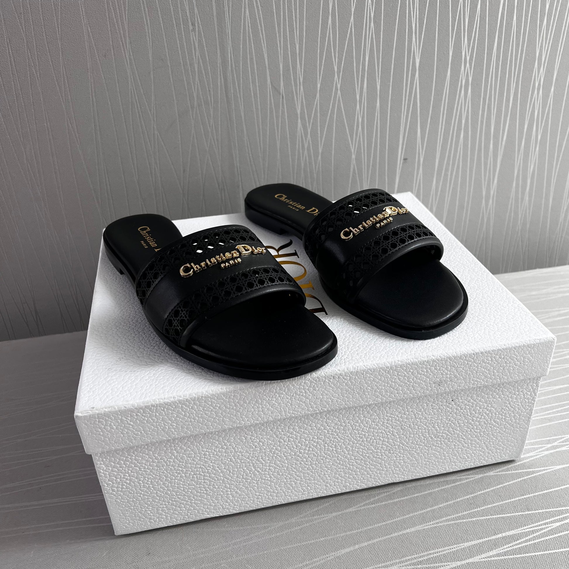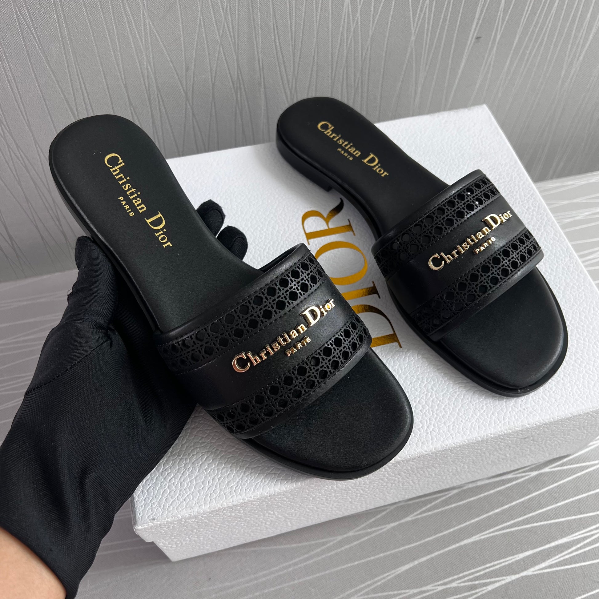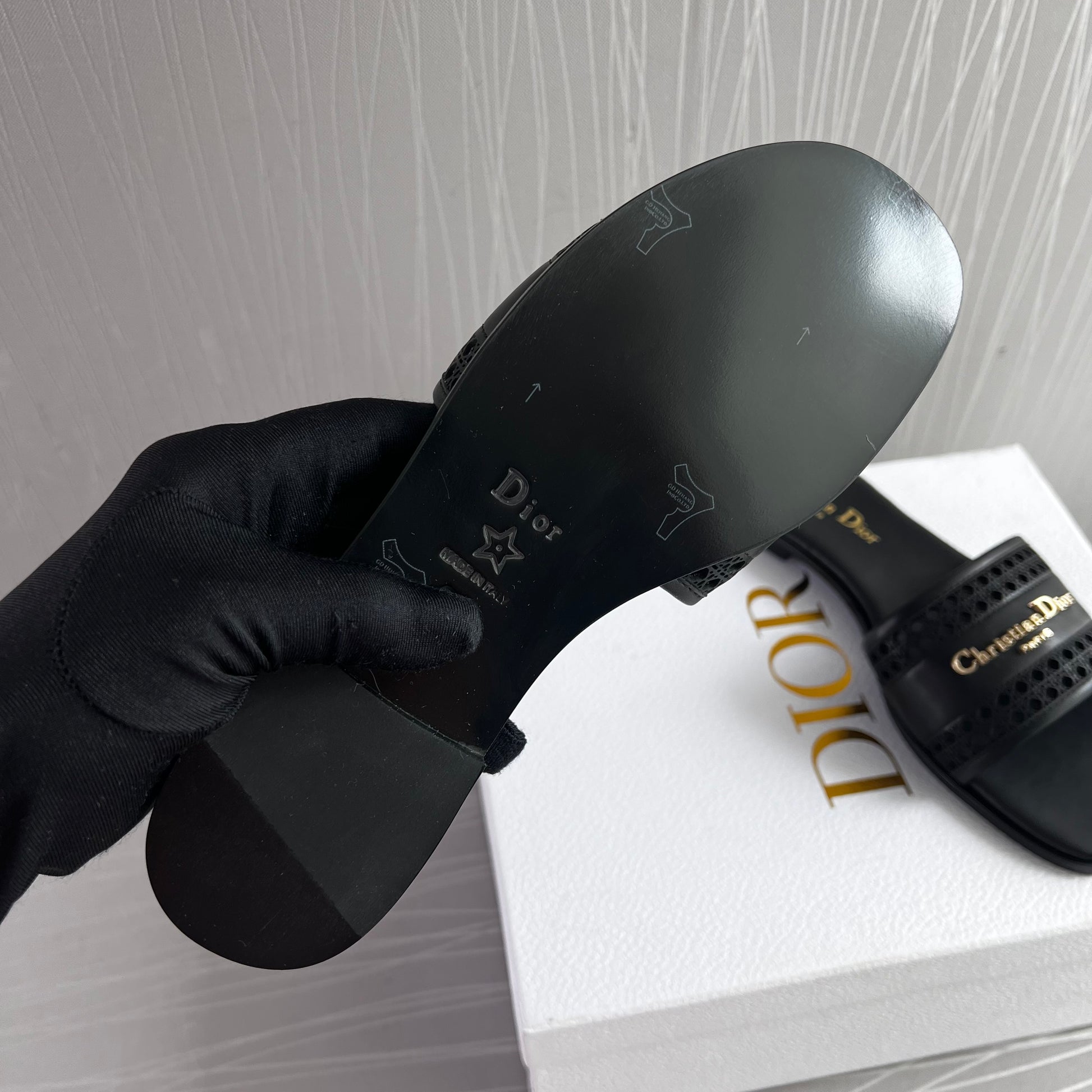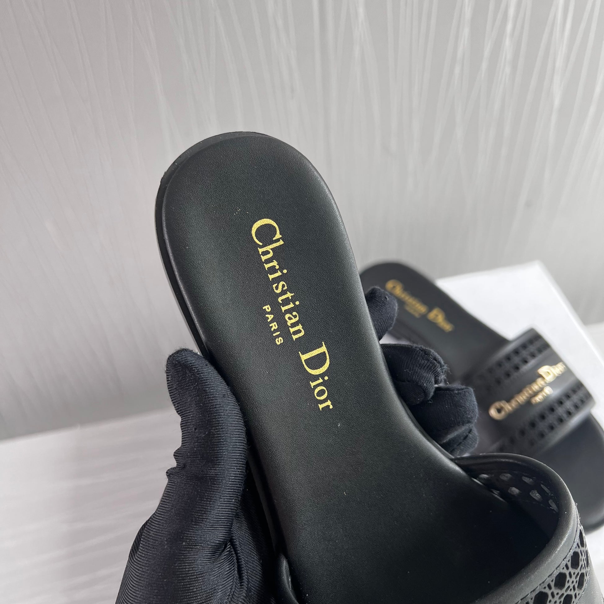 Sandalias D piel color negro con letras doradas. Incluye caja, guardapolvo.