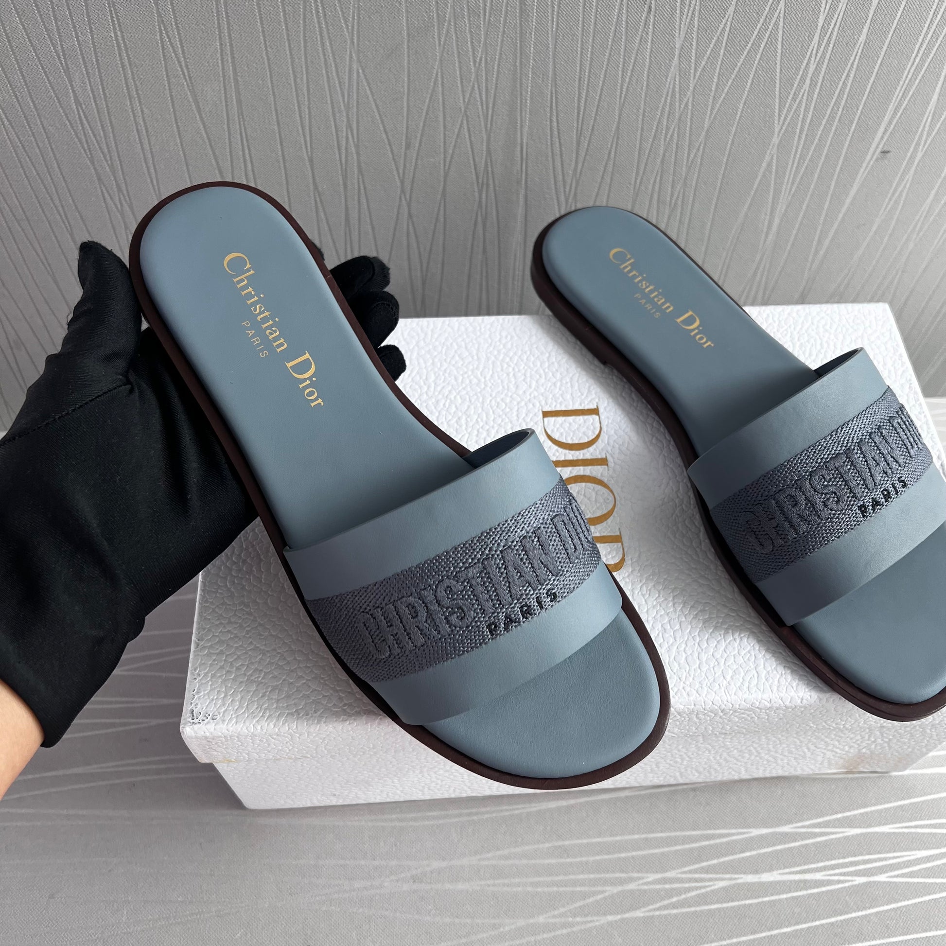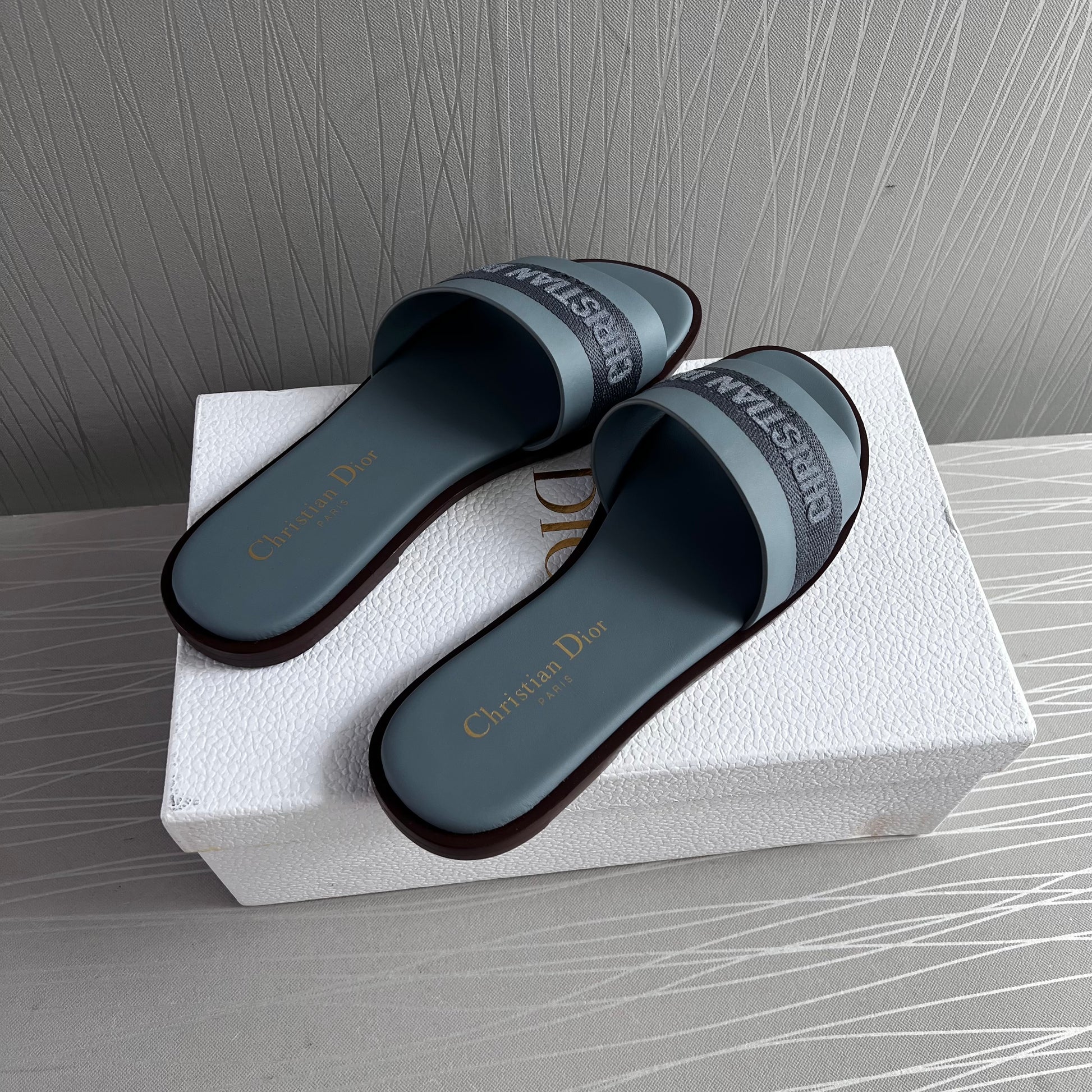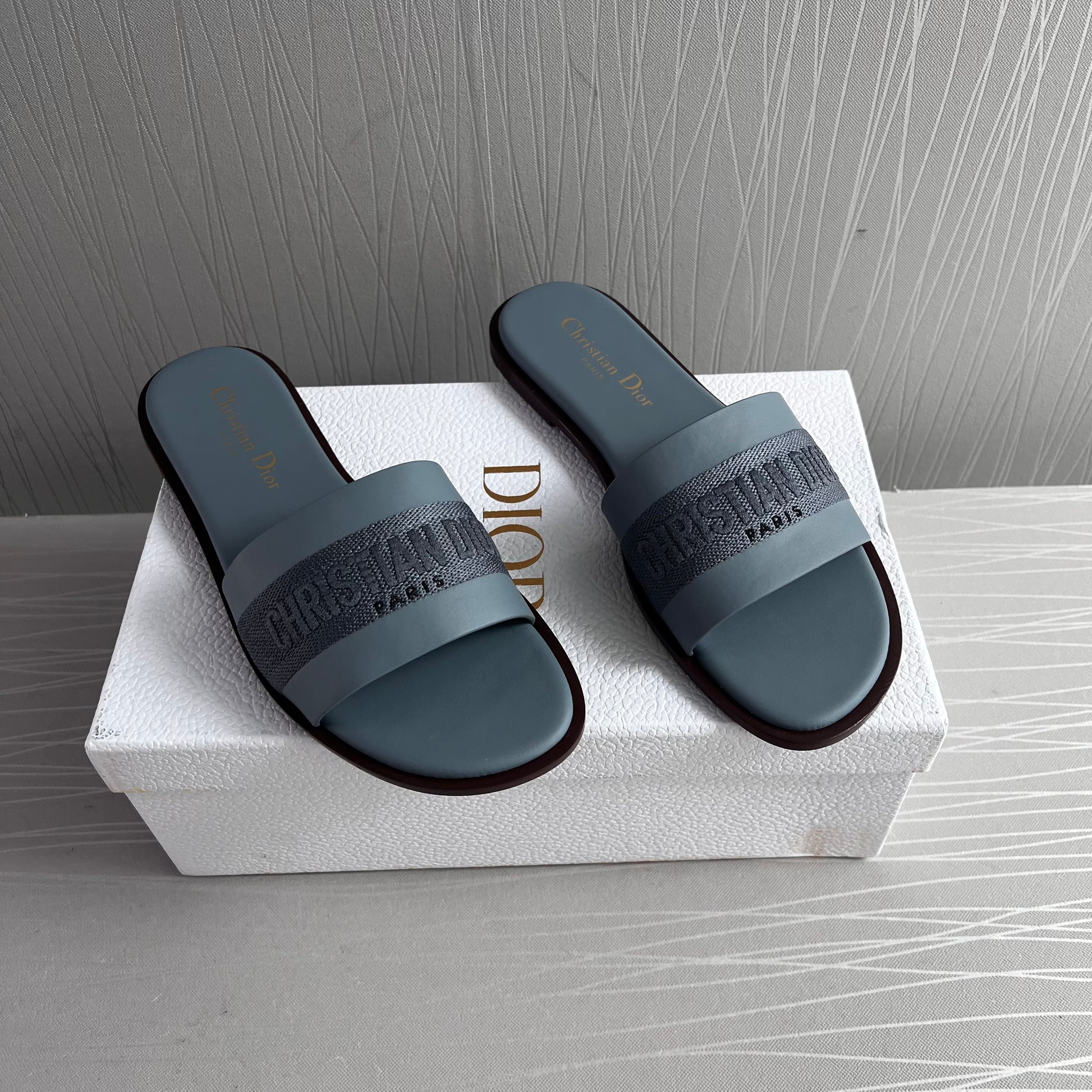 Sandalias D piel y algodón bordado color azul. Incluye caja, guardapolvo.