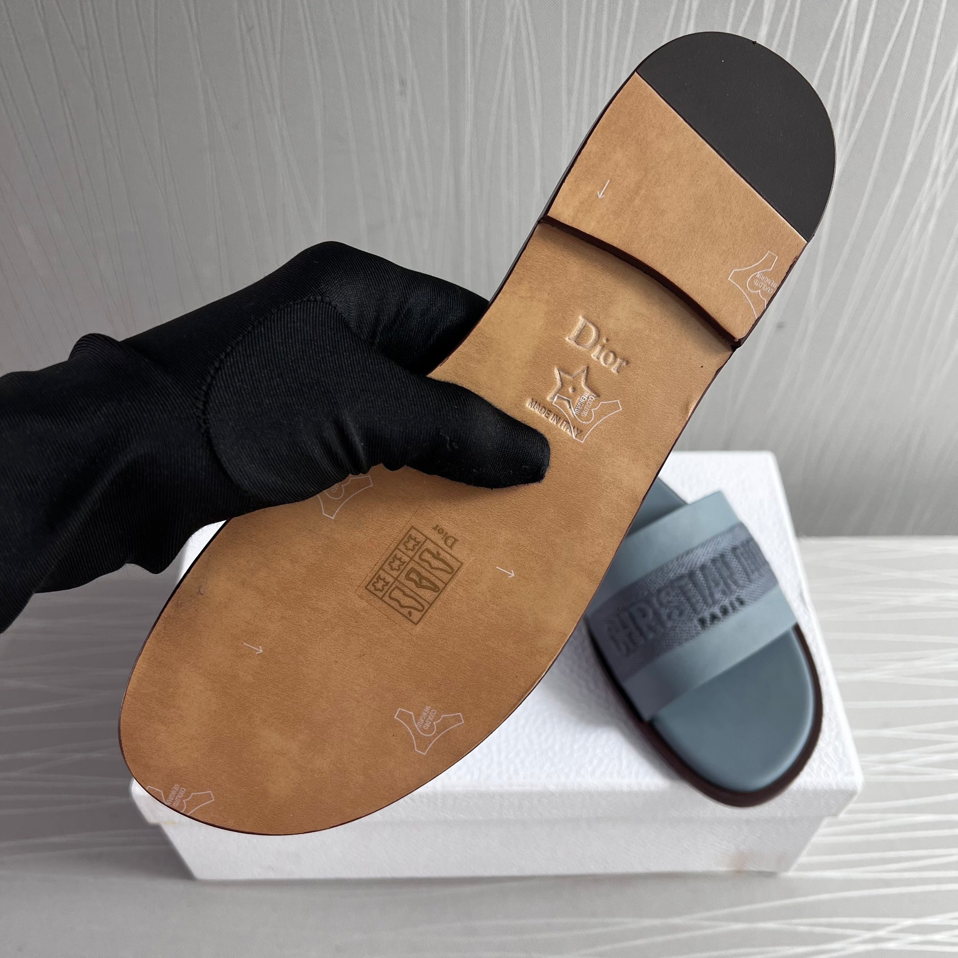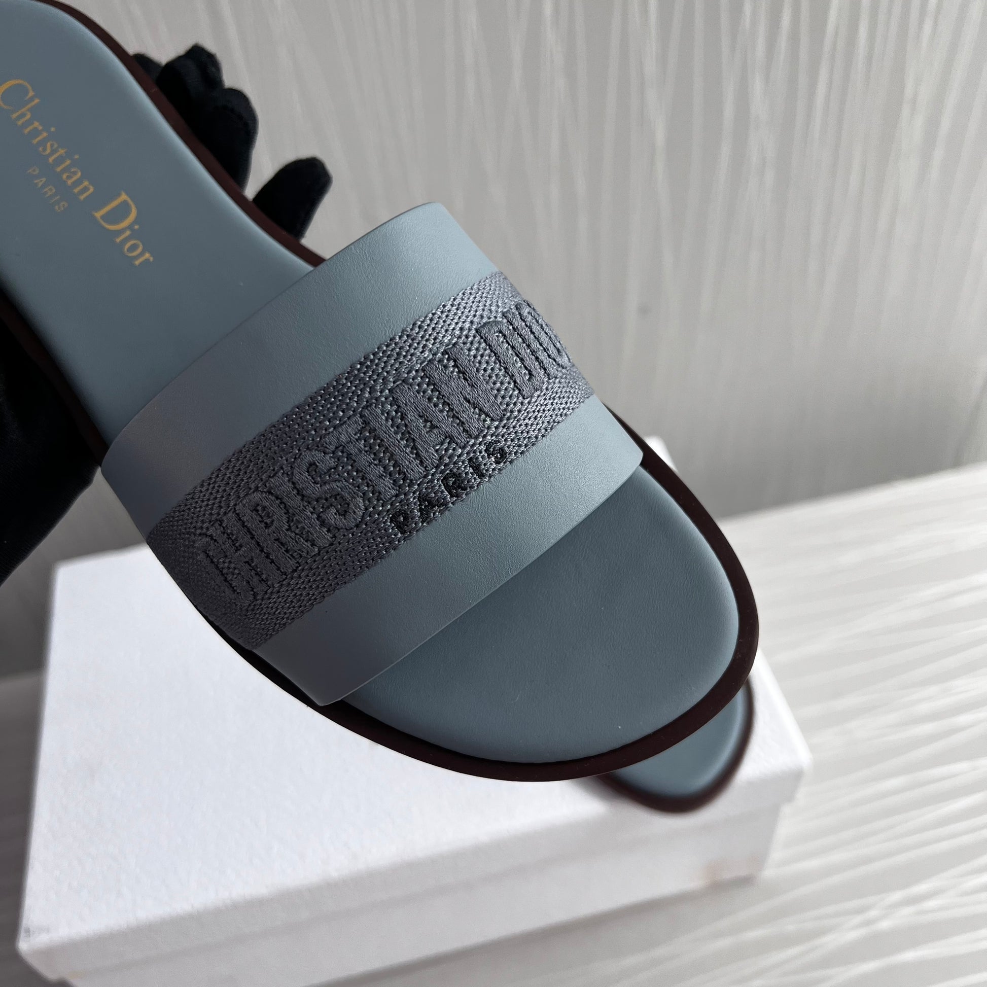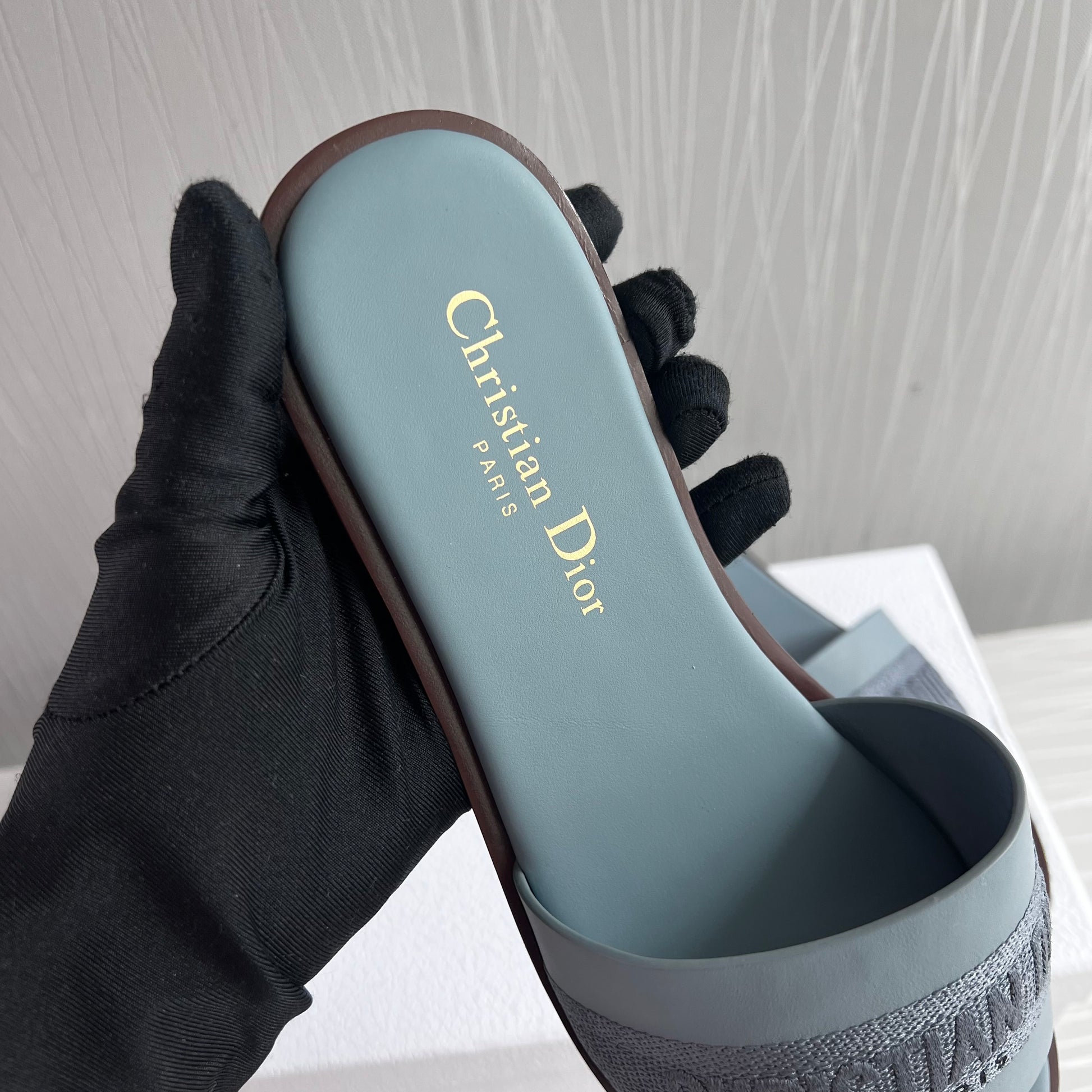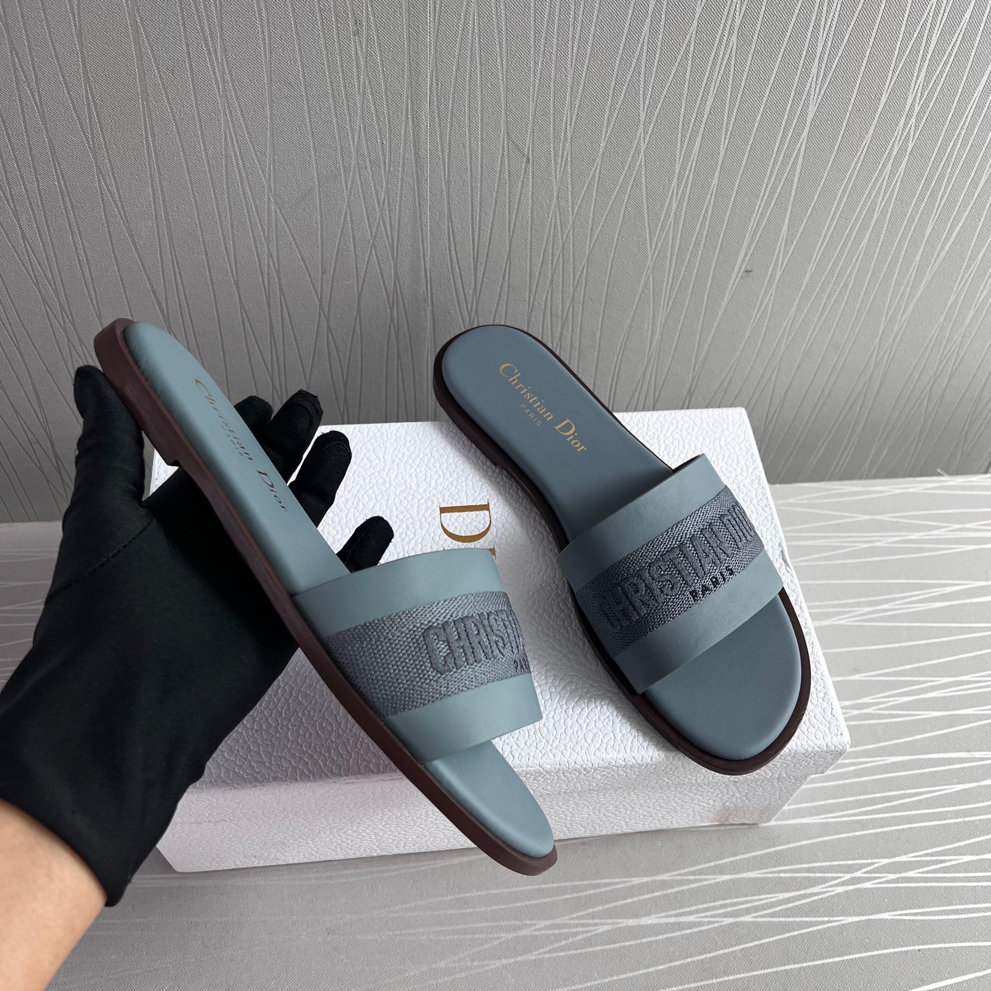 Sandalias D piel y algodón bordado color azul. Incluye caja, guardapolvo.