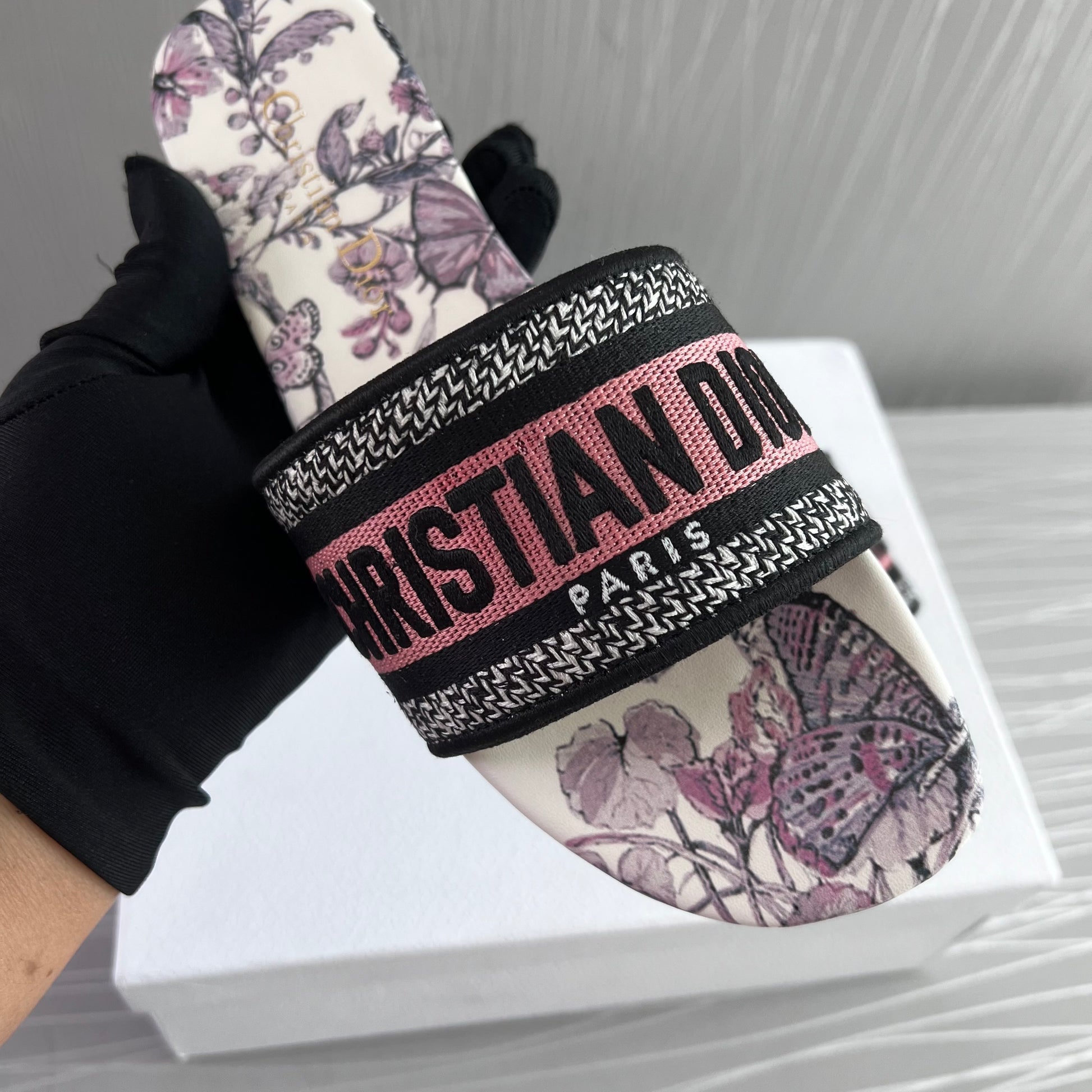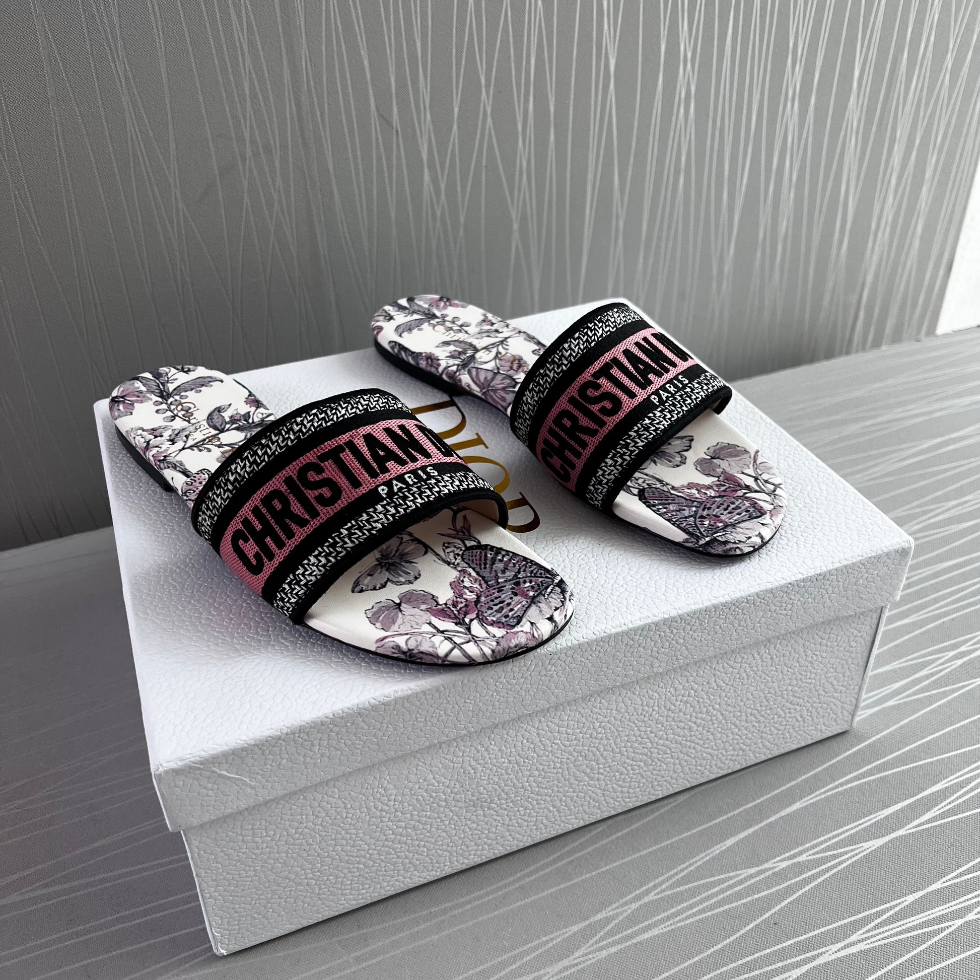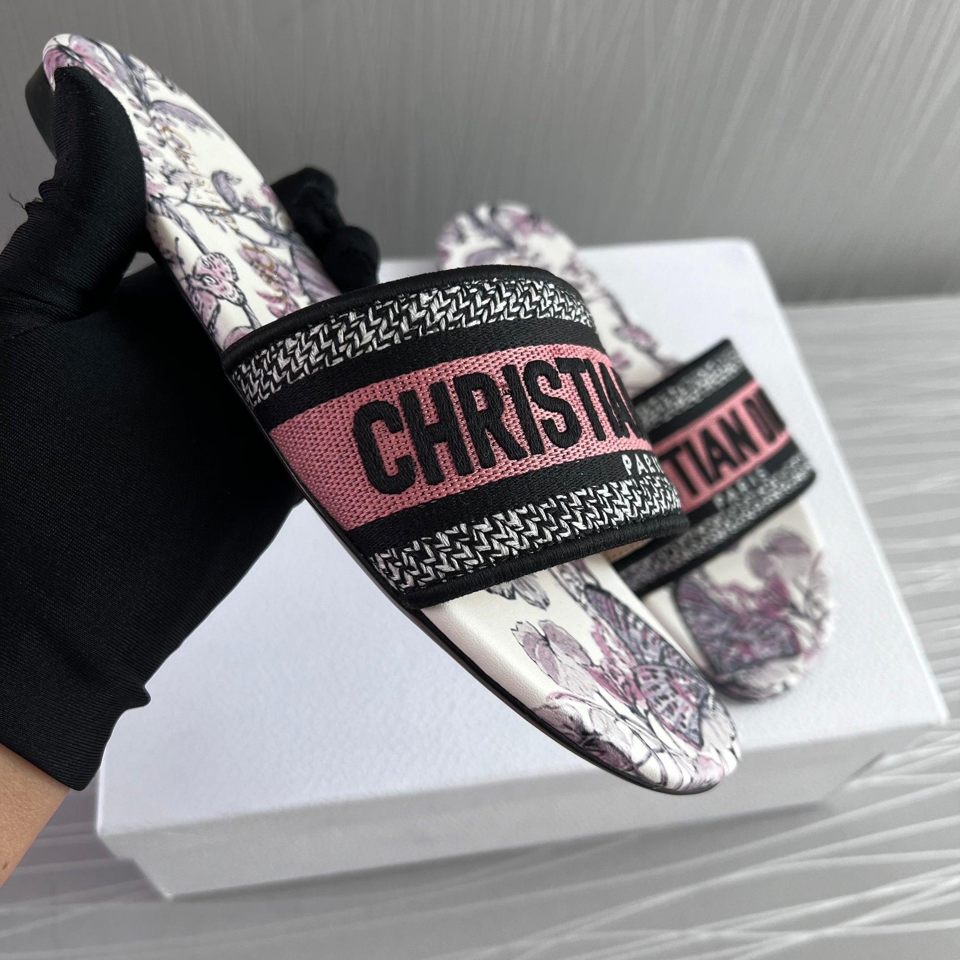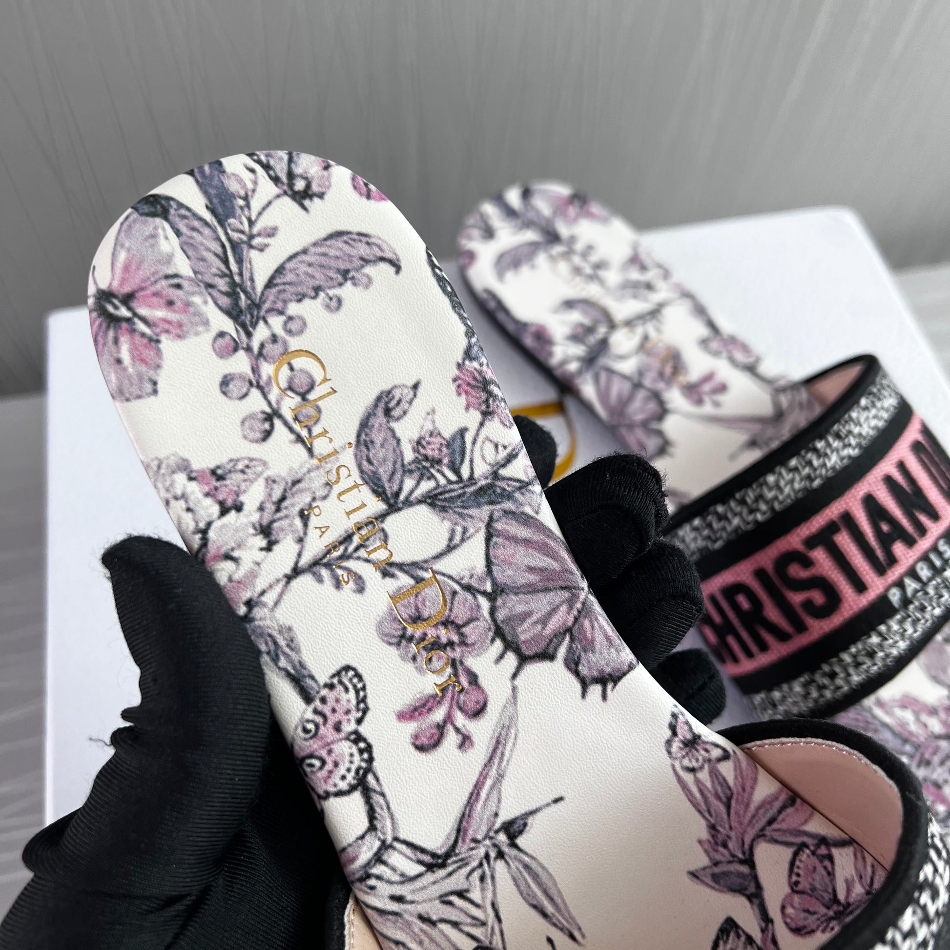Sandalias en tela bordada en color rosa con flores color lila, incluye caja.