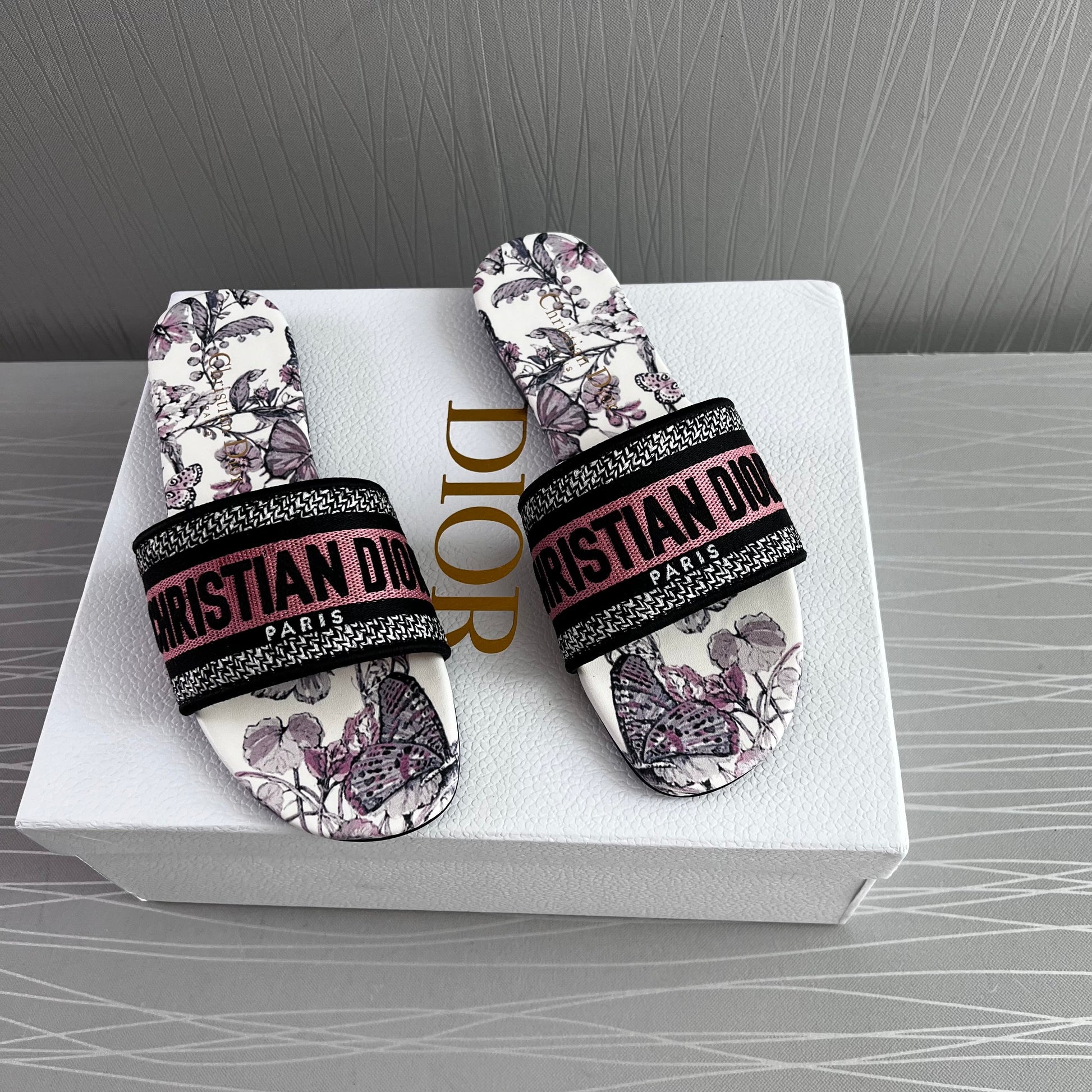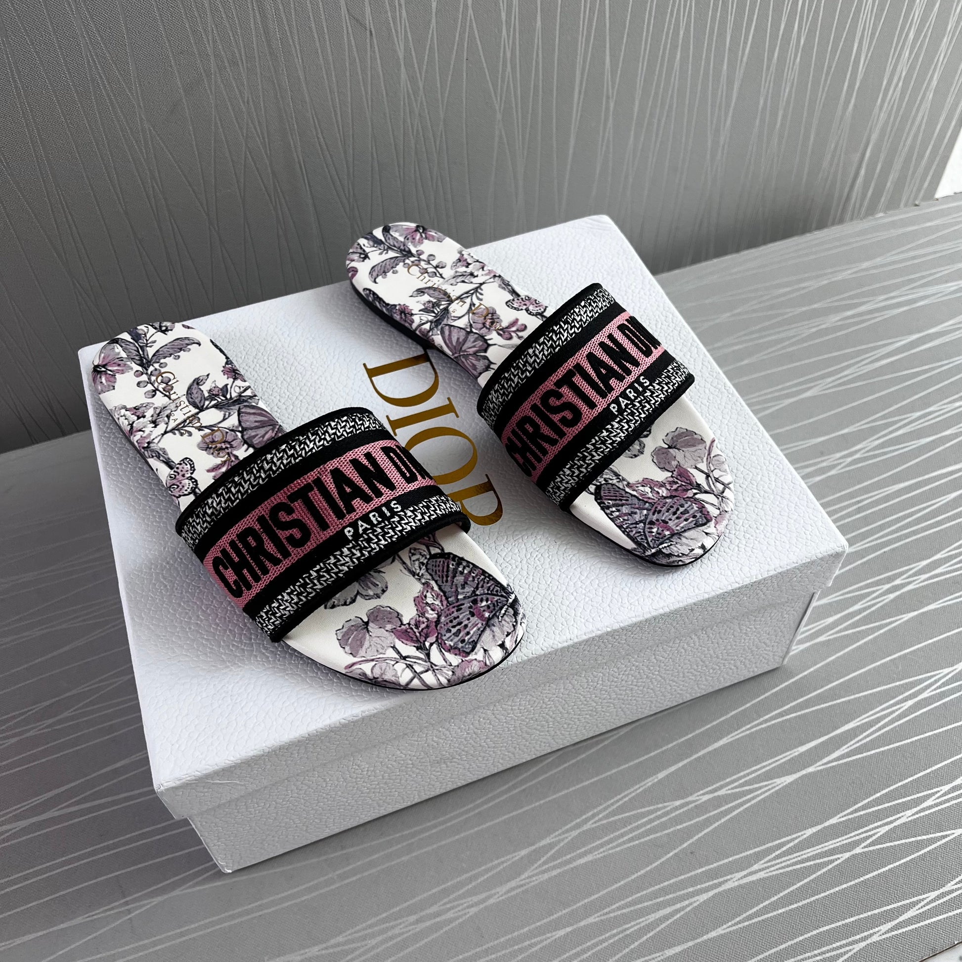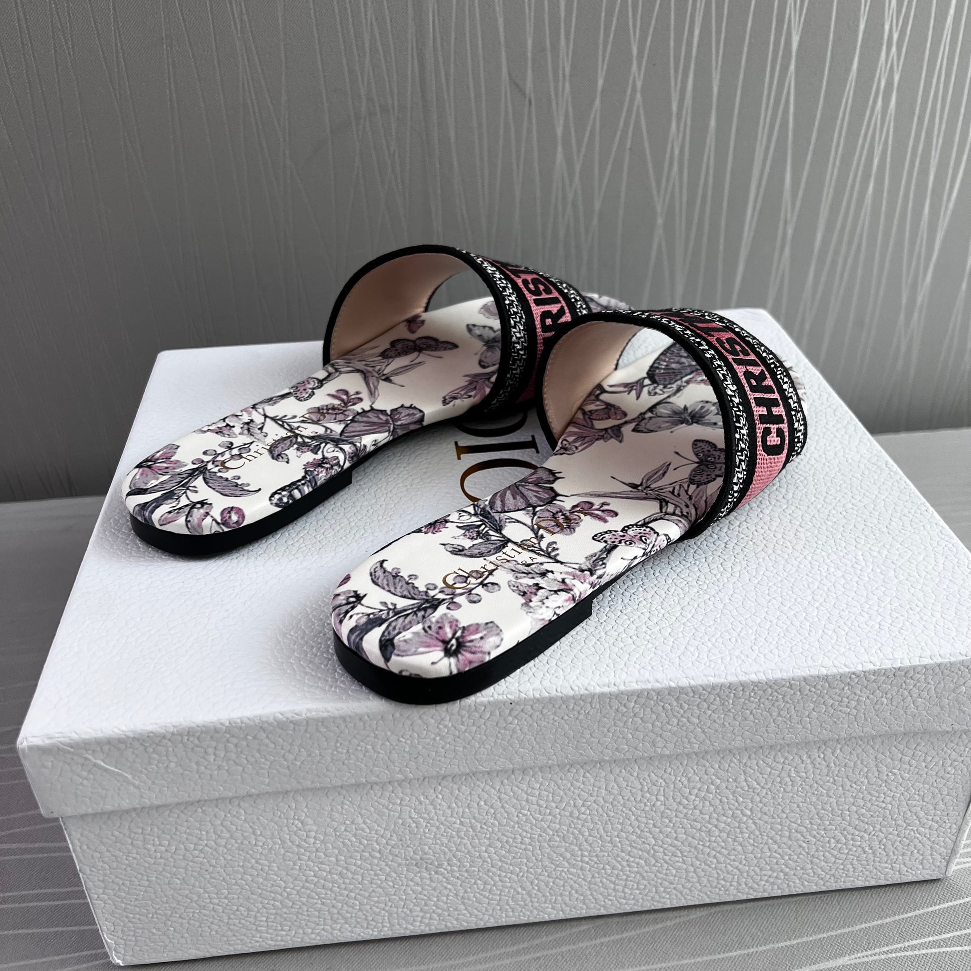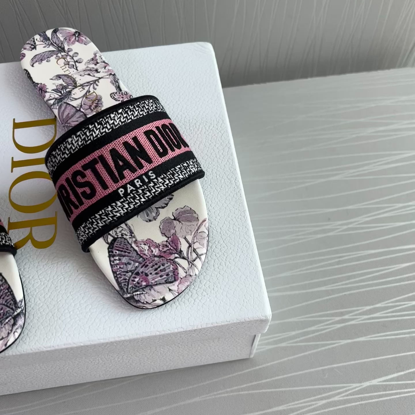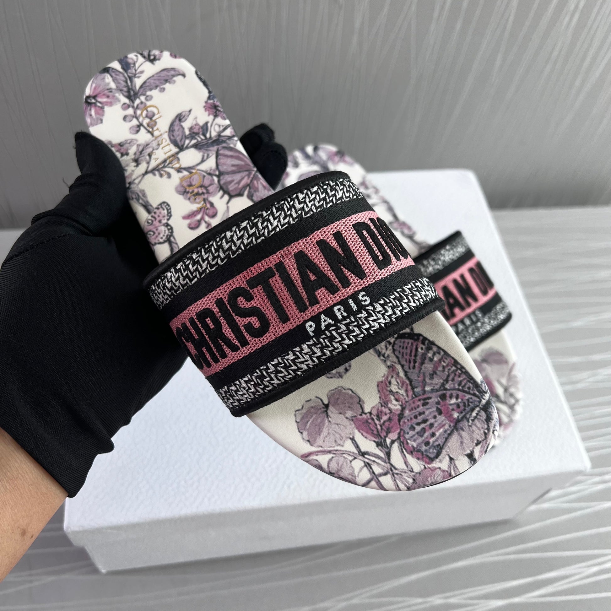 Sandalias en tela bordada en color rosa con flores color lila, incluye caja.