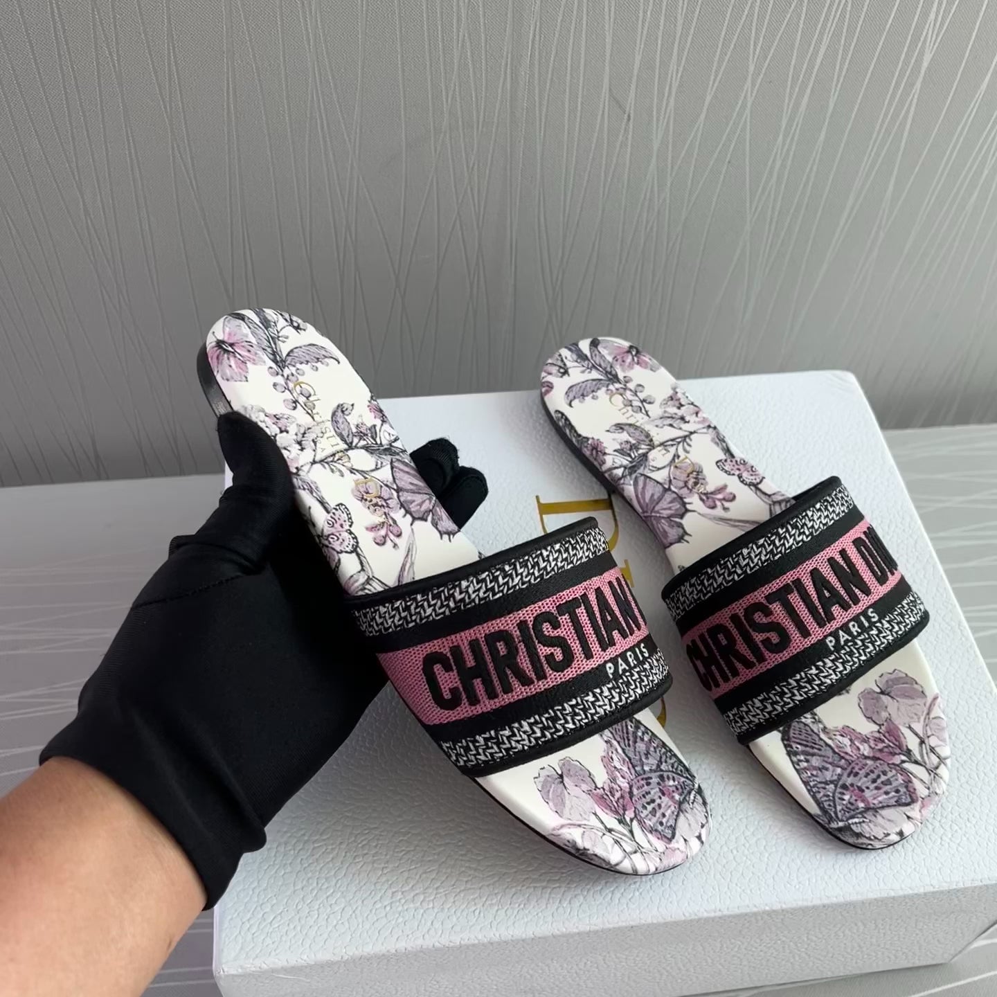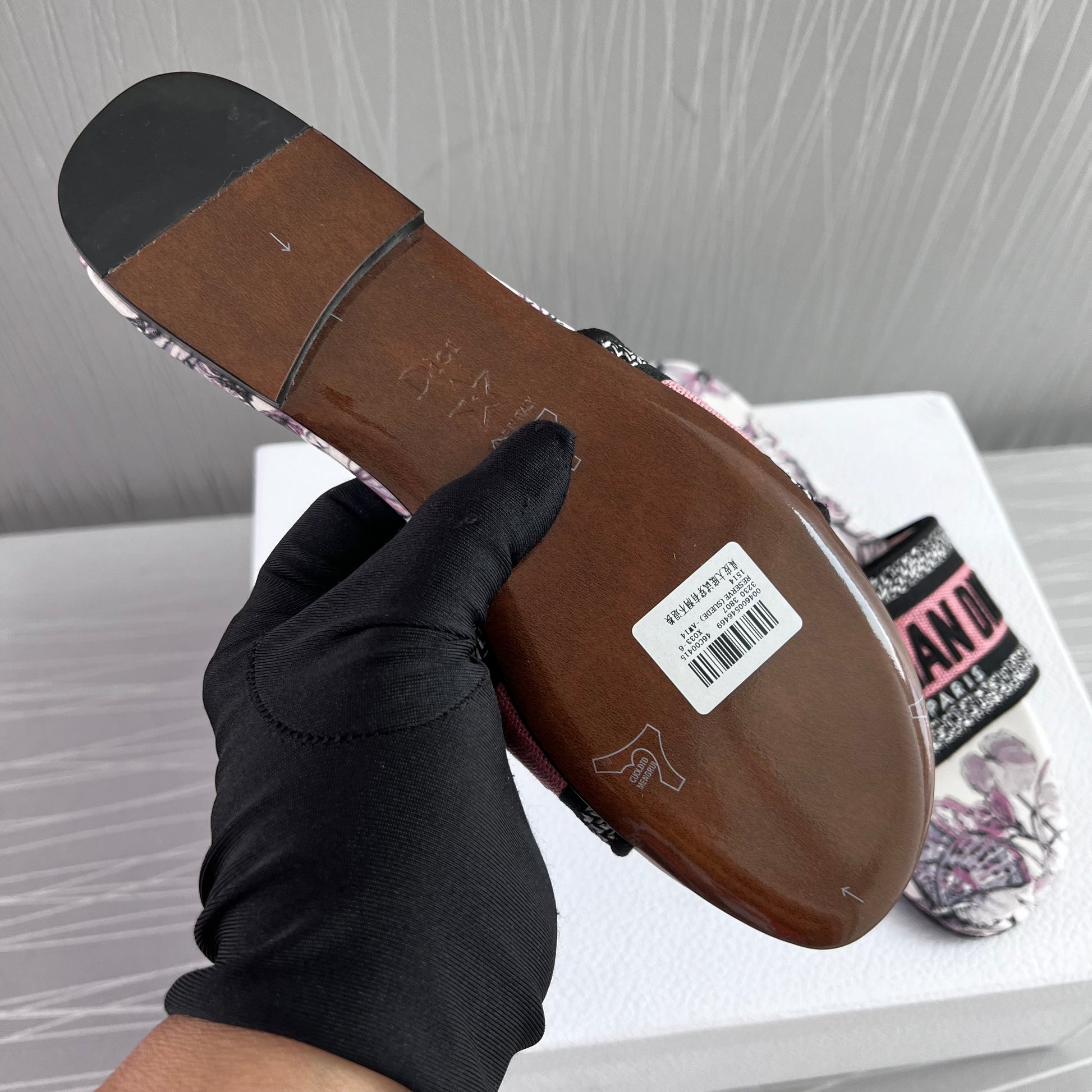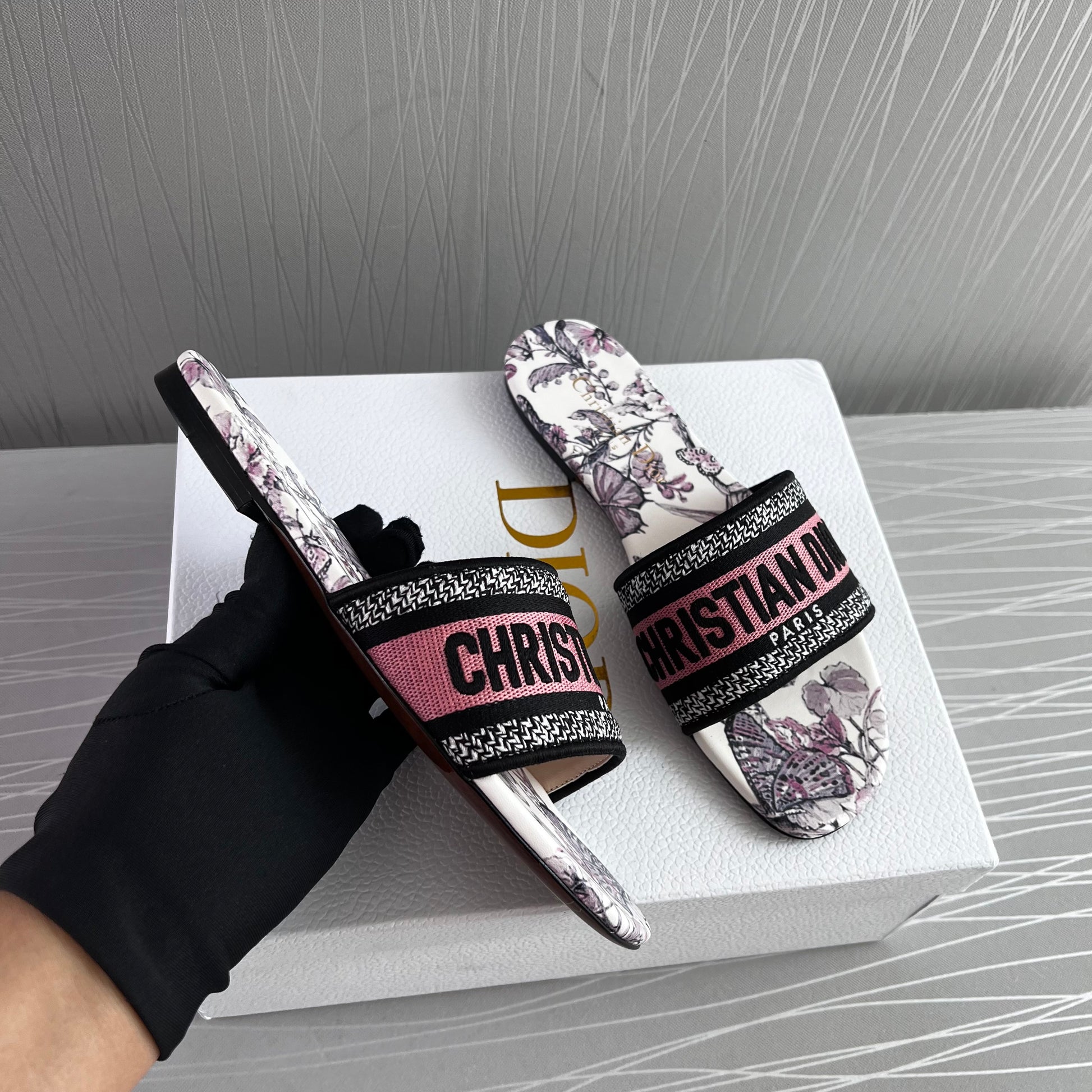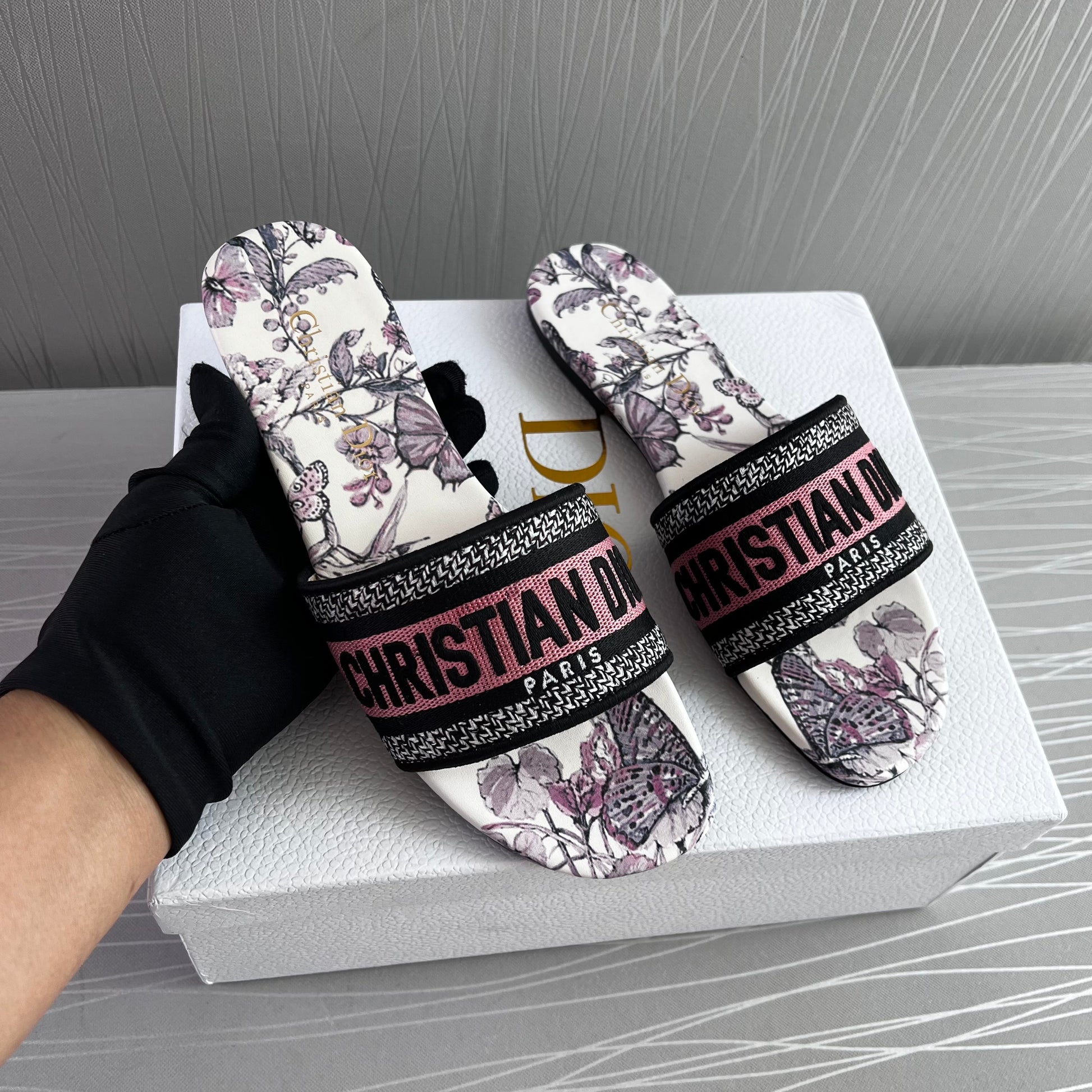 Sandalias en tela bordada en color rosa con flores color lila, incluye caja.