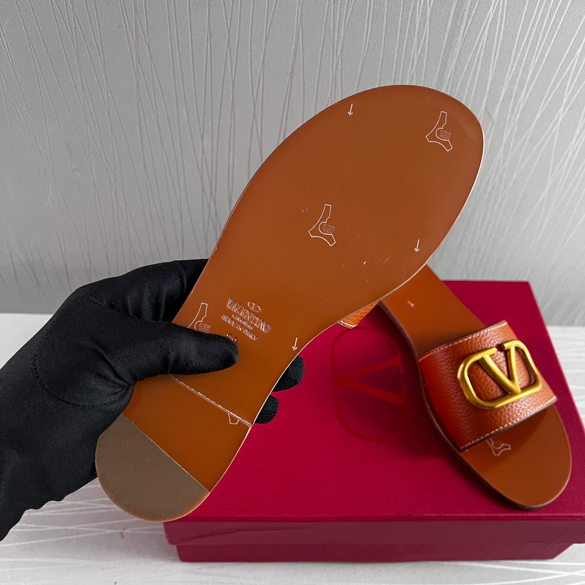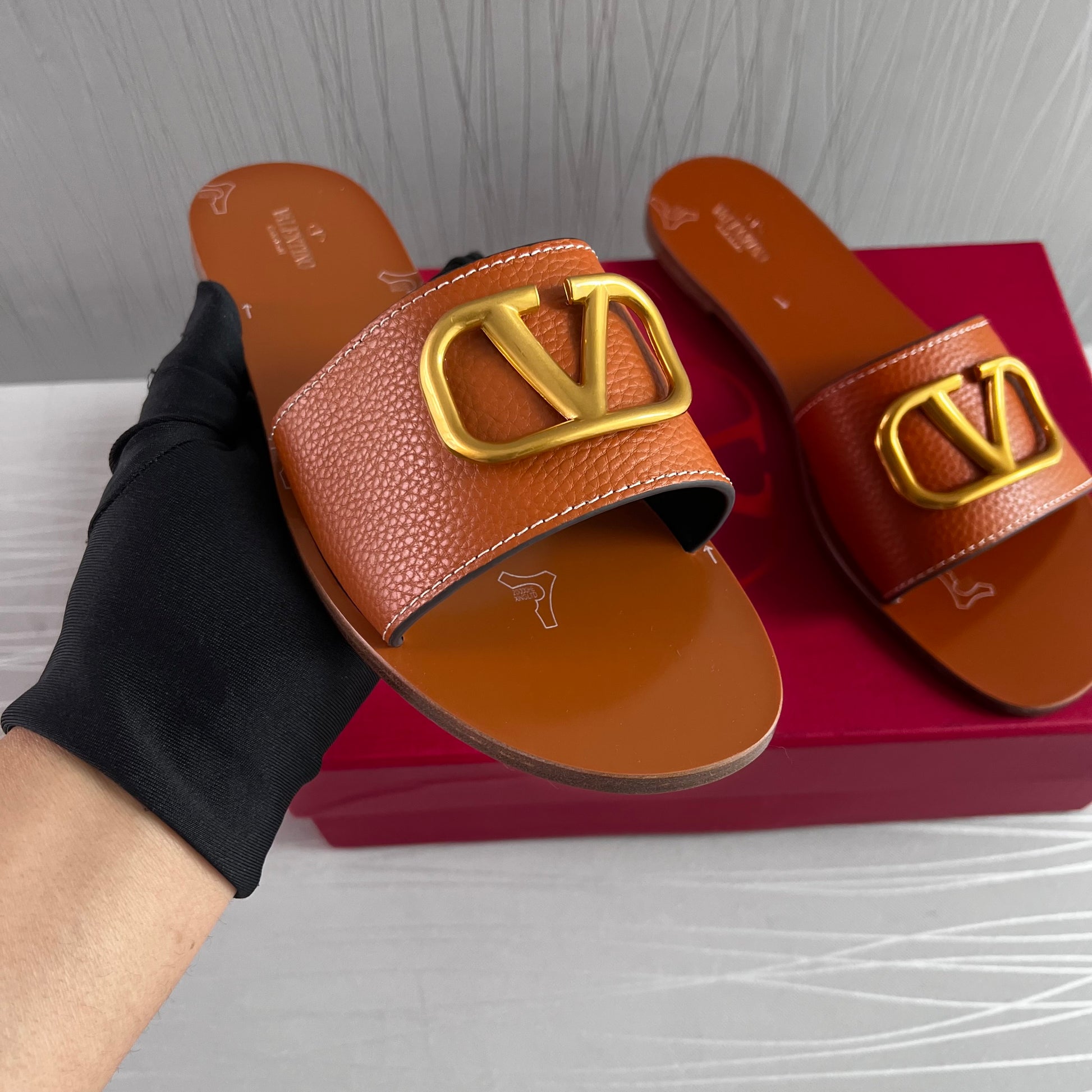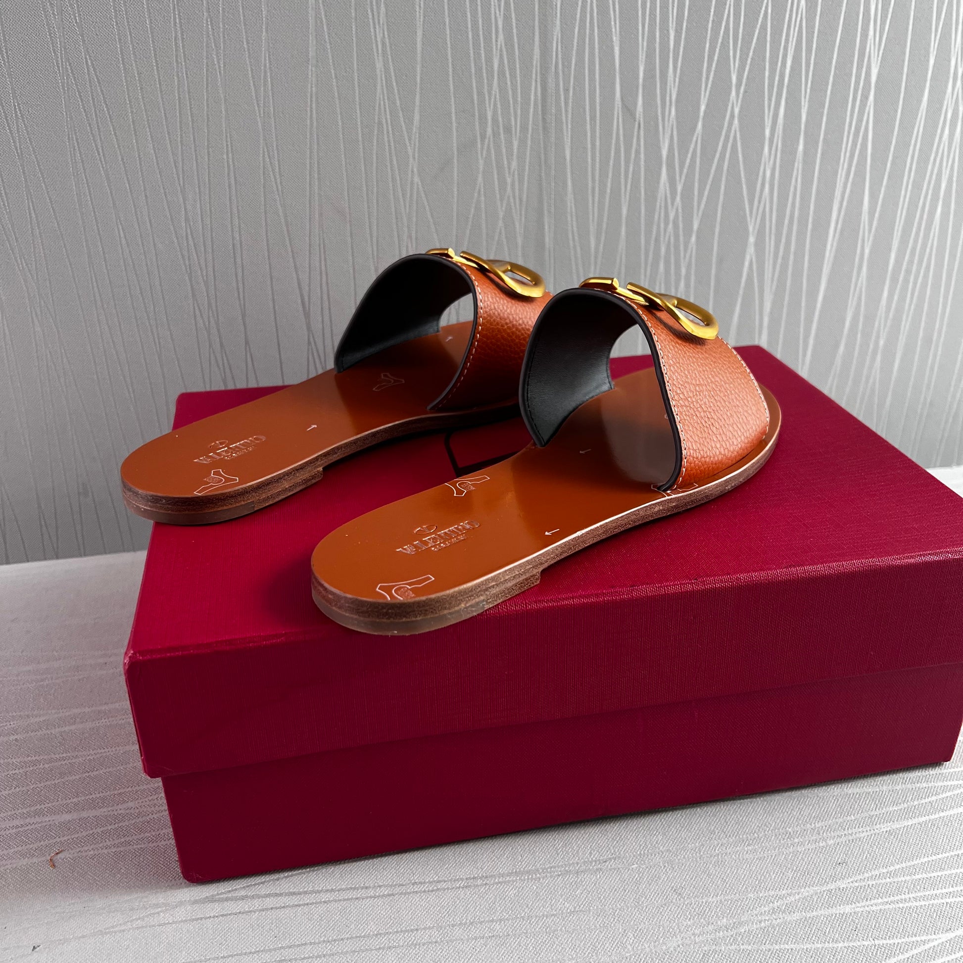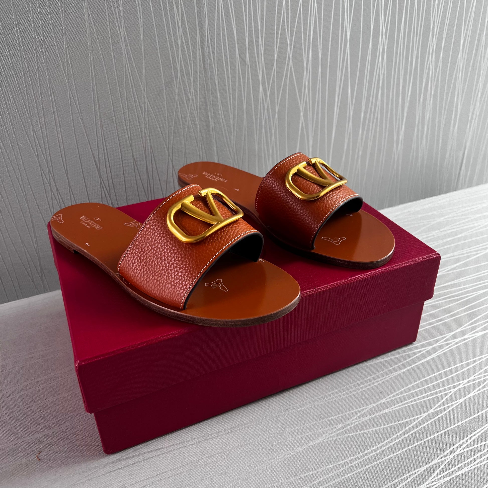 Sandalias en piel color camel con herraje en V color dorado. Incluye shopping bag y bolsa guardapolvo.