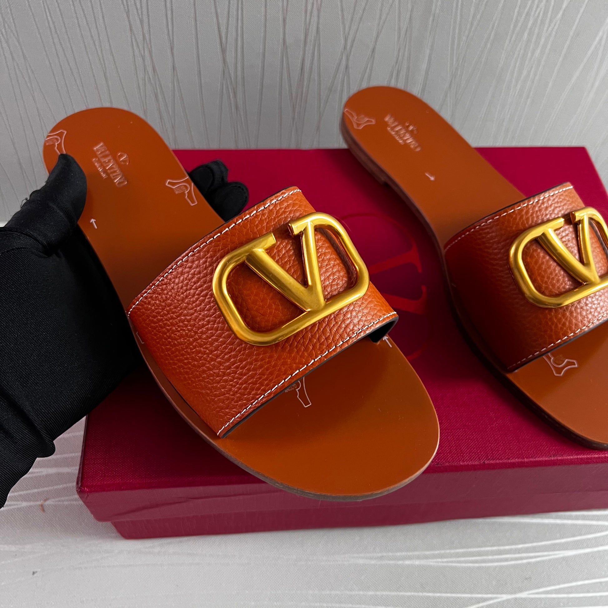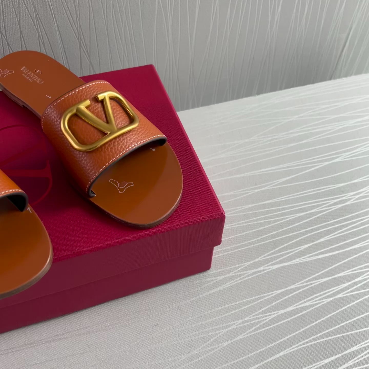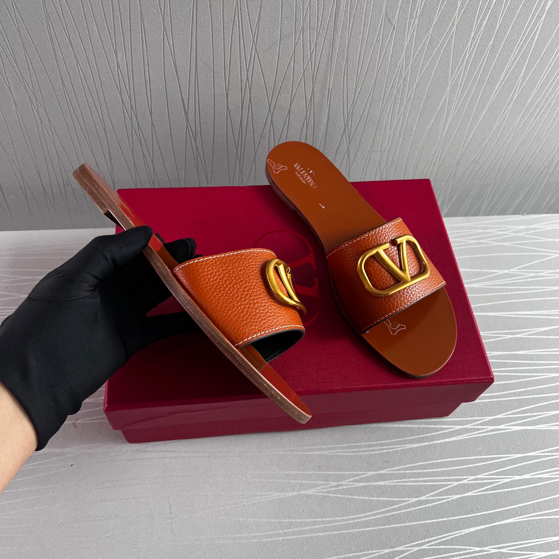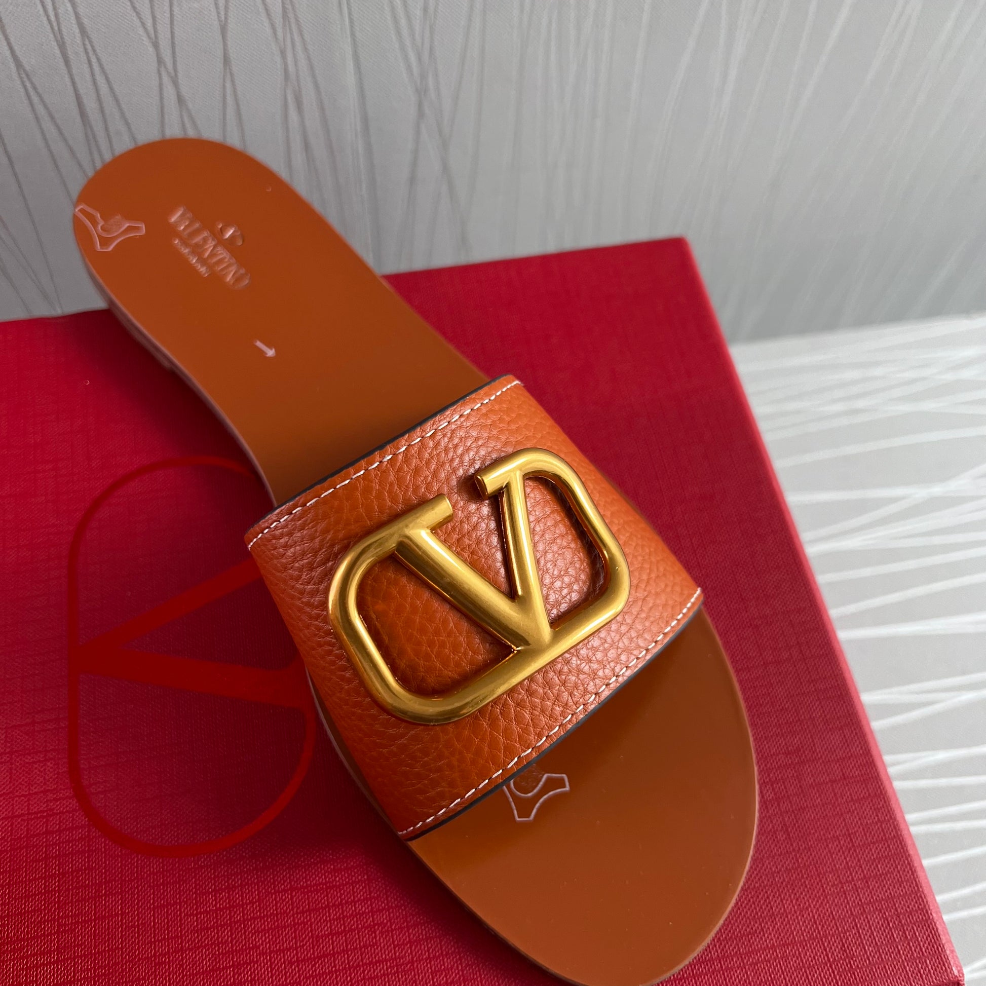 Sandalias en piel color camel con herraje en V color dorado. Incluye shopping bag y bolsa guardapolvo.