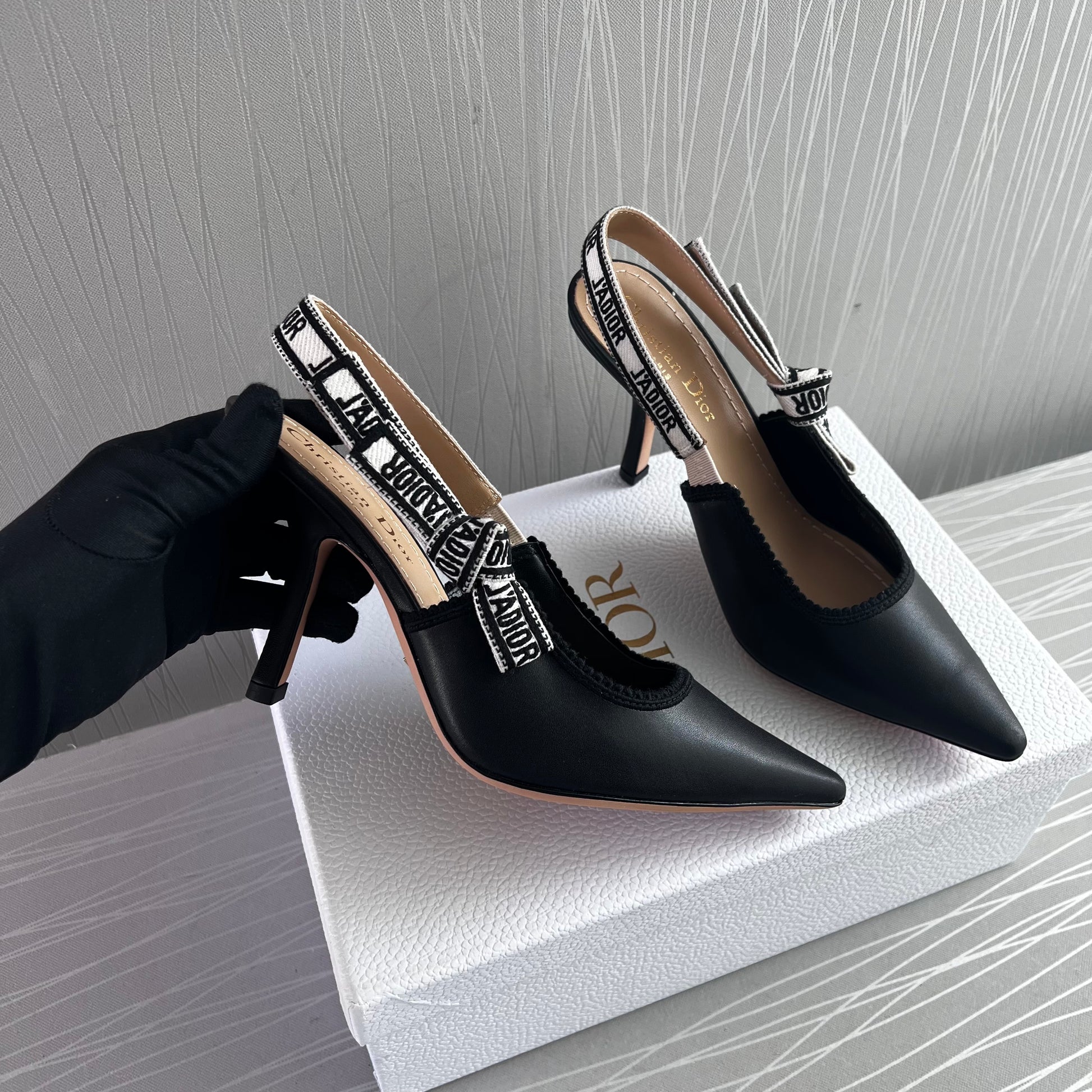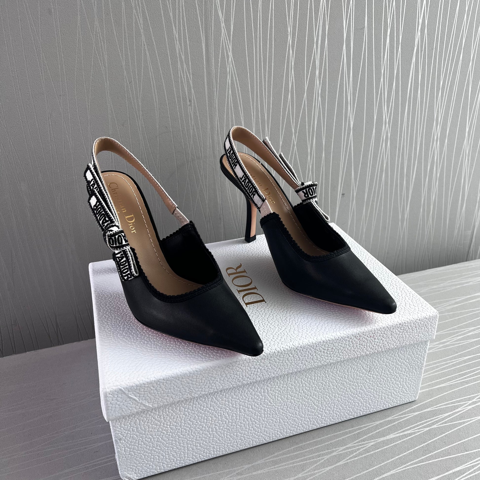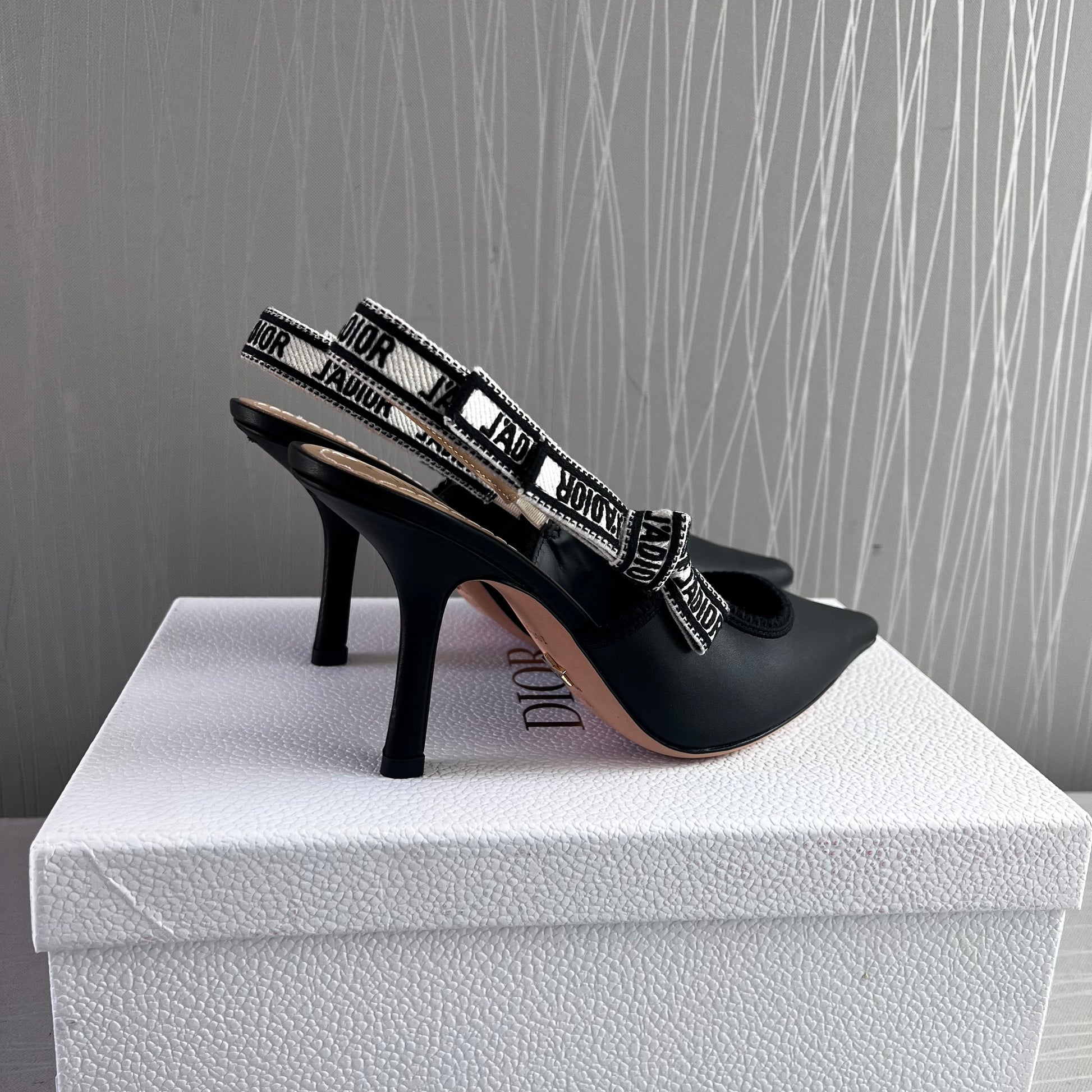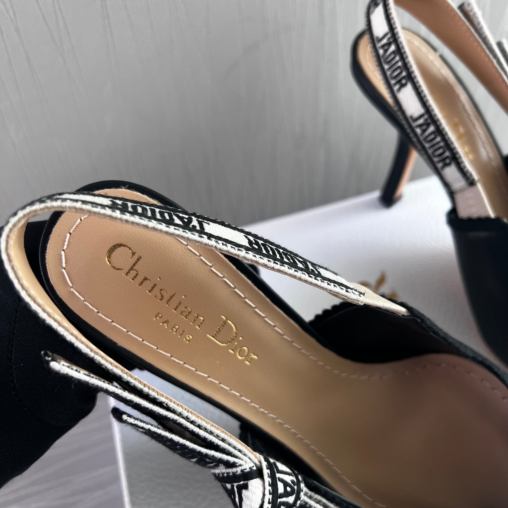 Zapatillas D piel color negro combinada con listón bordado en blanco y negro. Altura del tacón 10 cm. Incluye caja, cubrepolvo.