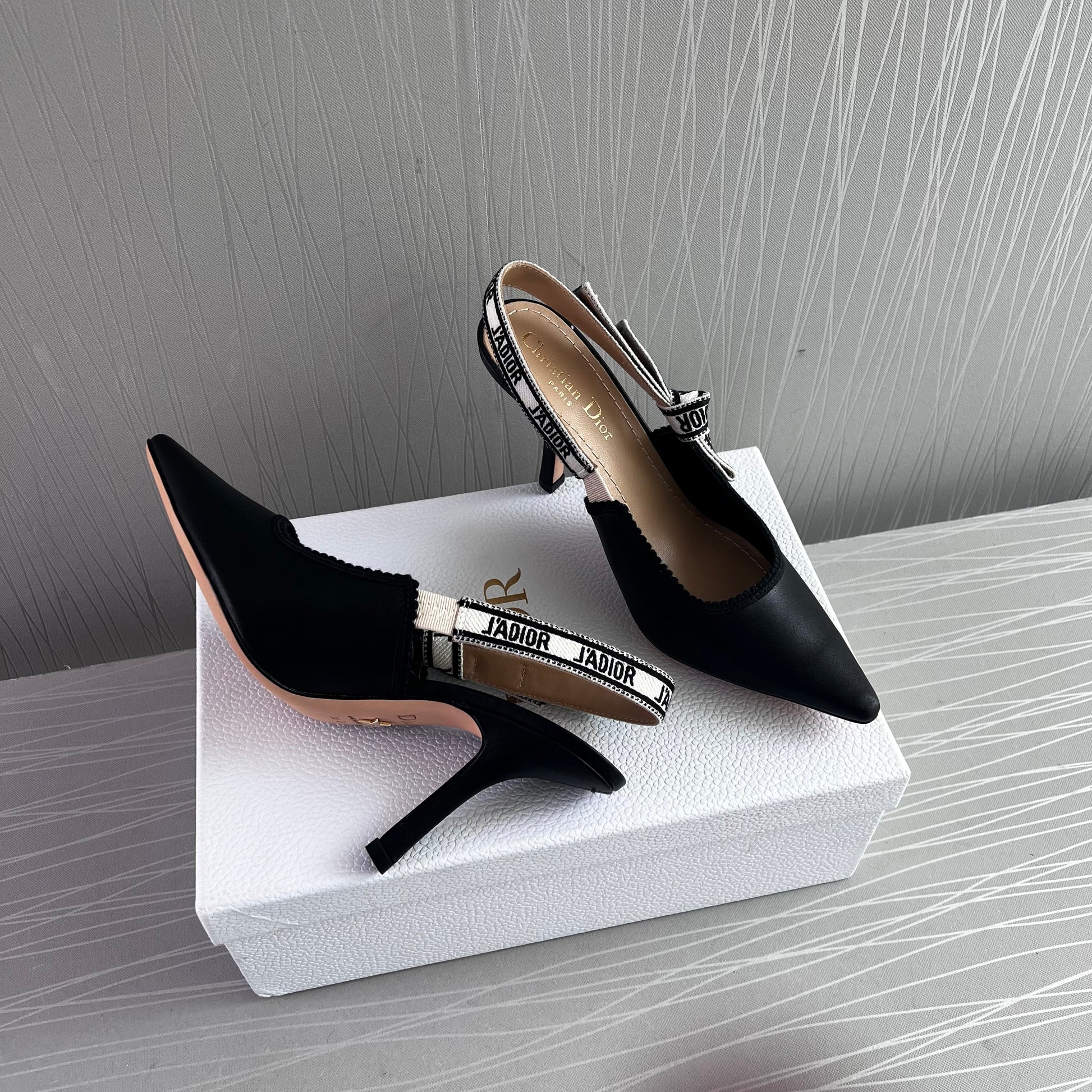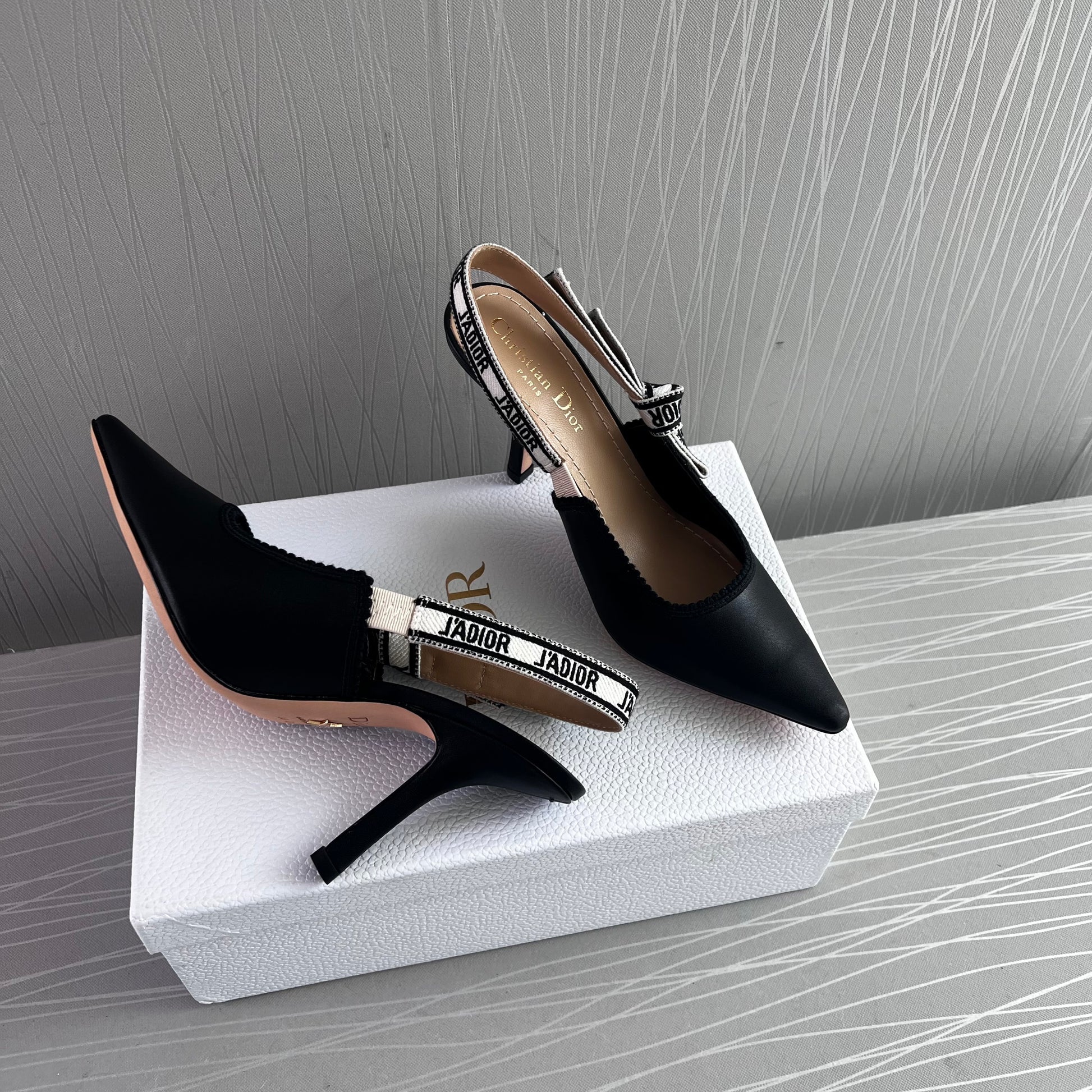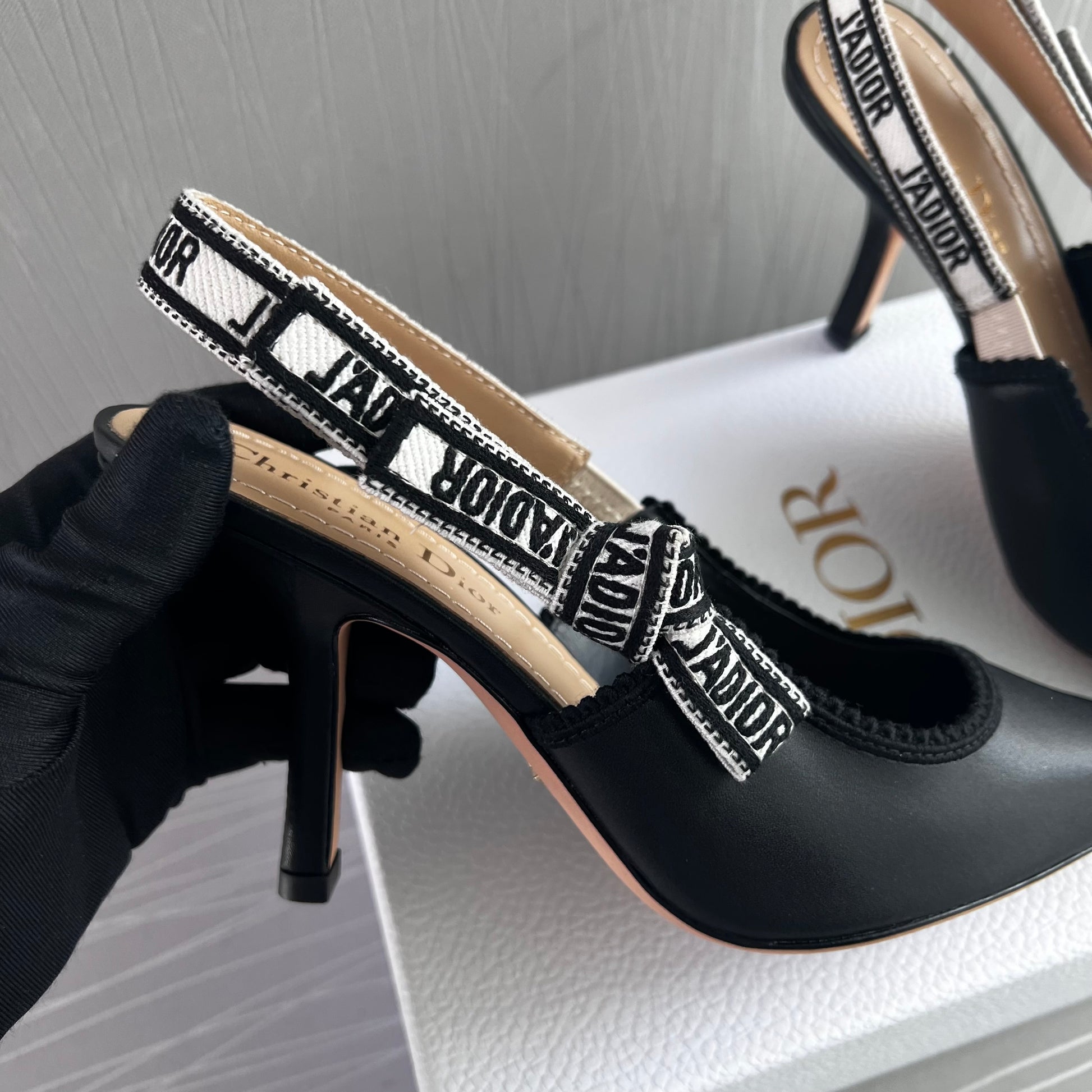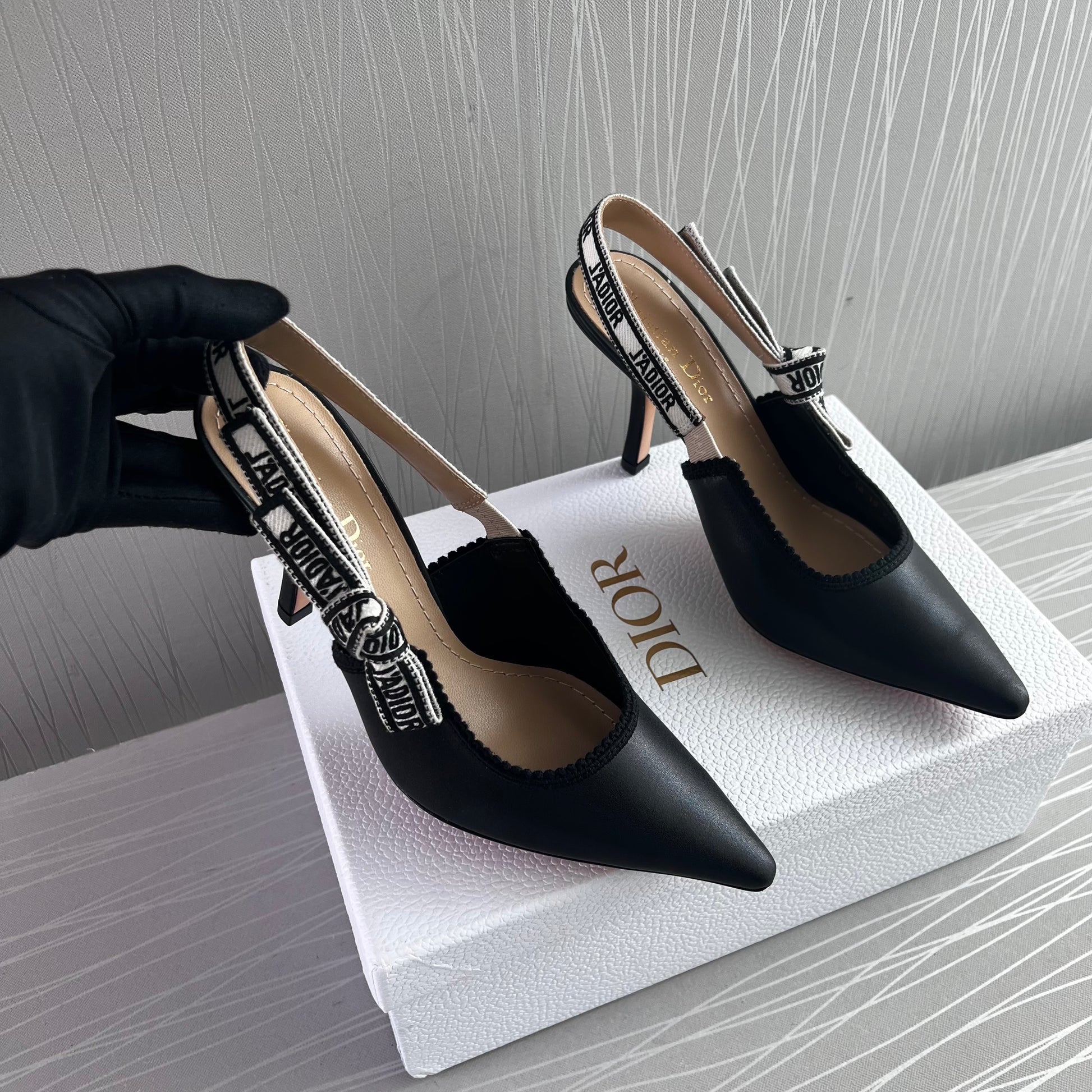 Zapatillas D piel color negro combinada con listón bordado en blanco y negro. Altura del tacón 10 cm. Incluye caja, cubrepolvo.