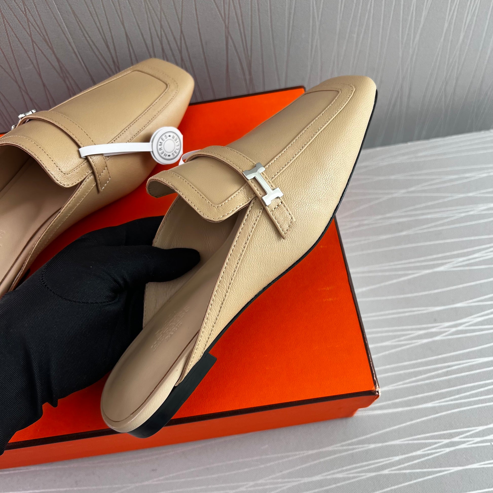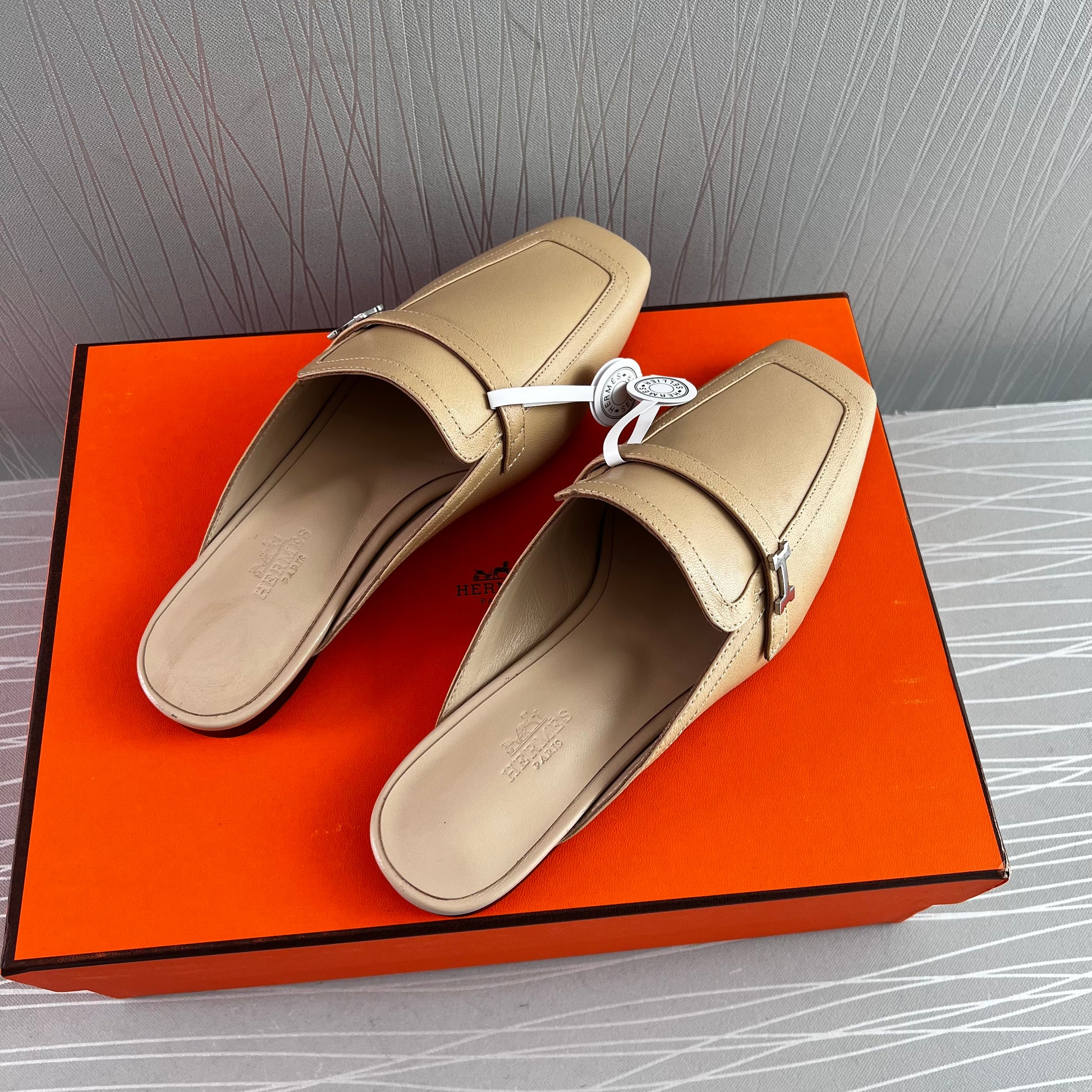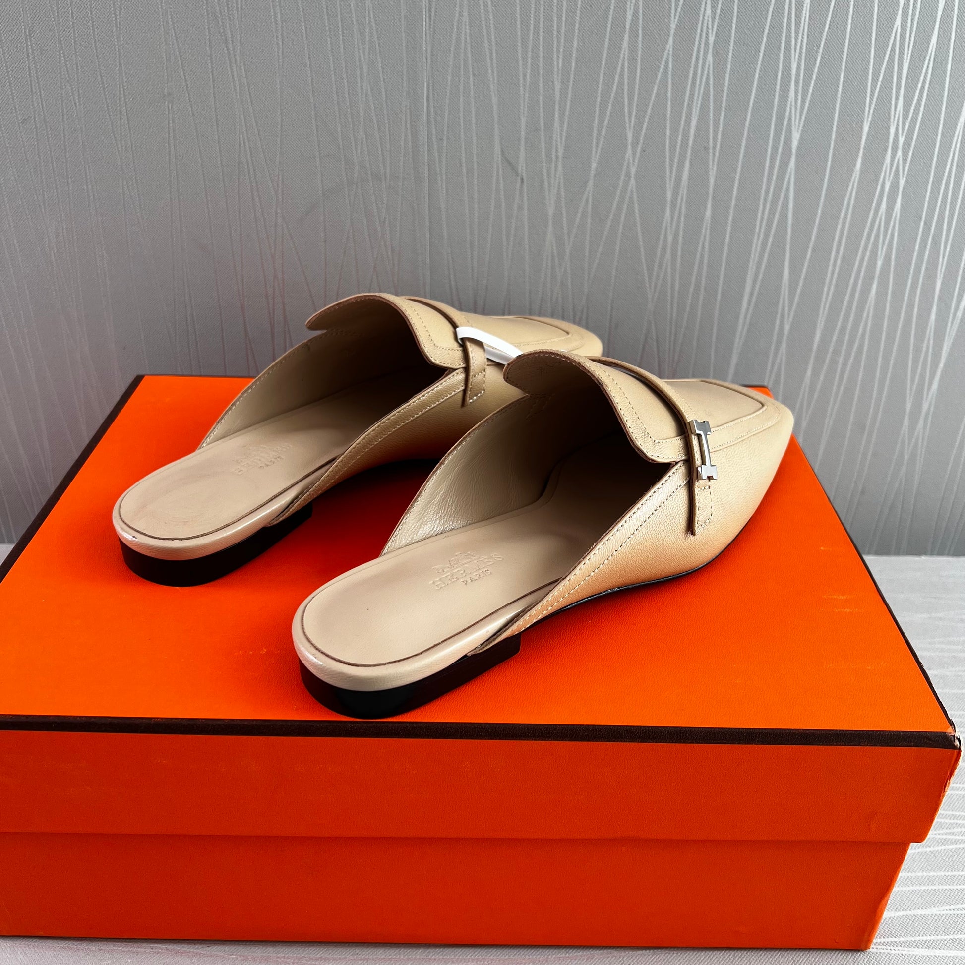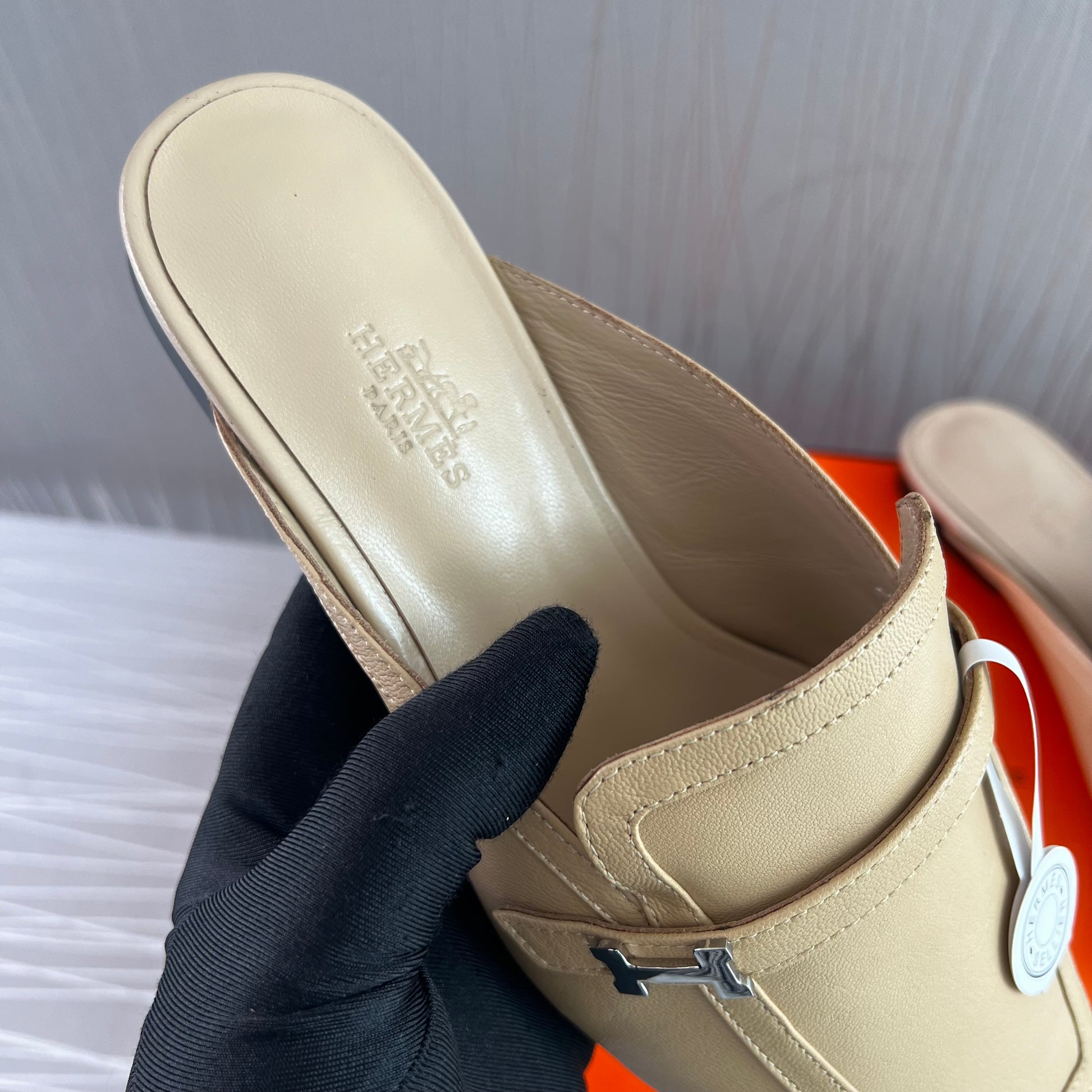 Sleepers piel beige con herrajes en color plata. Incluye caja y cubrepolvos.