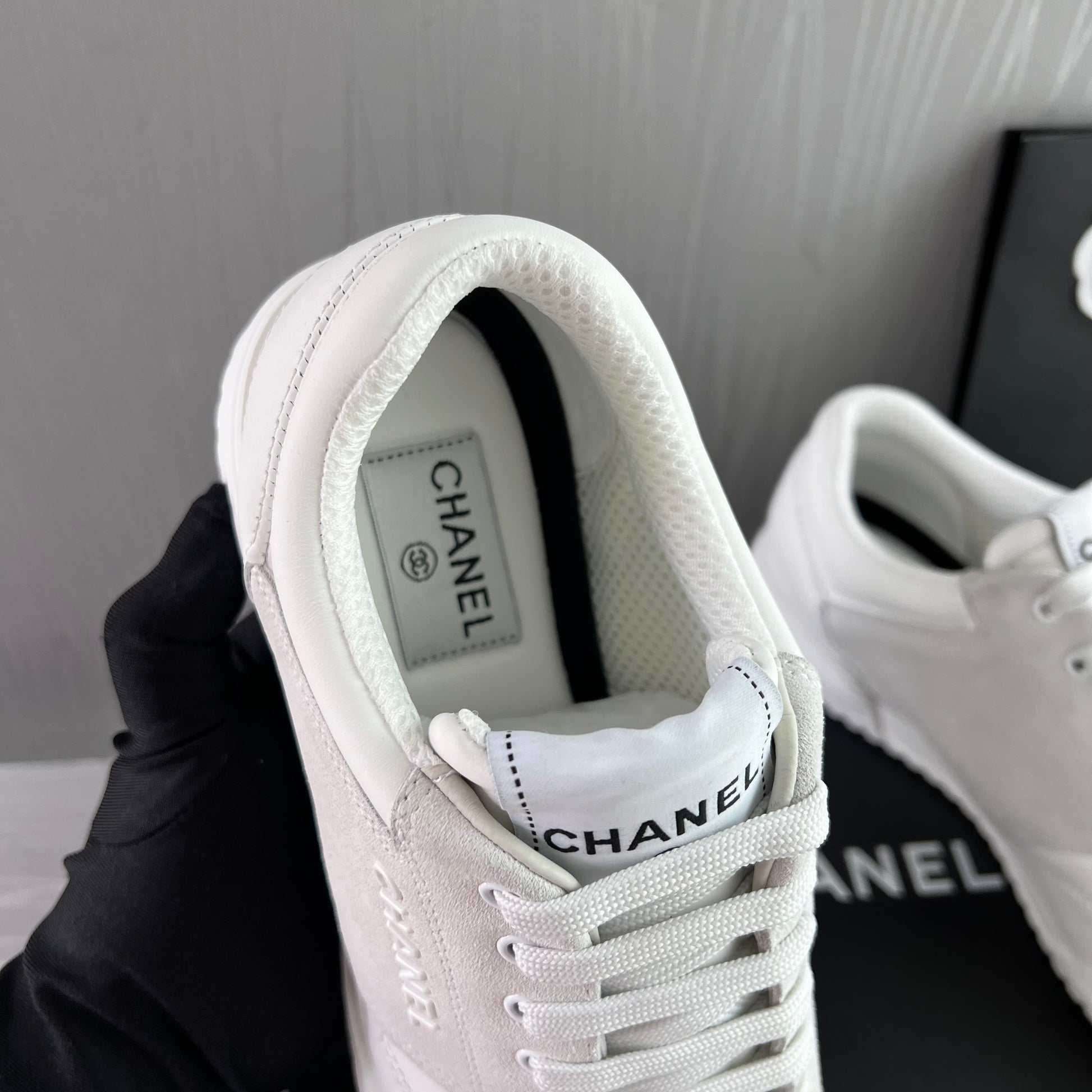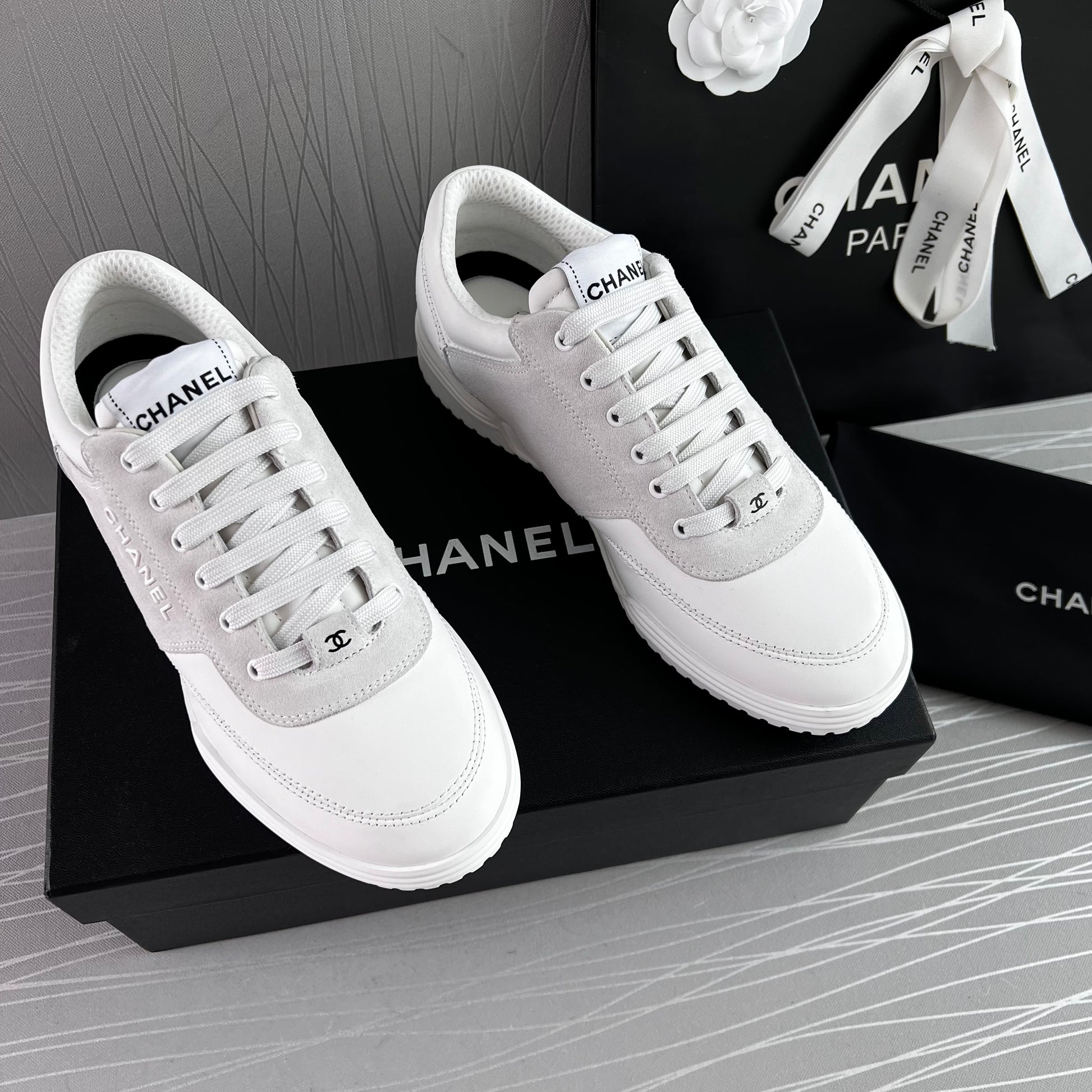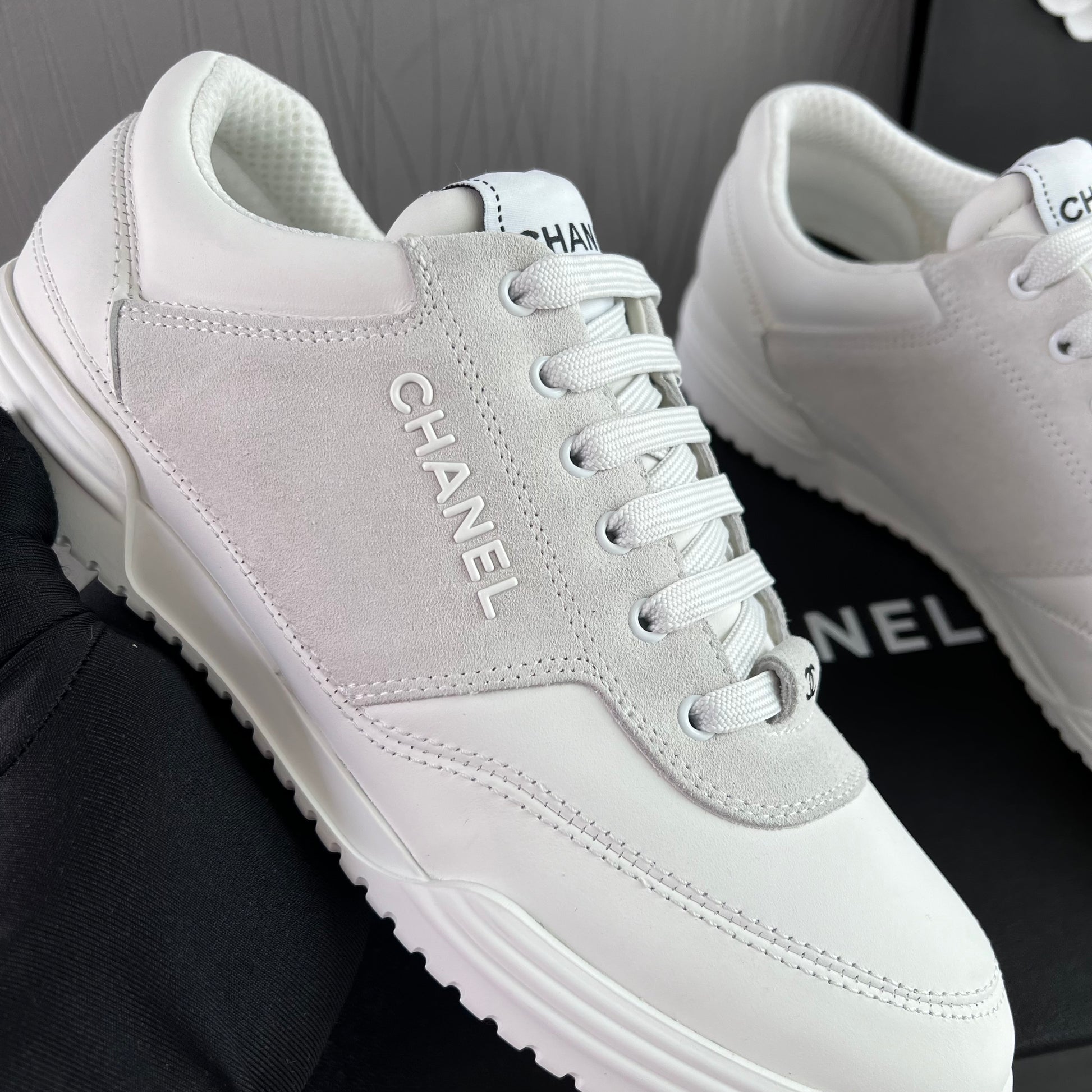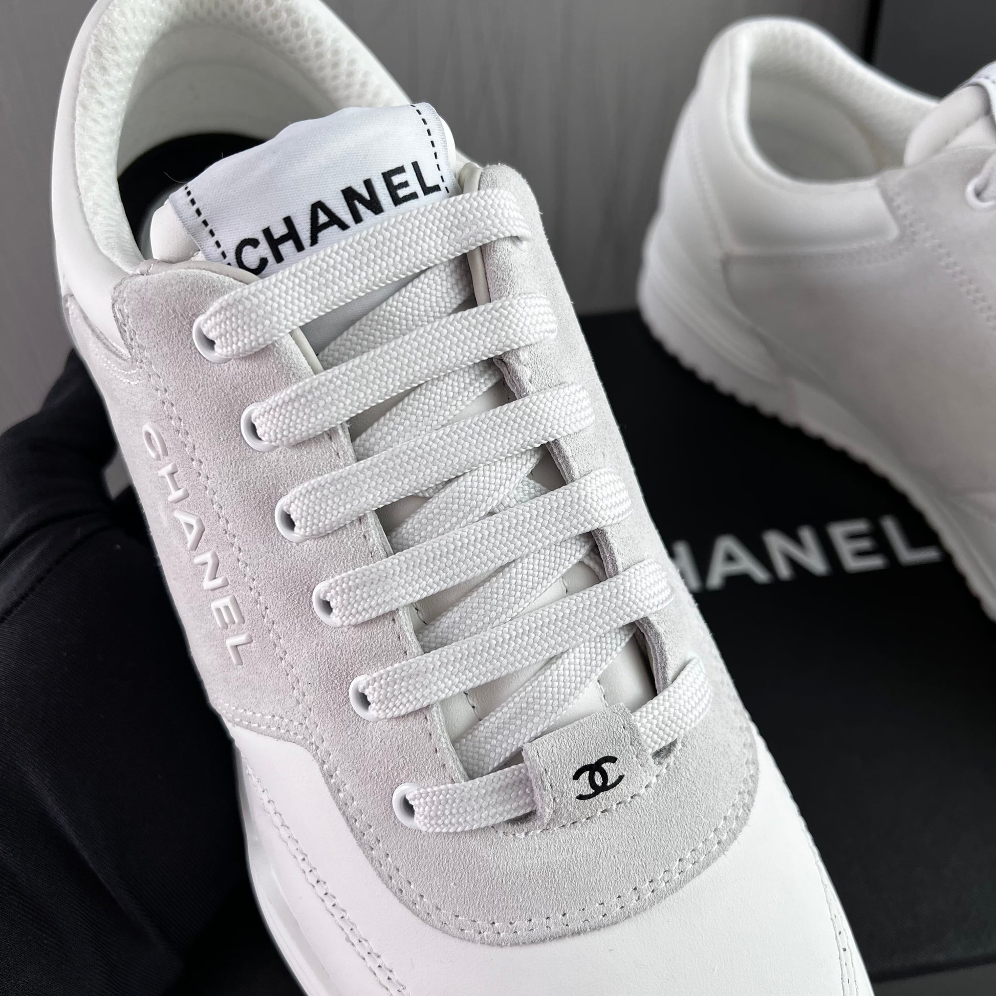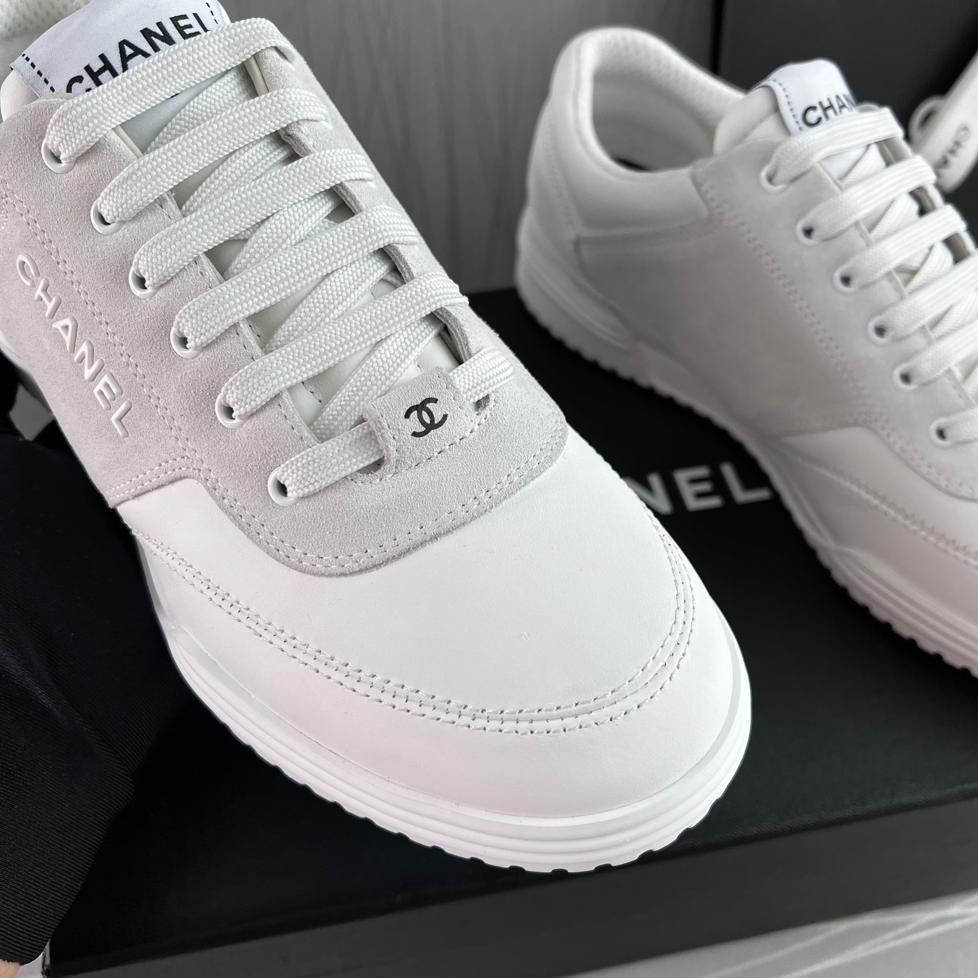 Sneakers piel color blanco con gamuza. Letras realzadas Chanel. Incluye caja, cubrepolvo.