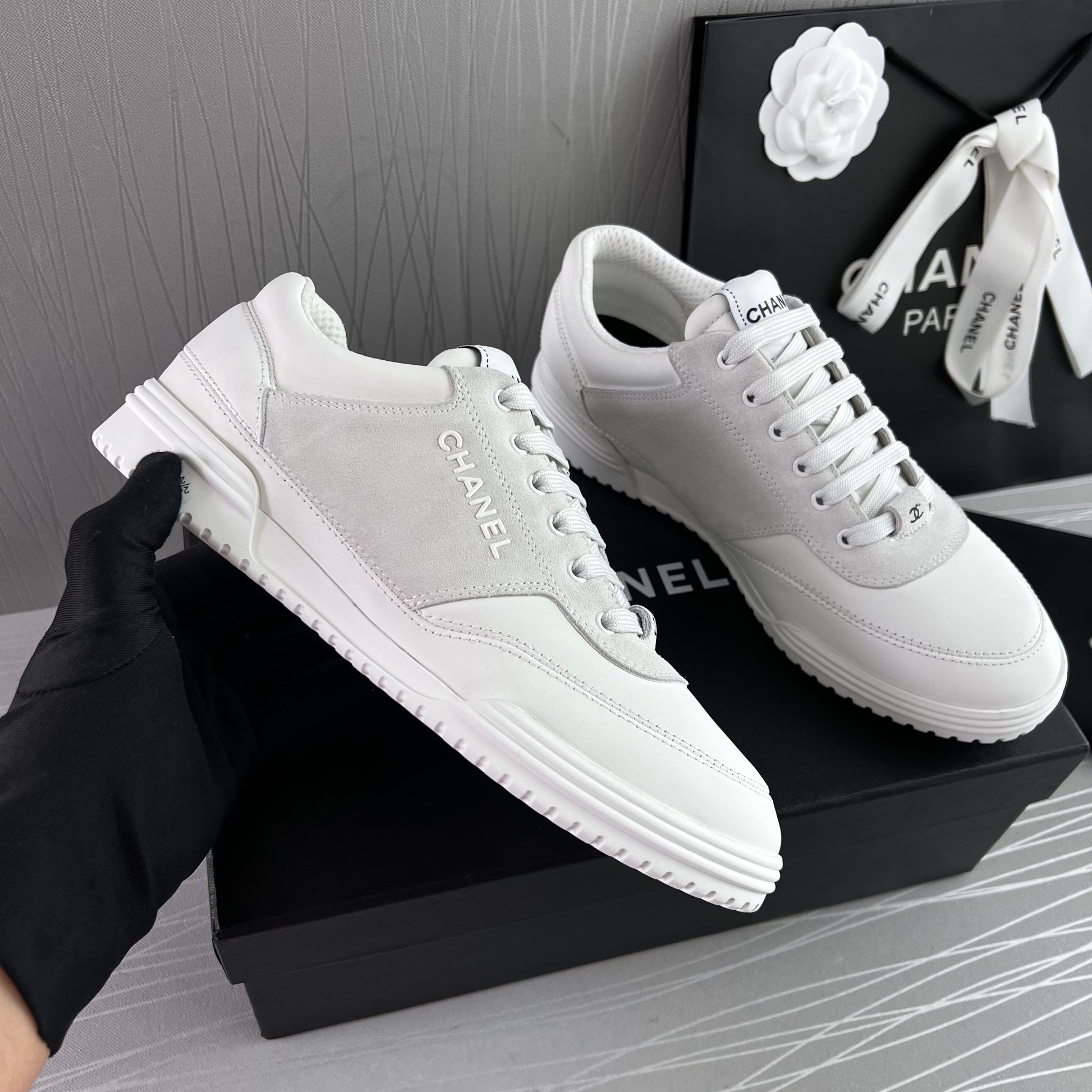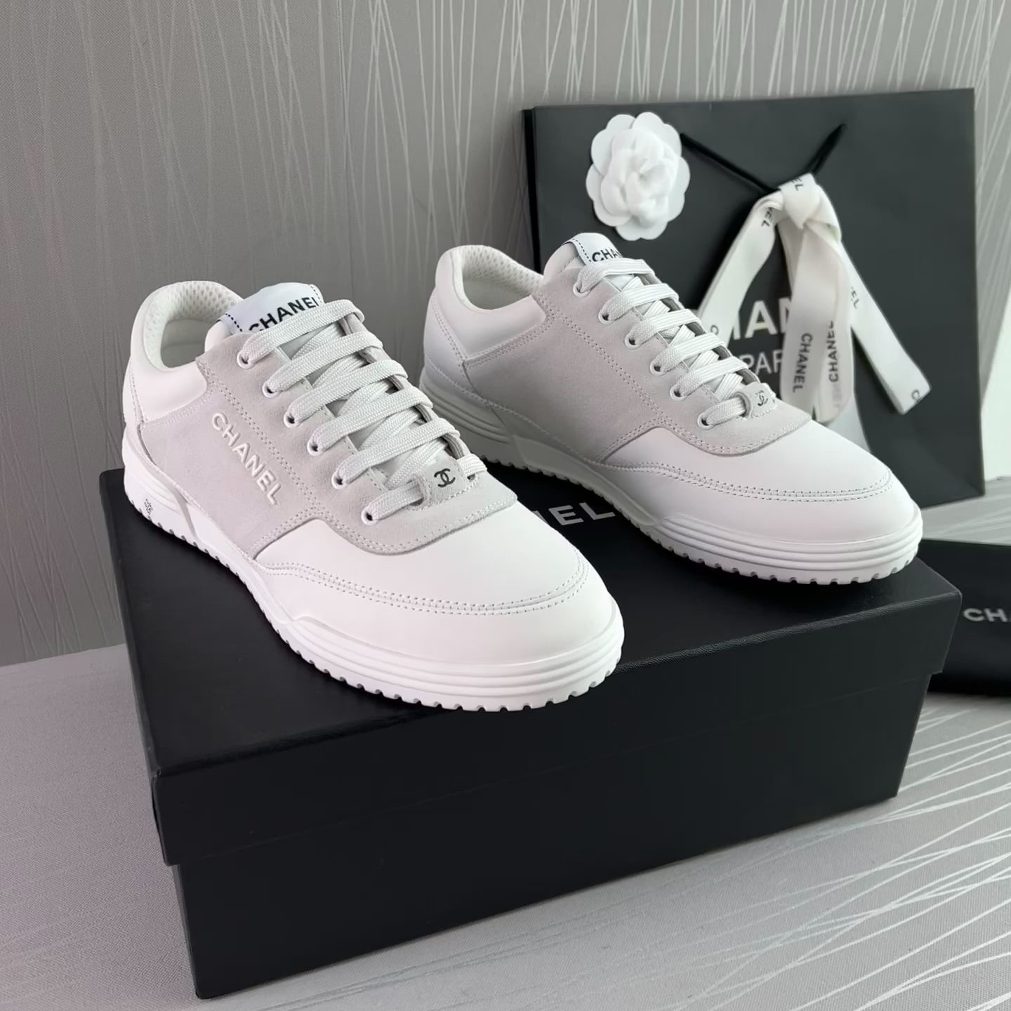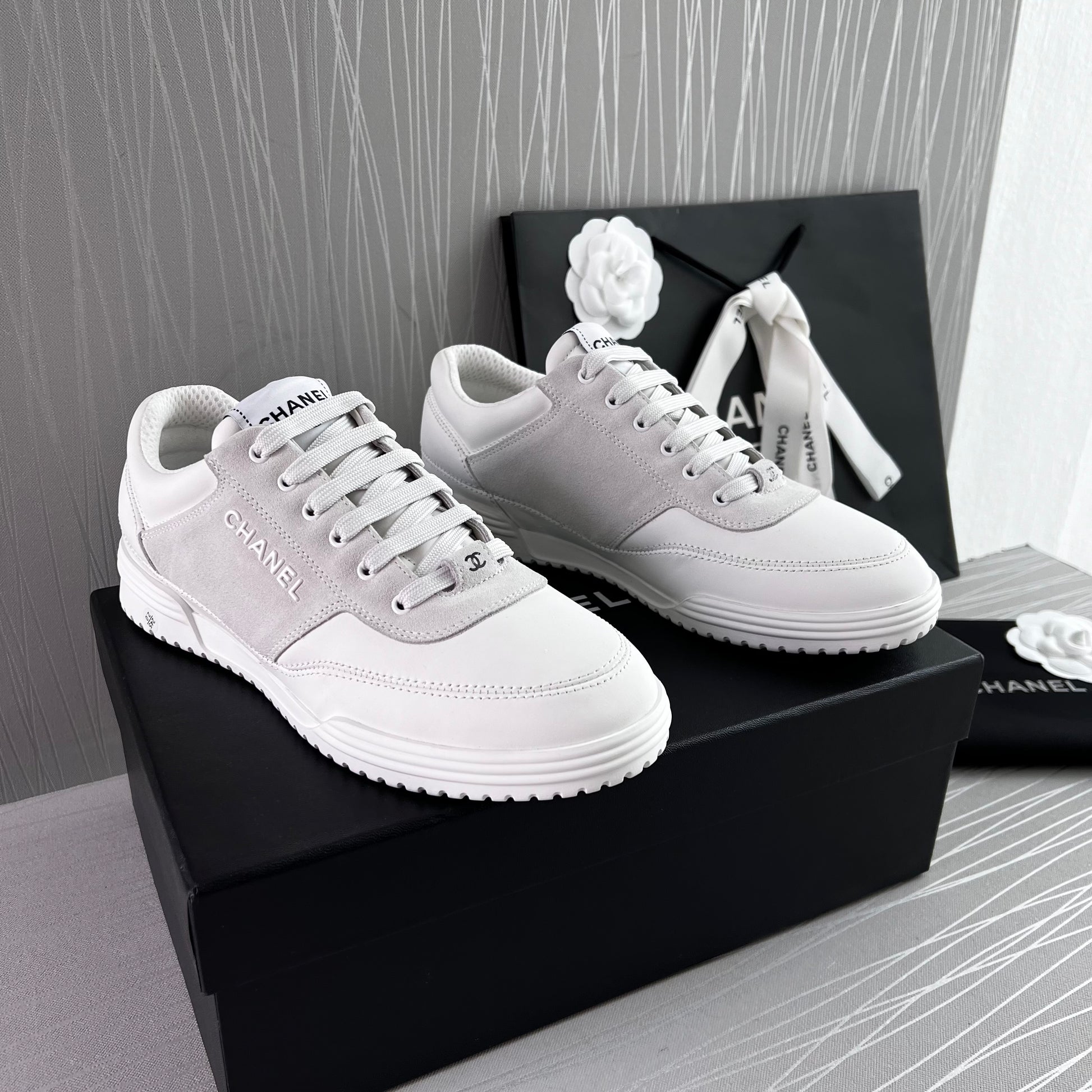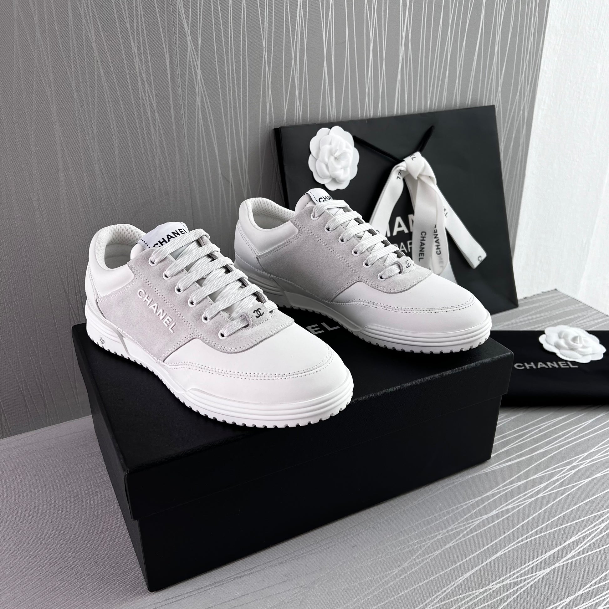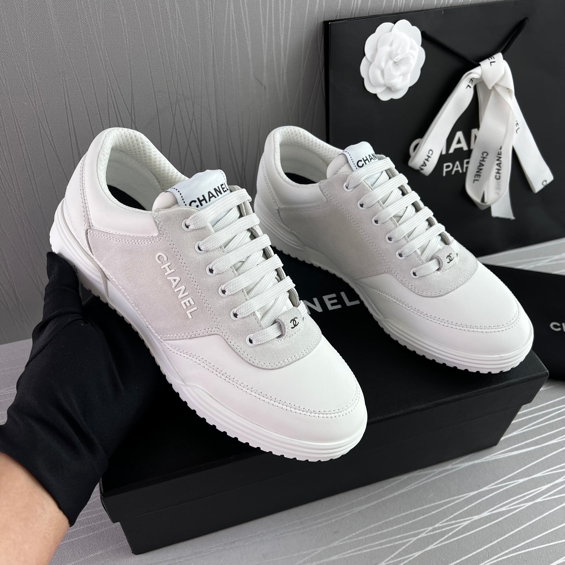 Sneakers piel color blanco con gamuza. Letras realzadas Chanel. Incluye caja, cubrepolvo.