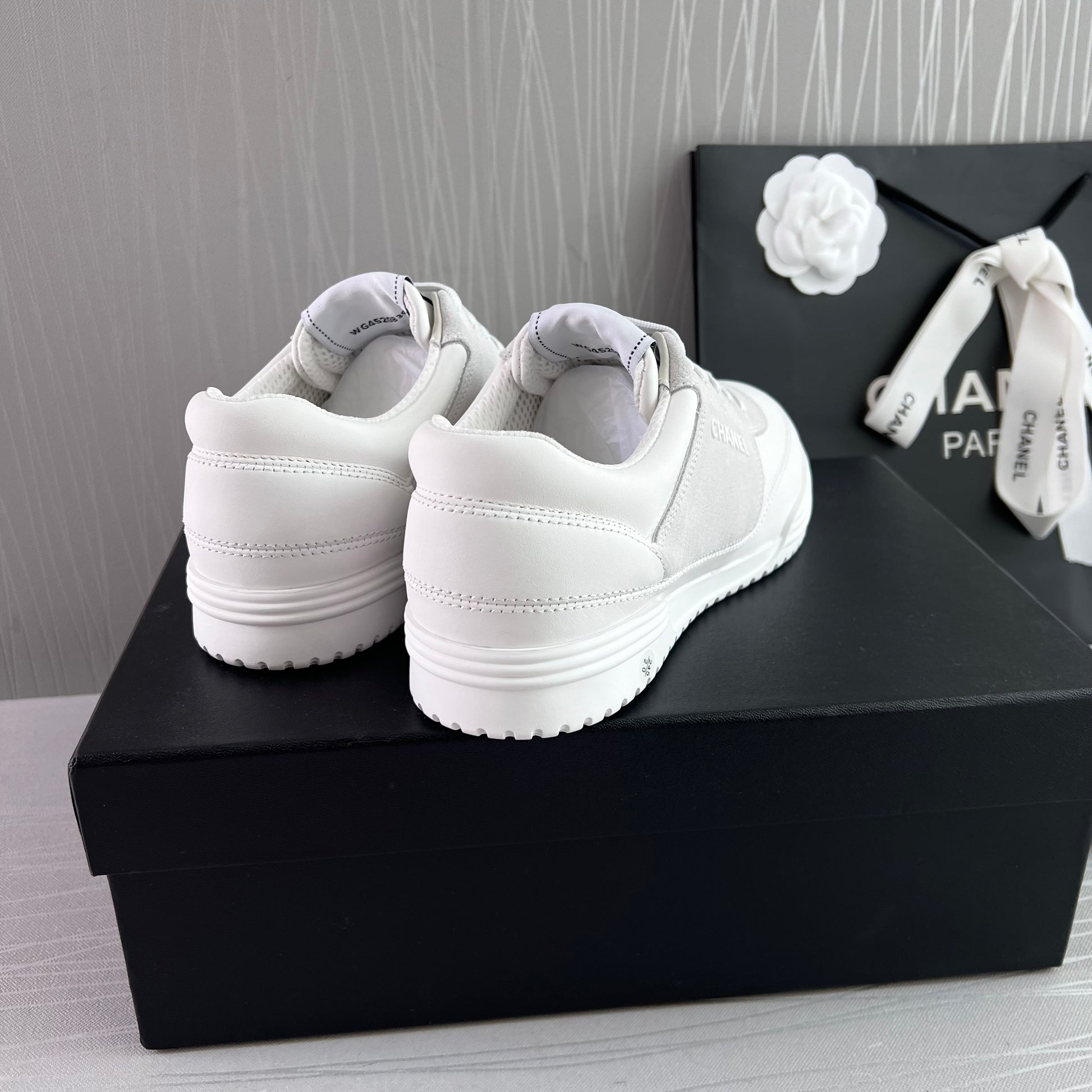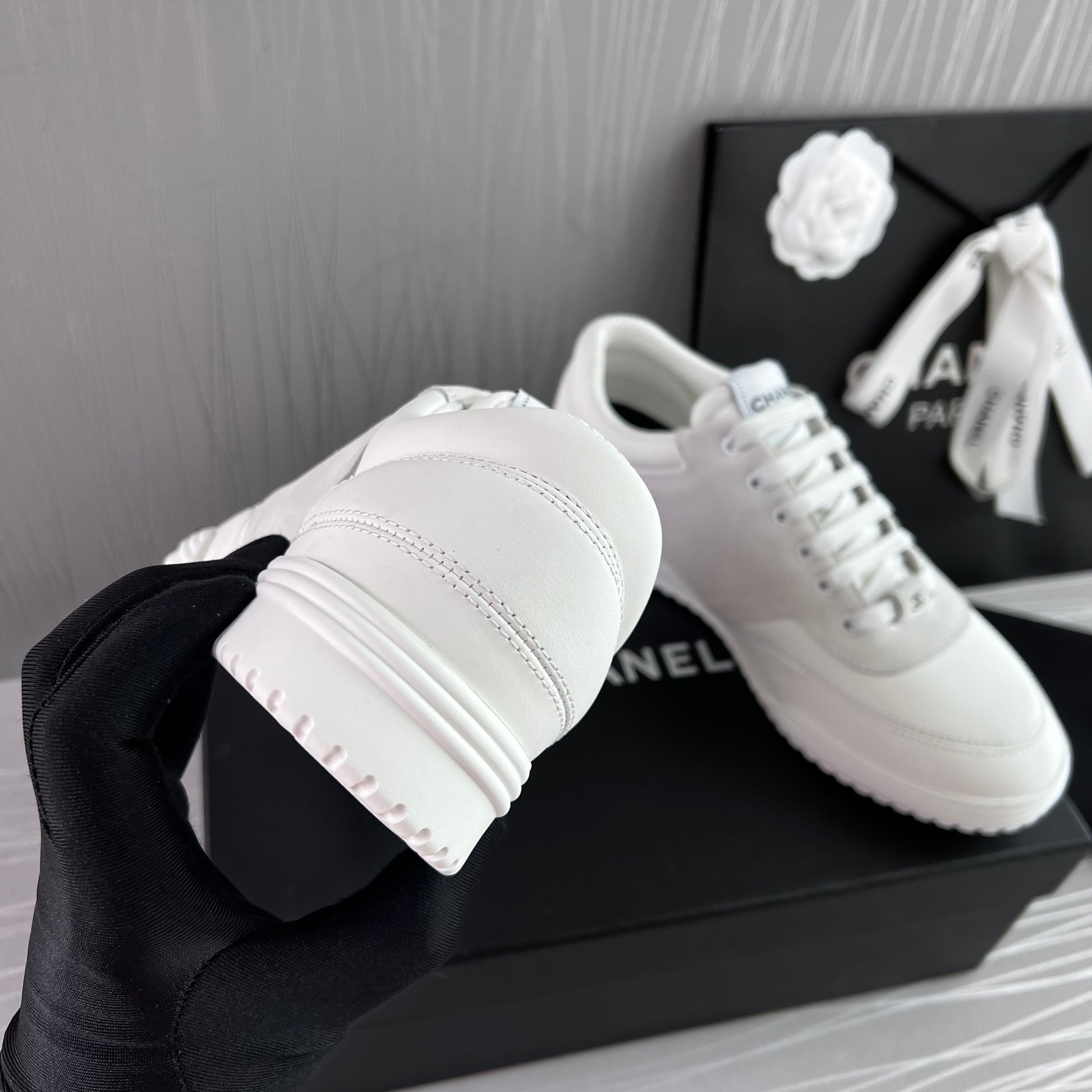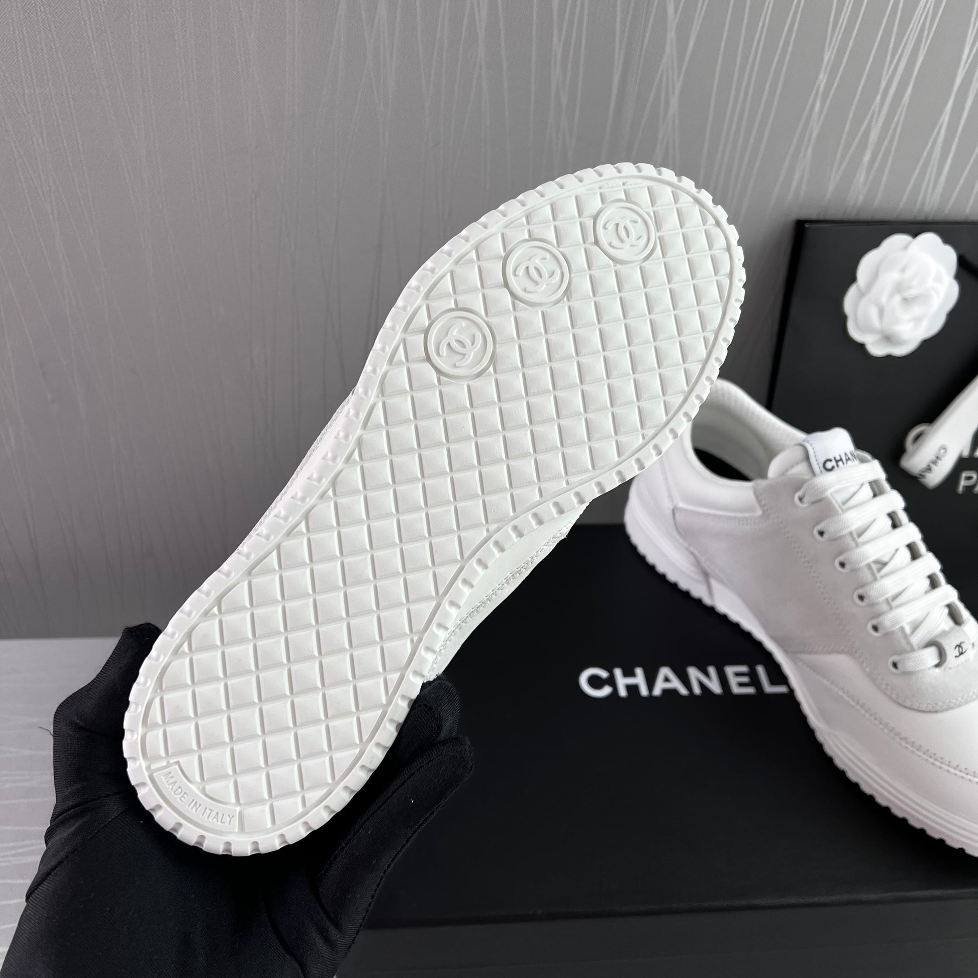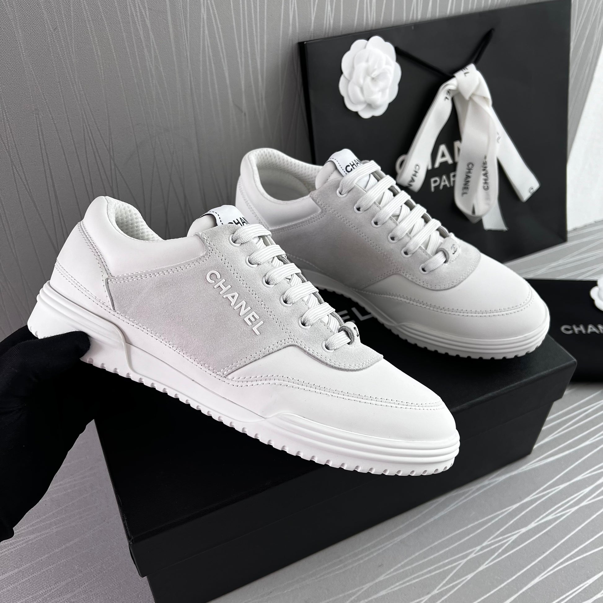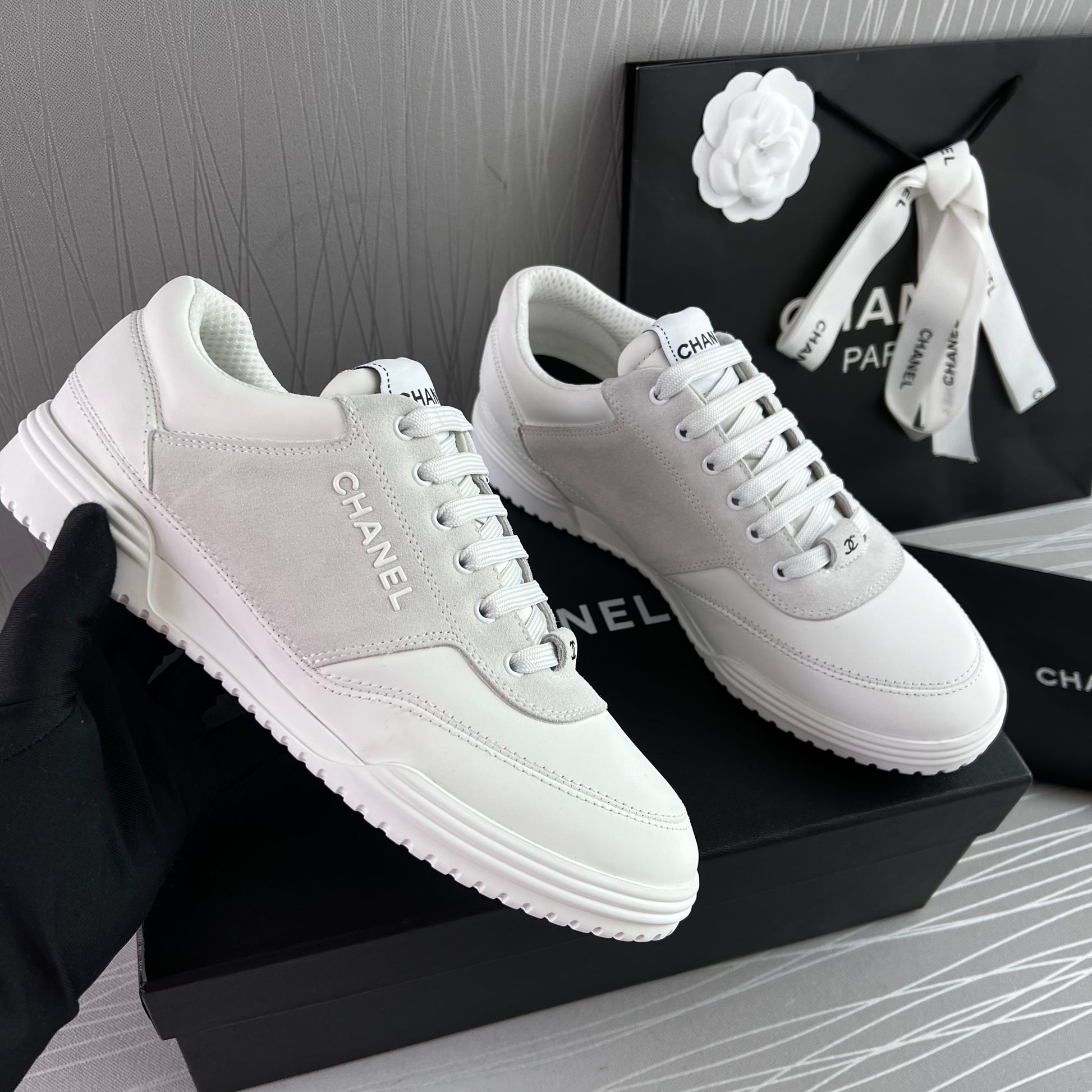 Sneakers piel color blanco con gamuza. Letras realzadas Chanel. Incluye caja, cubrepolvo.