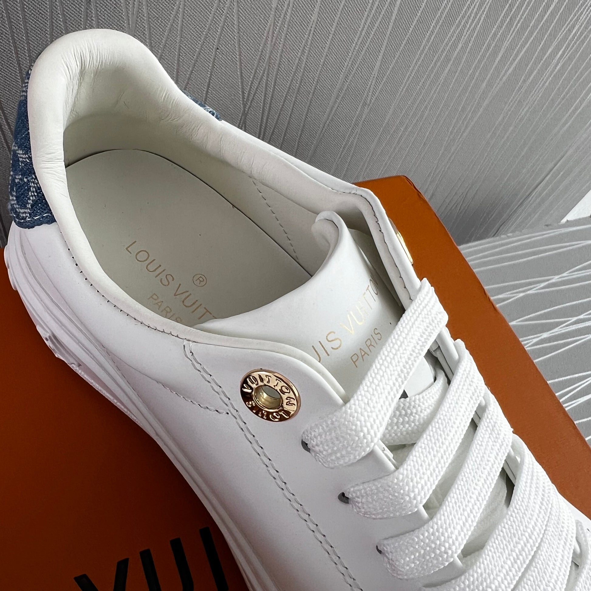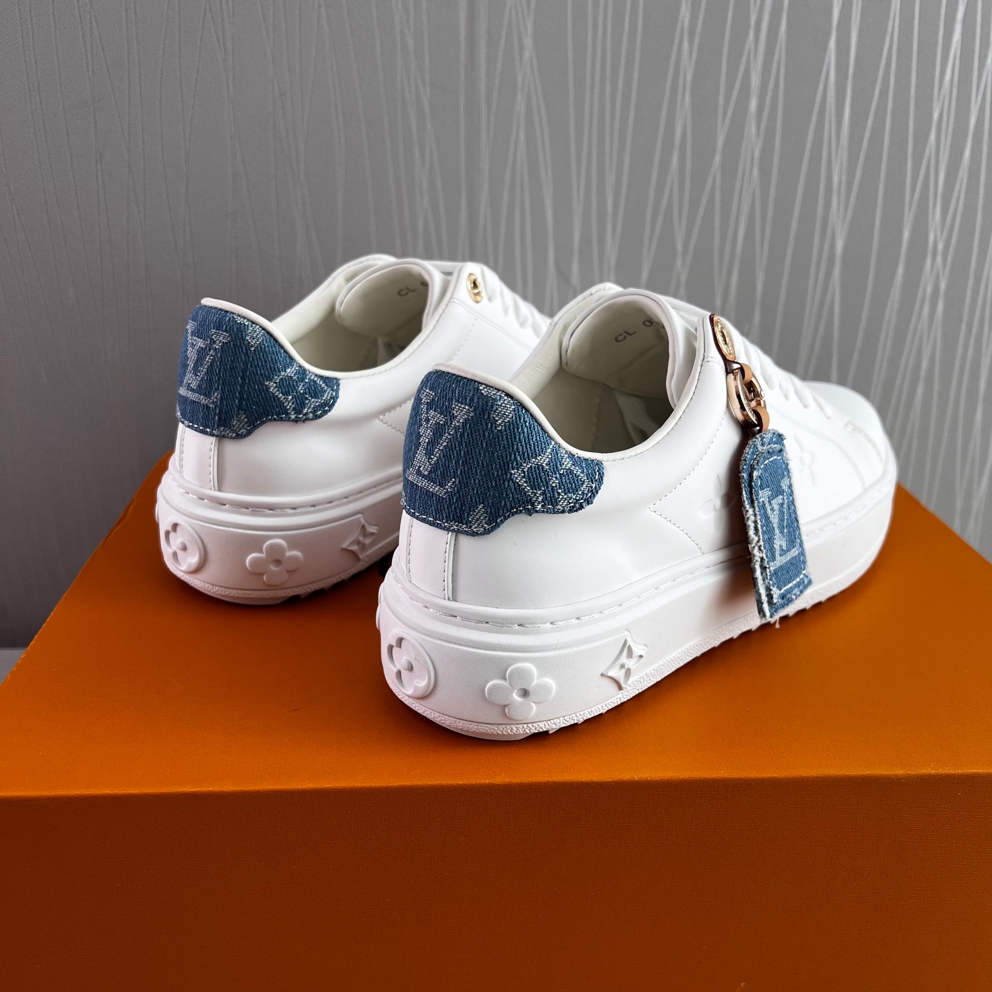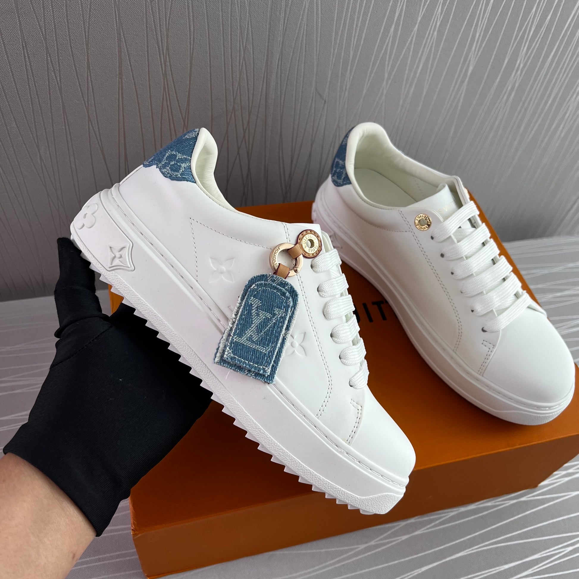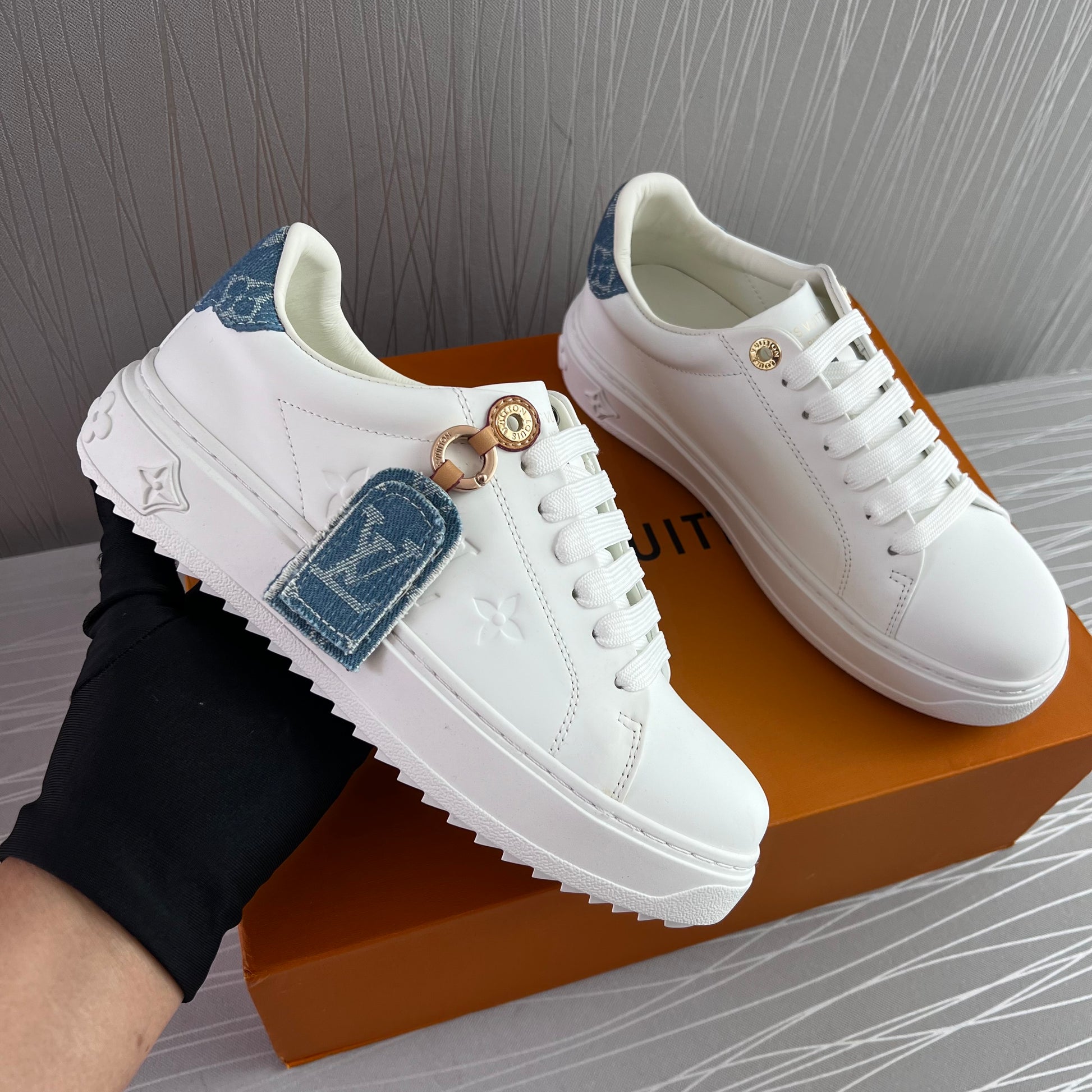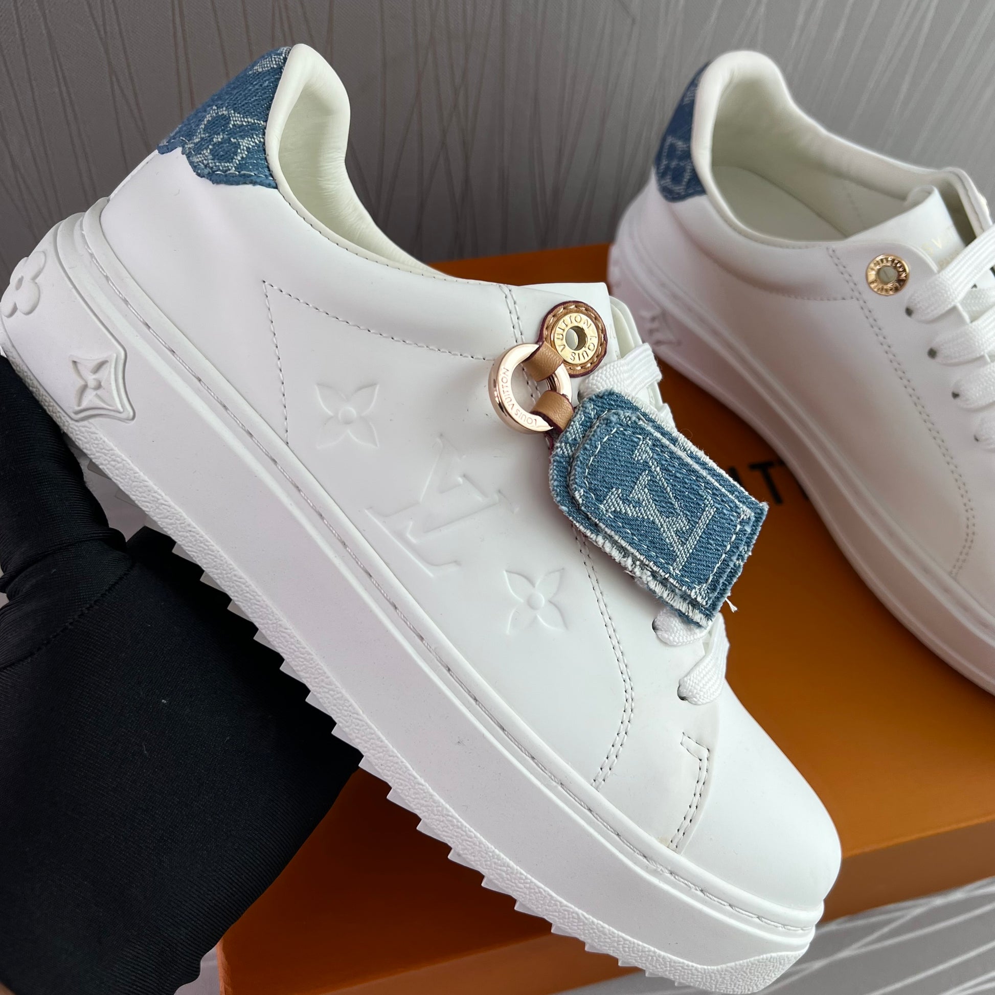 Sneakers en piel color blanco con ribetes de color azul mezclilla, incluye caja.