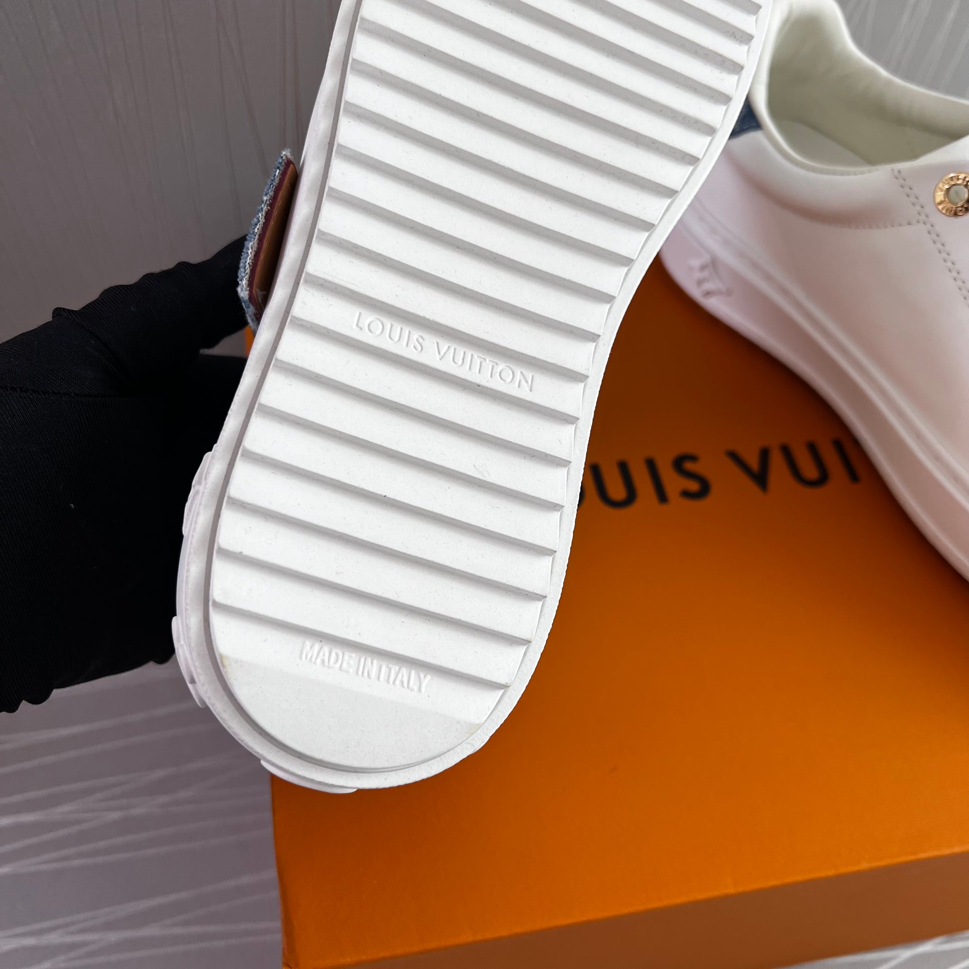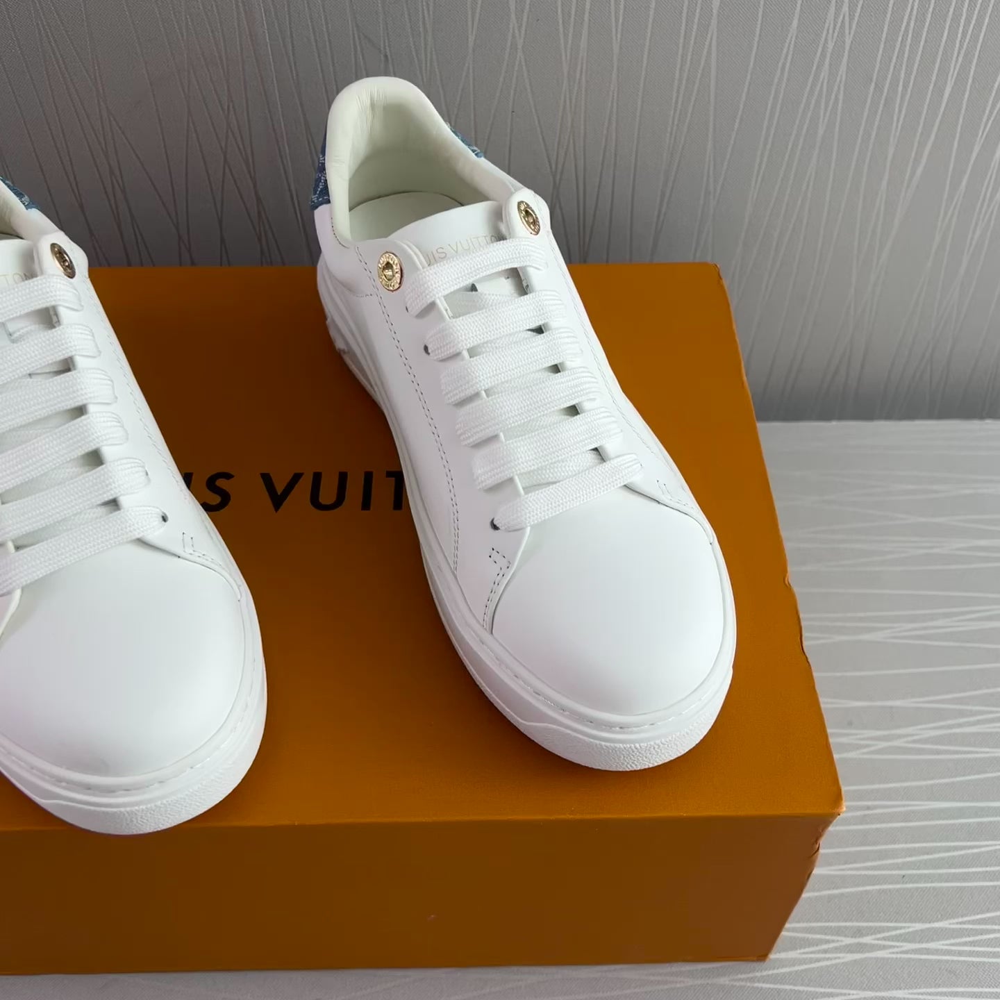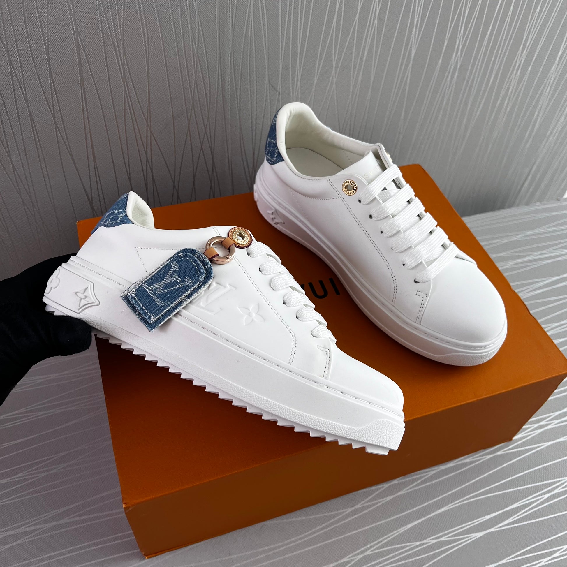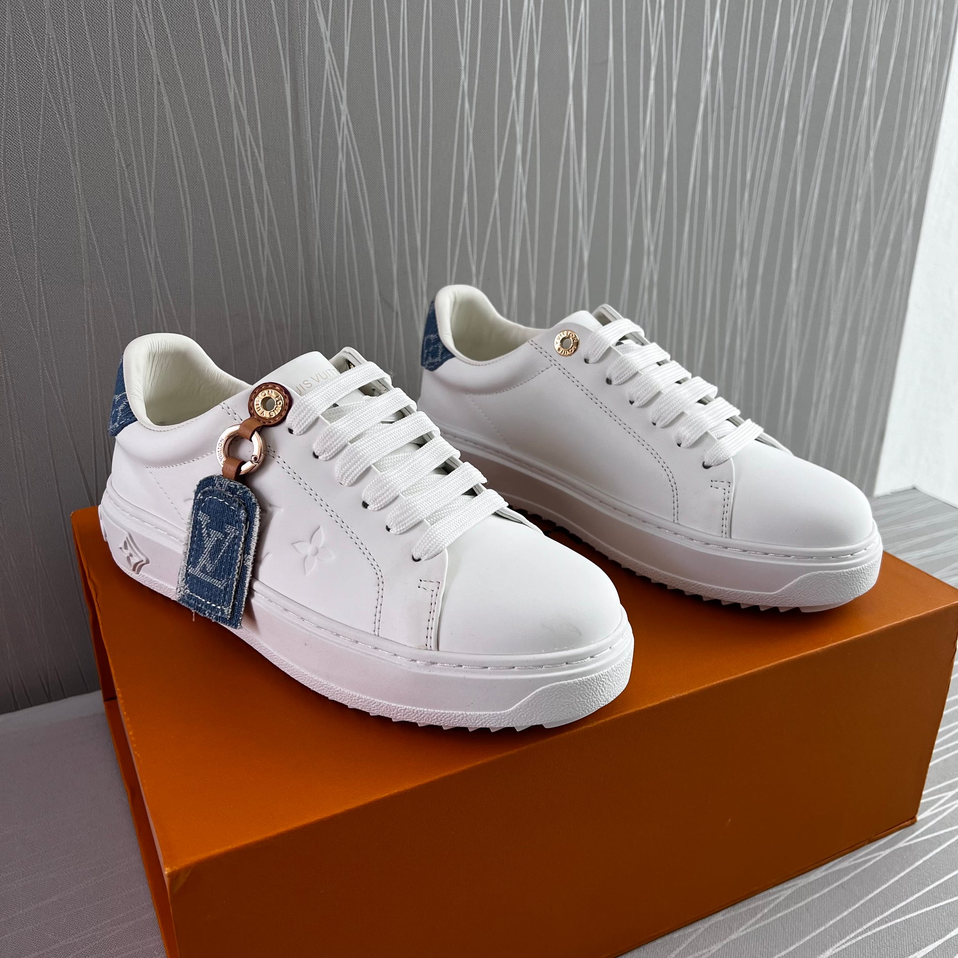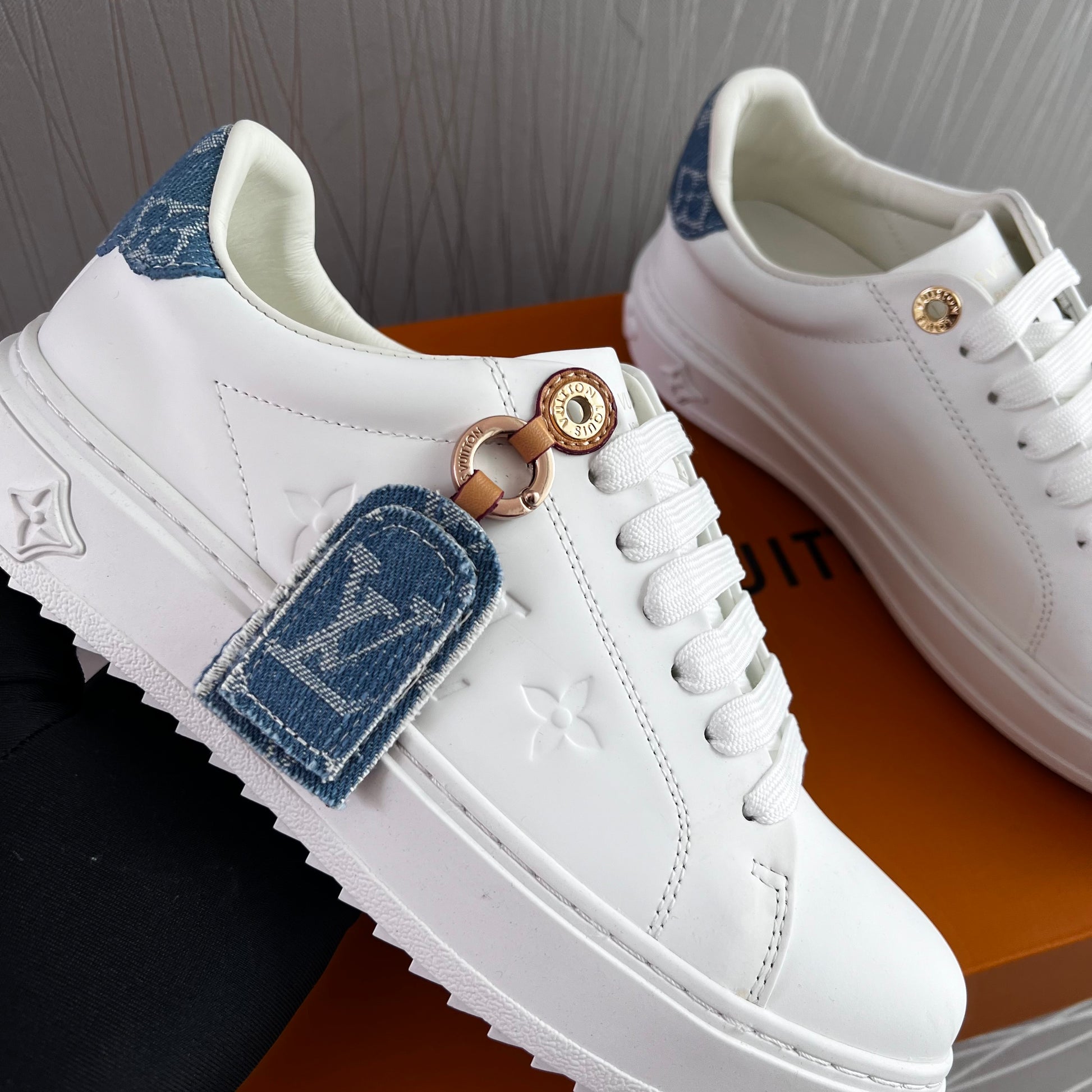 Sneakers en piel color blanco con ribetes de color azul mezclilla, incluye caja.