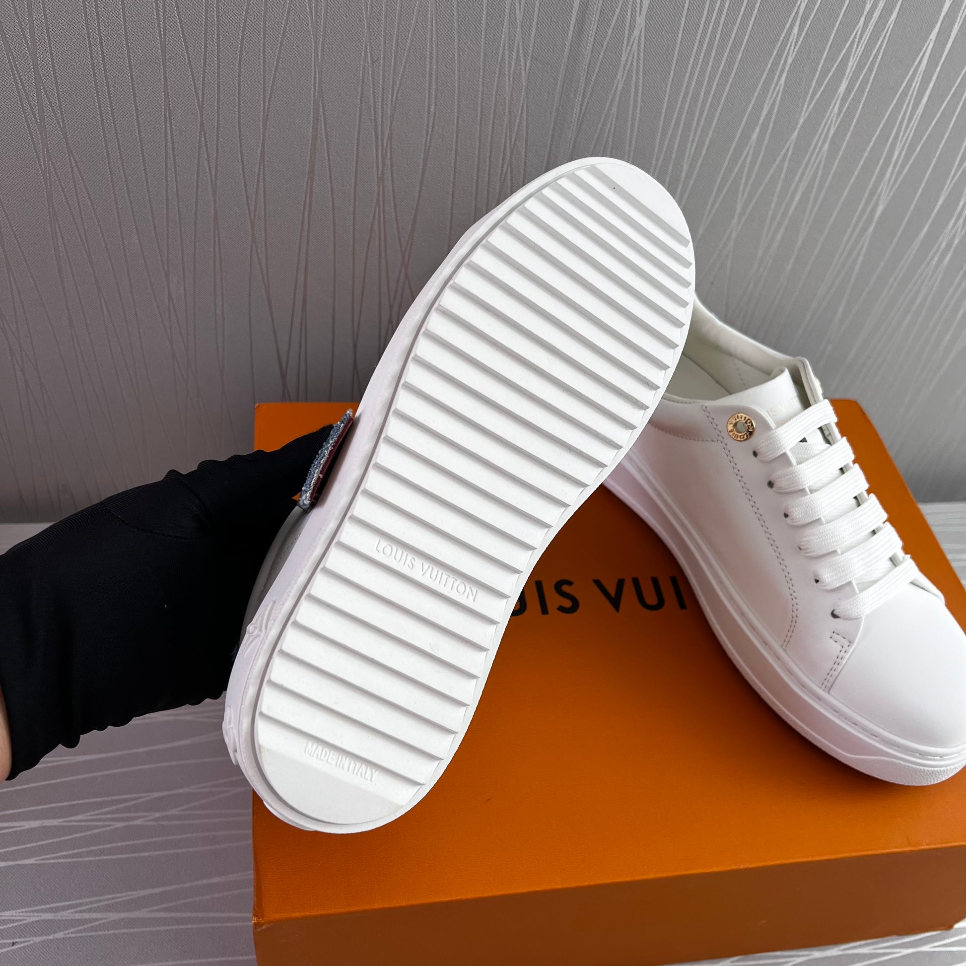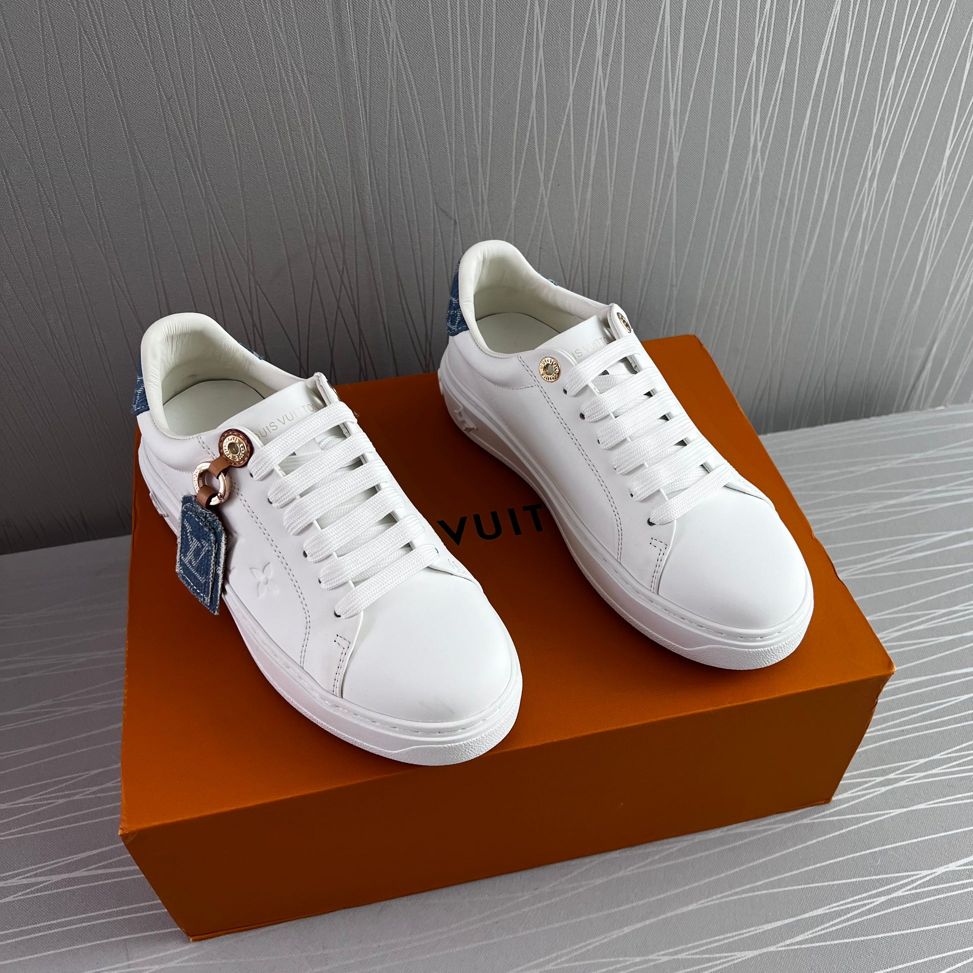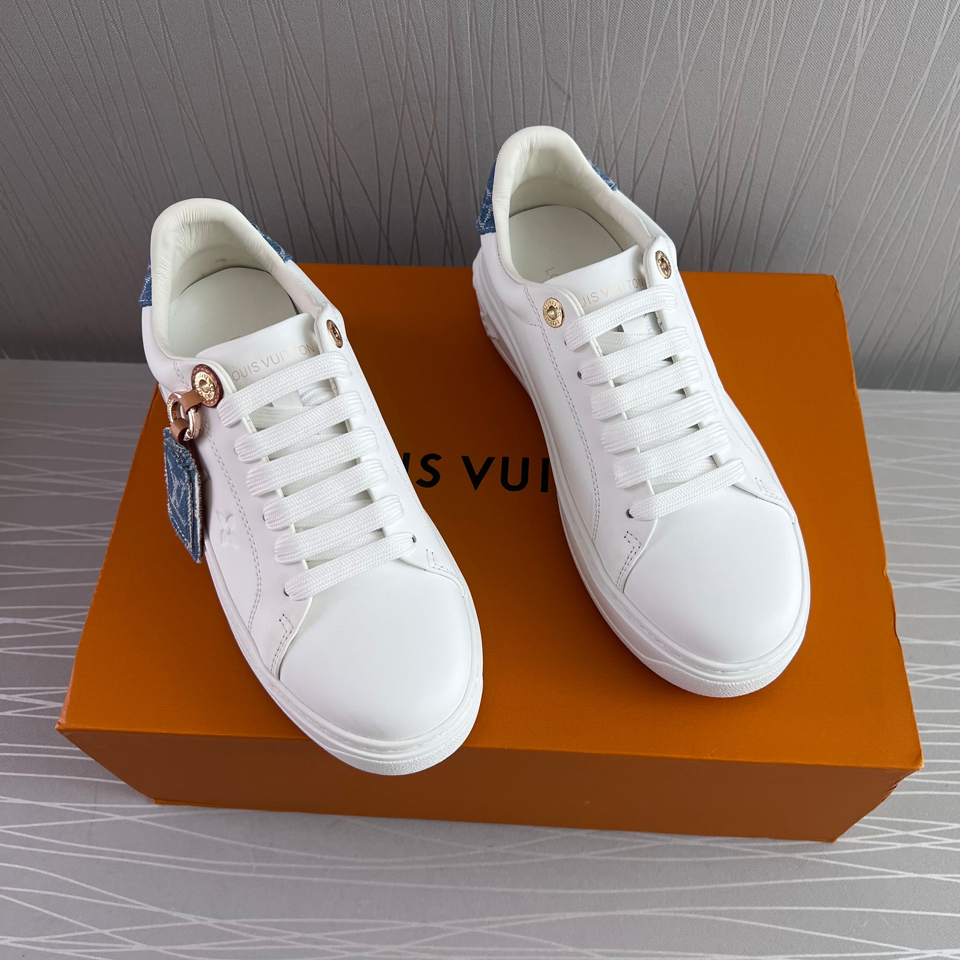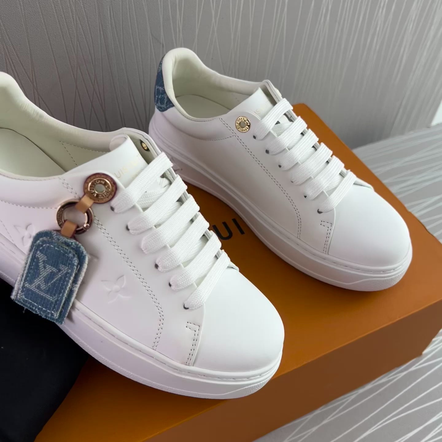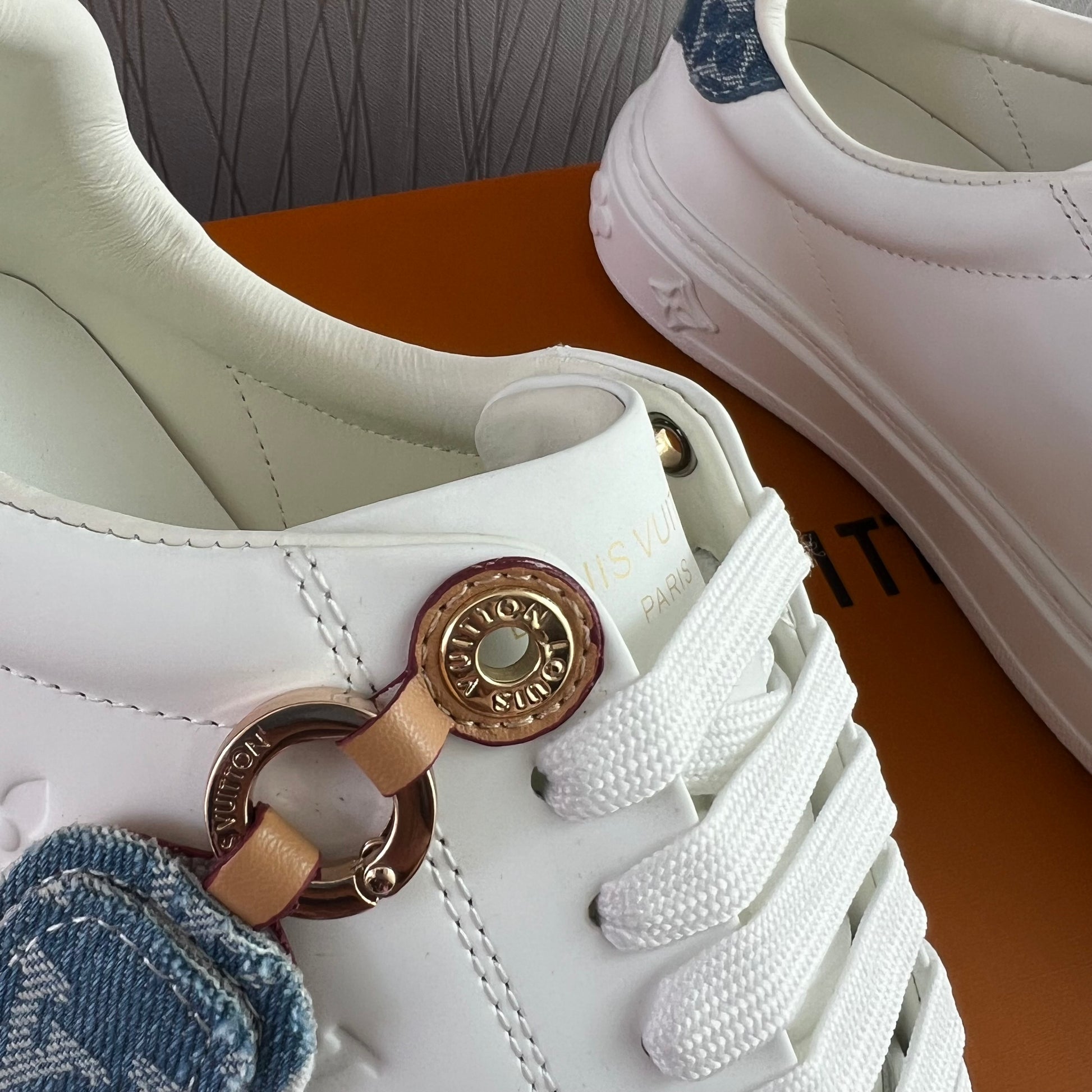 Sneakers en piel color blanco con ribetes de color azul mezclilla, incluye caja.