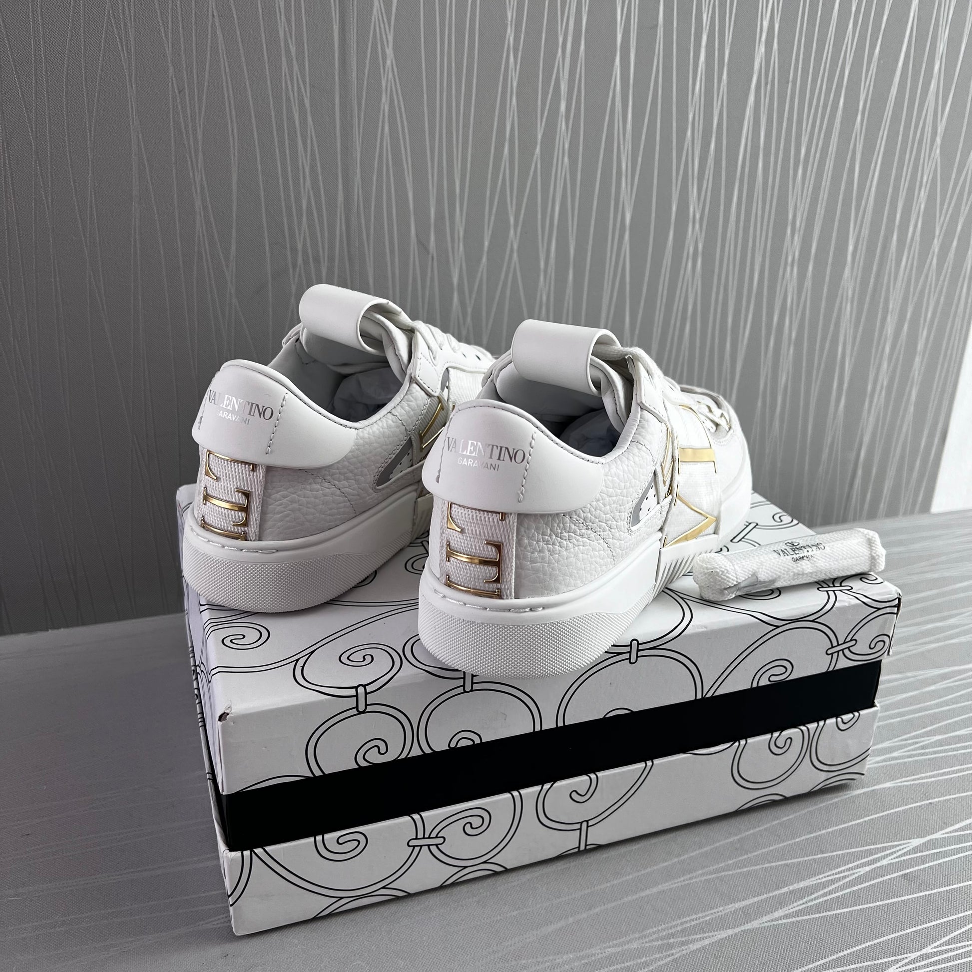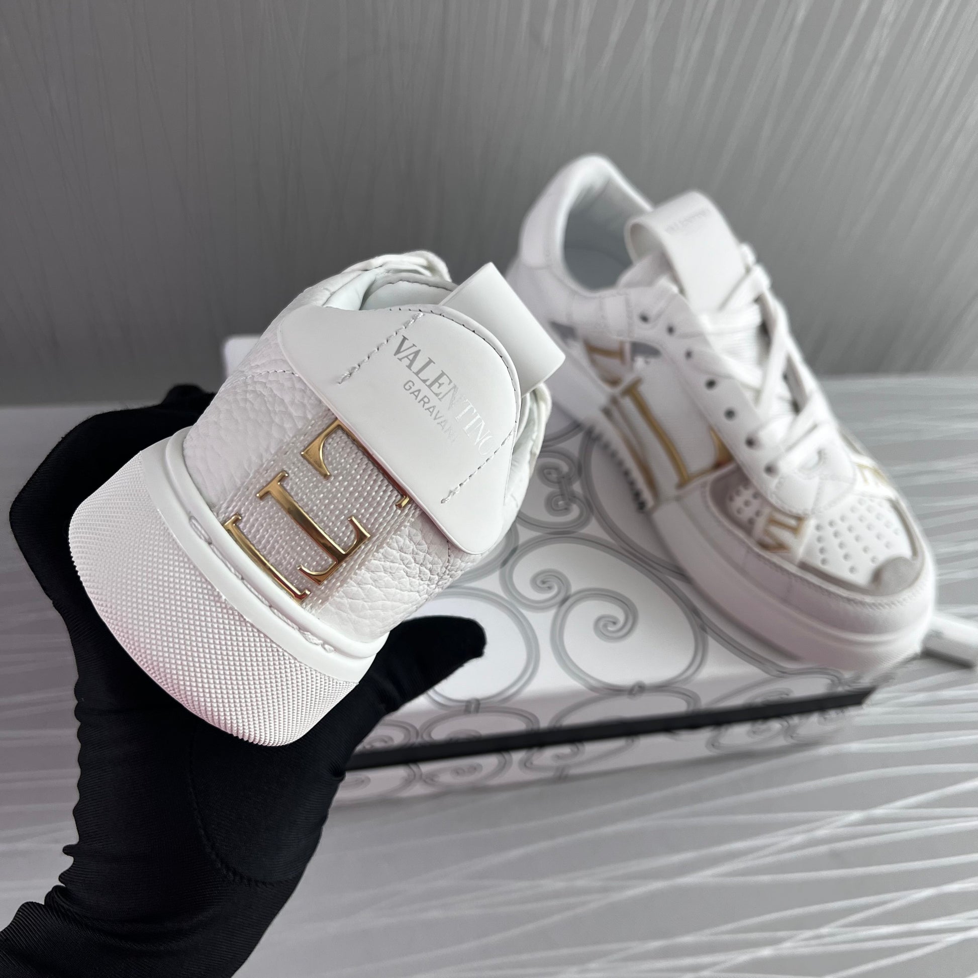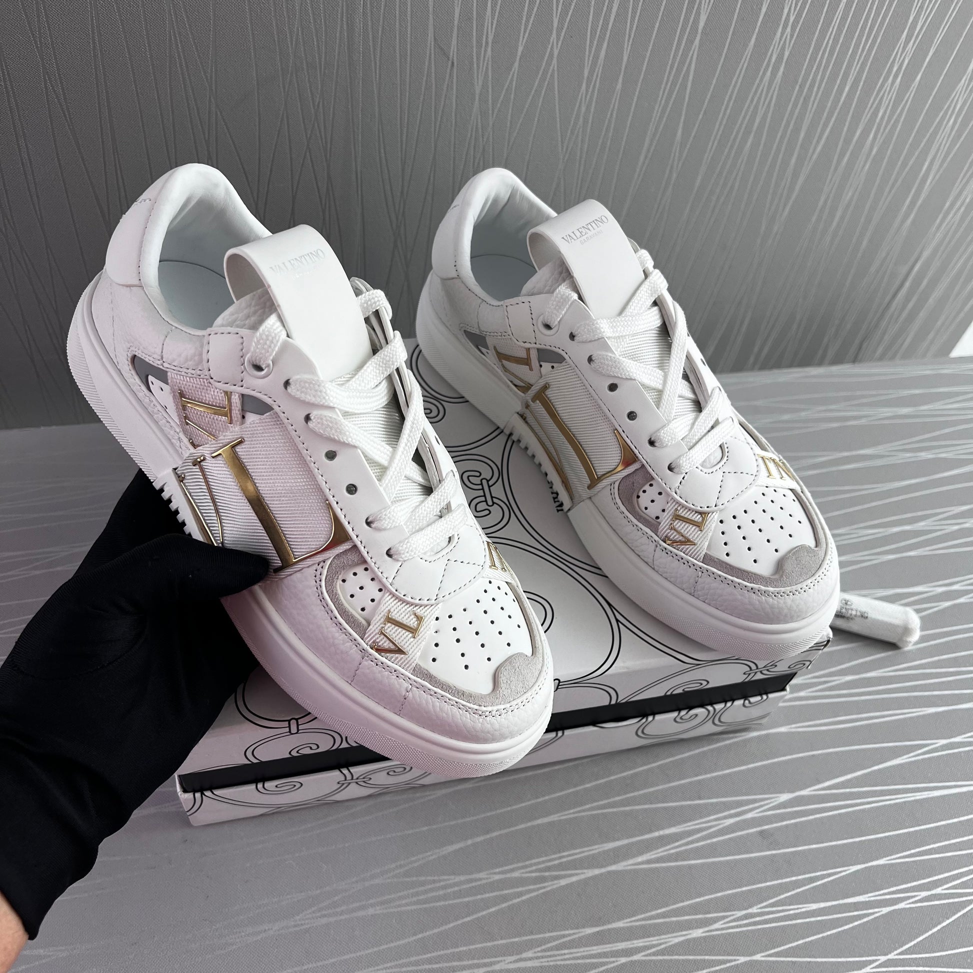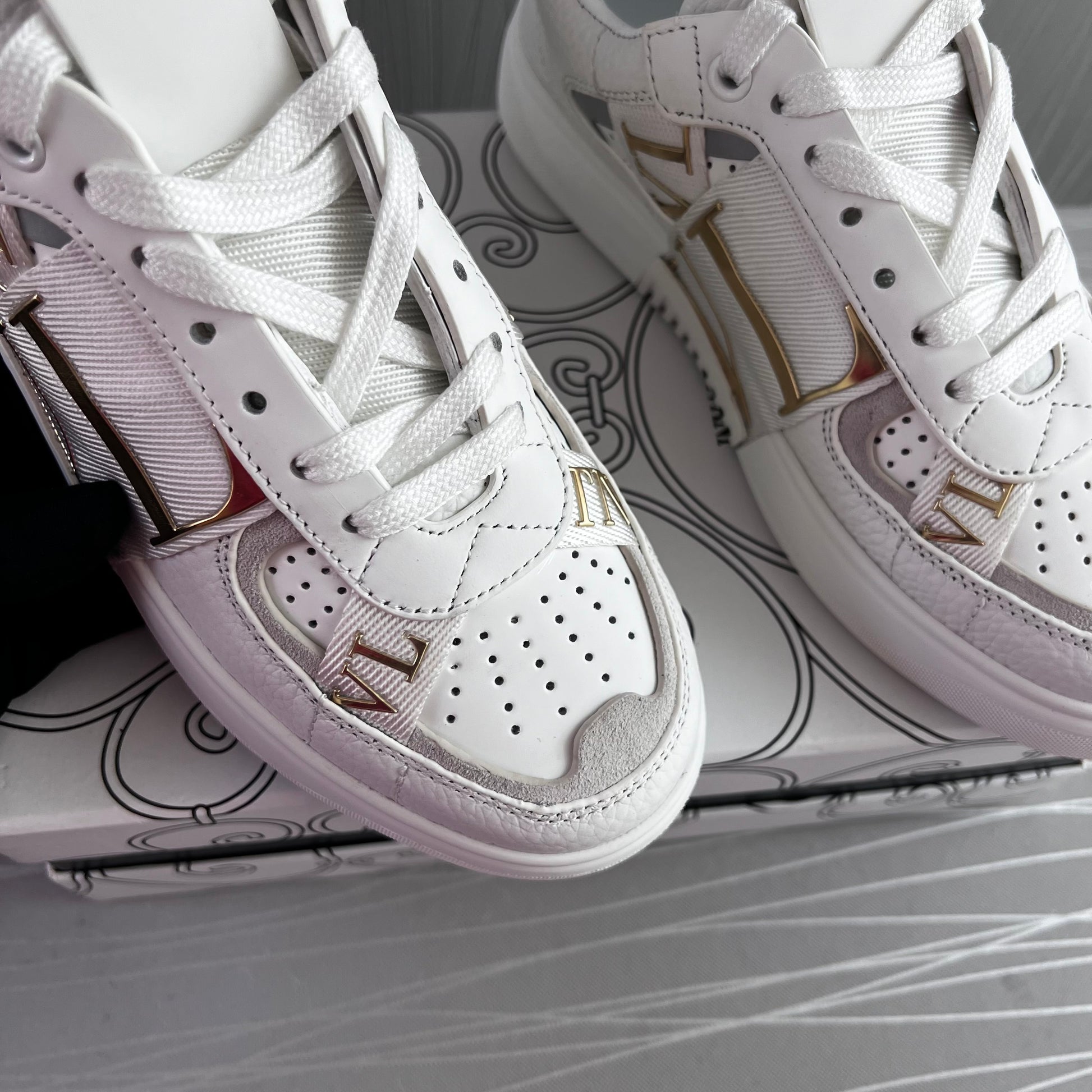 Sneakers en piel blancos con dorado.