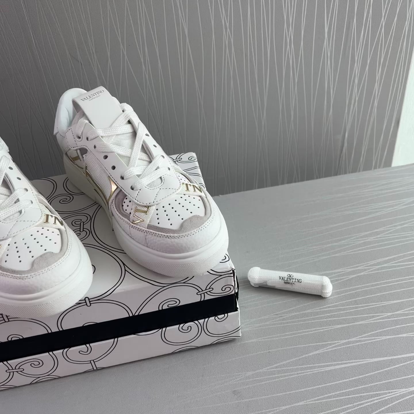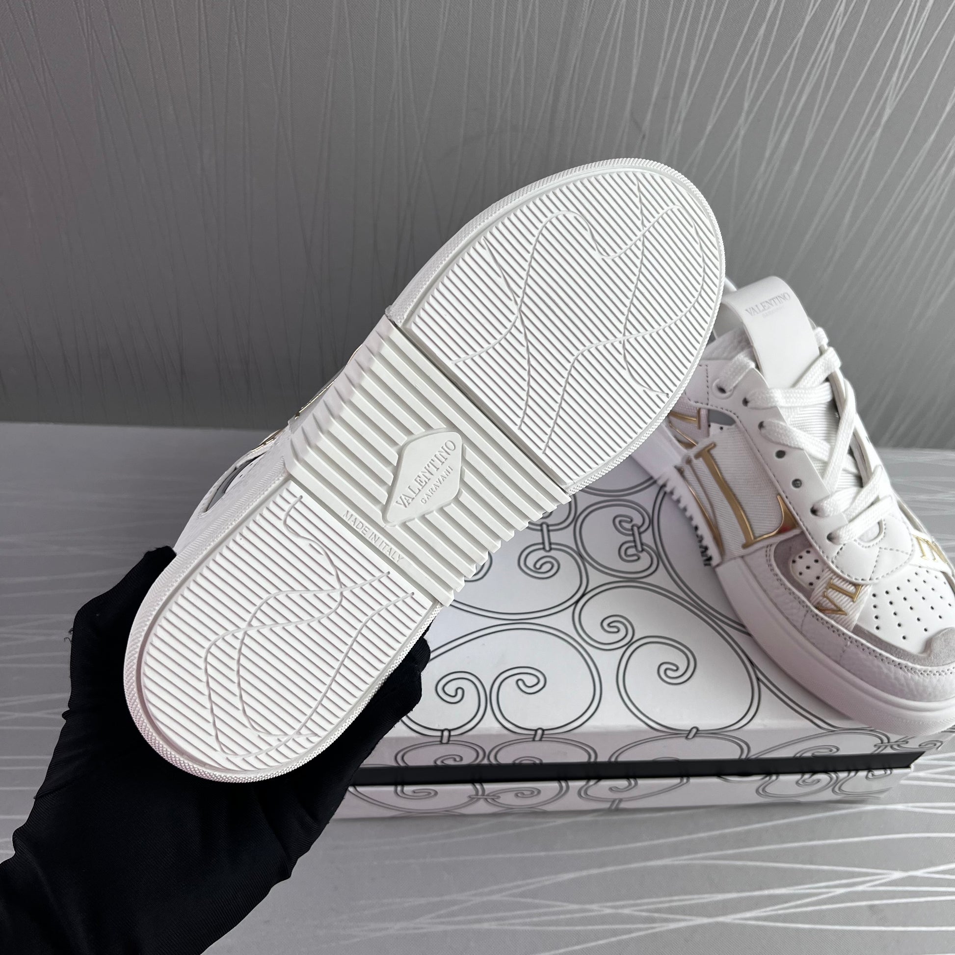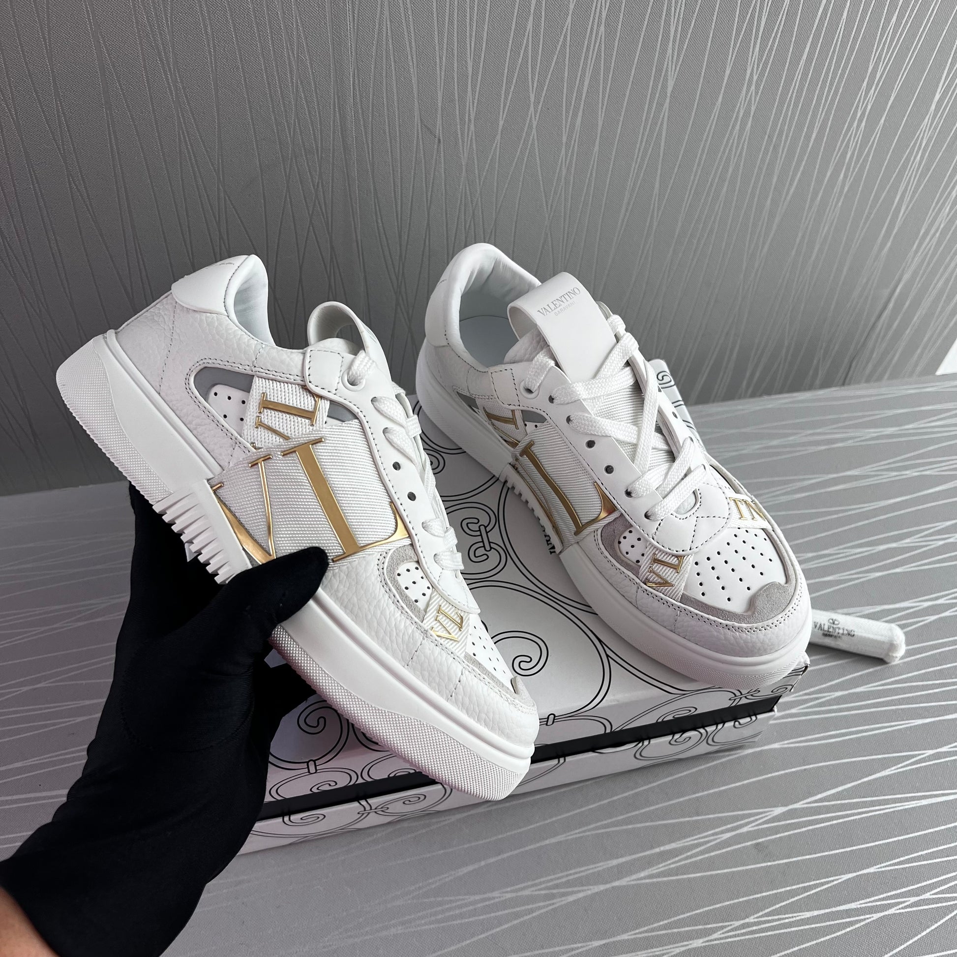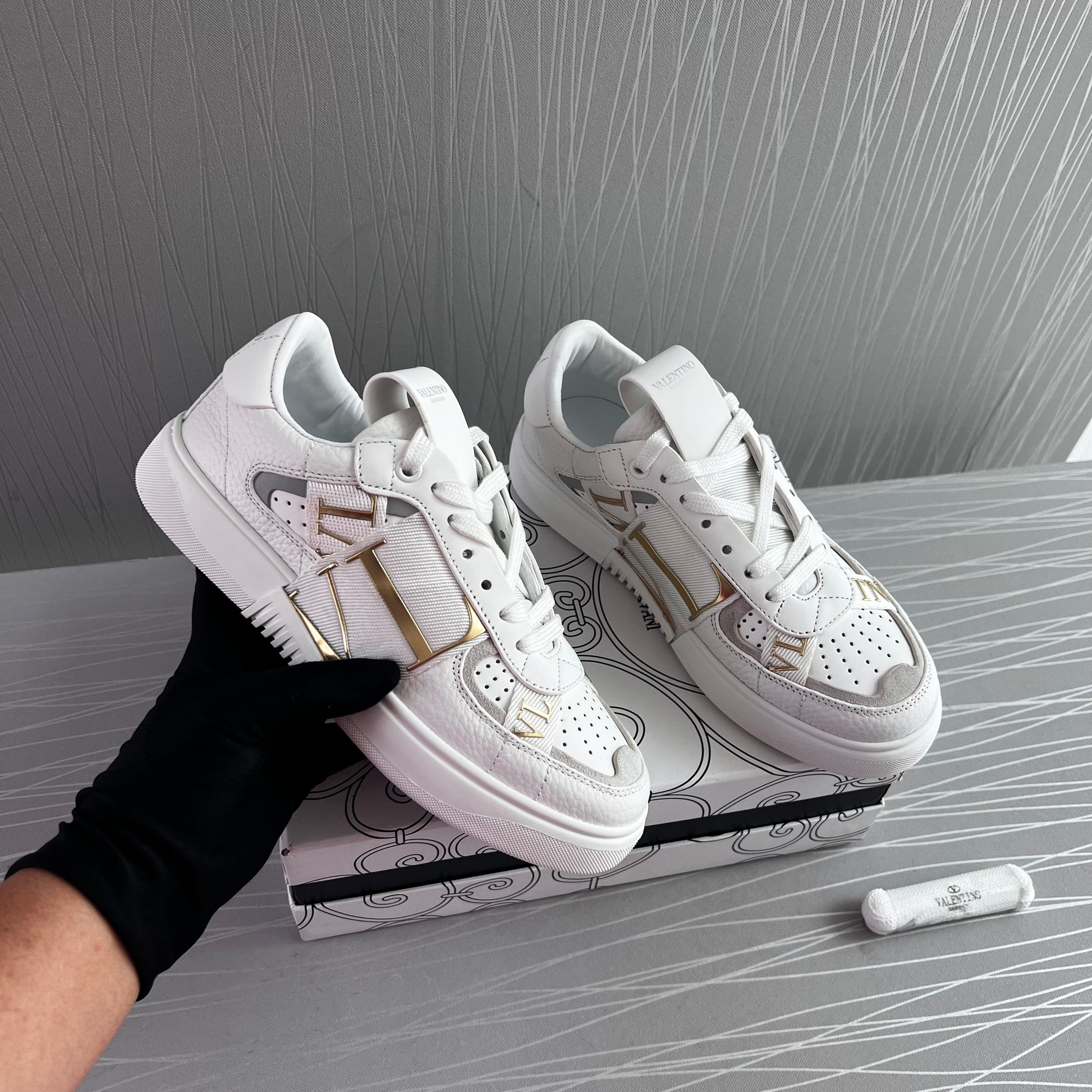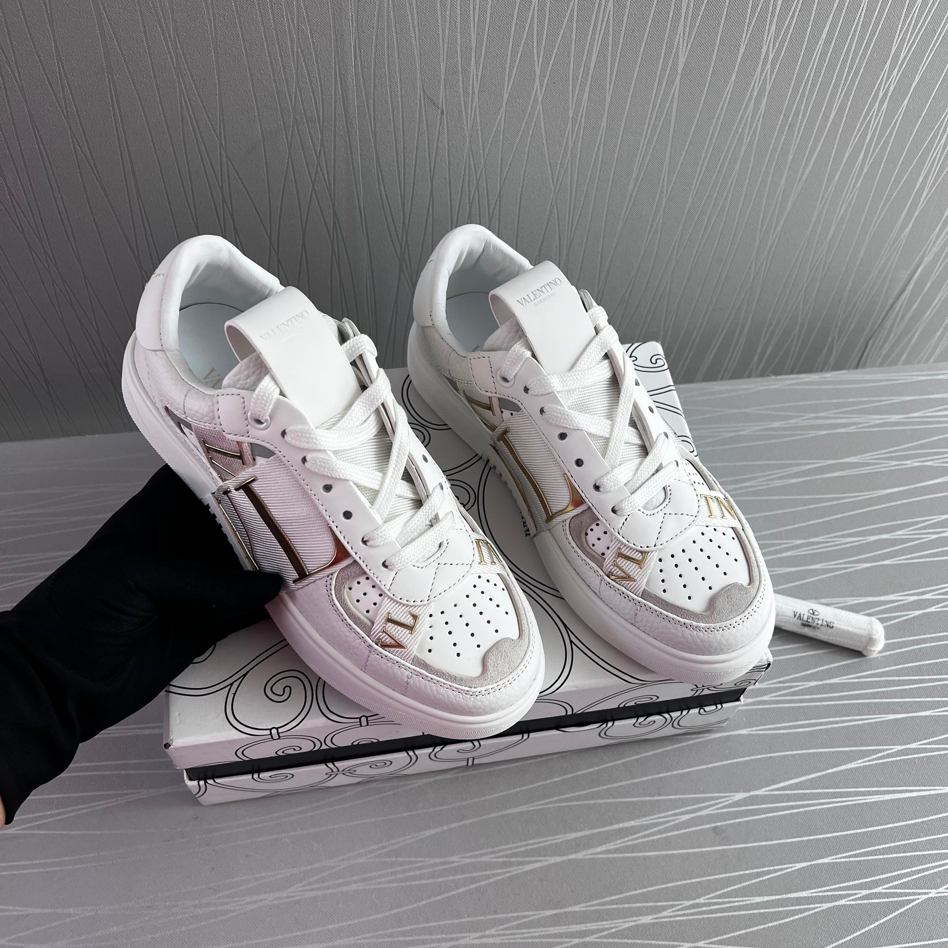Sneakers en piel blancos con dorado.