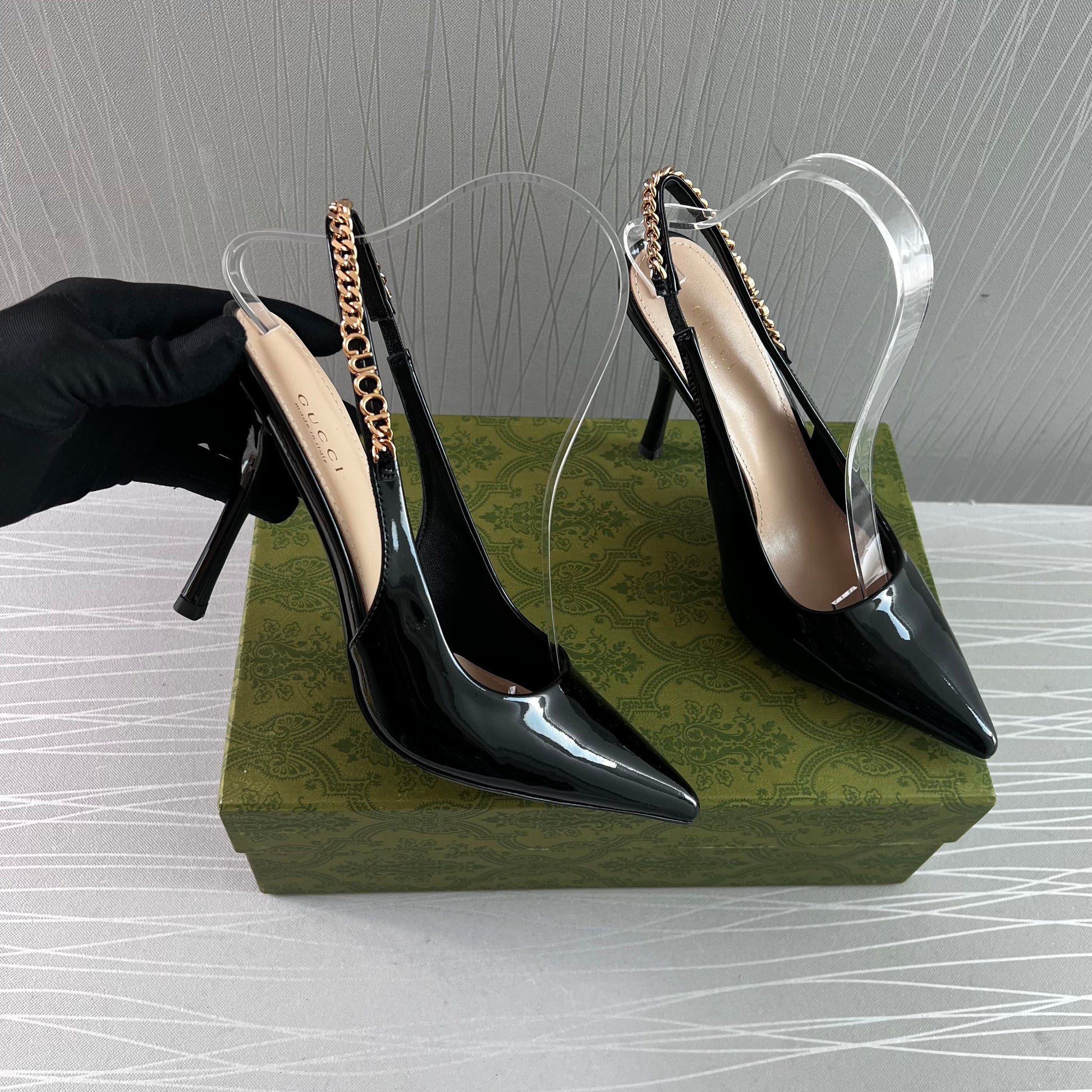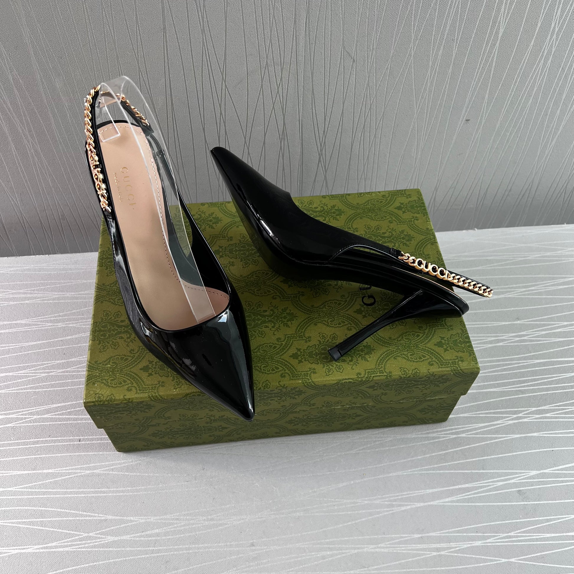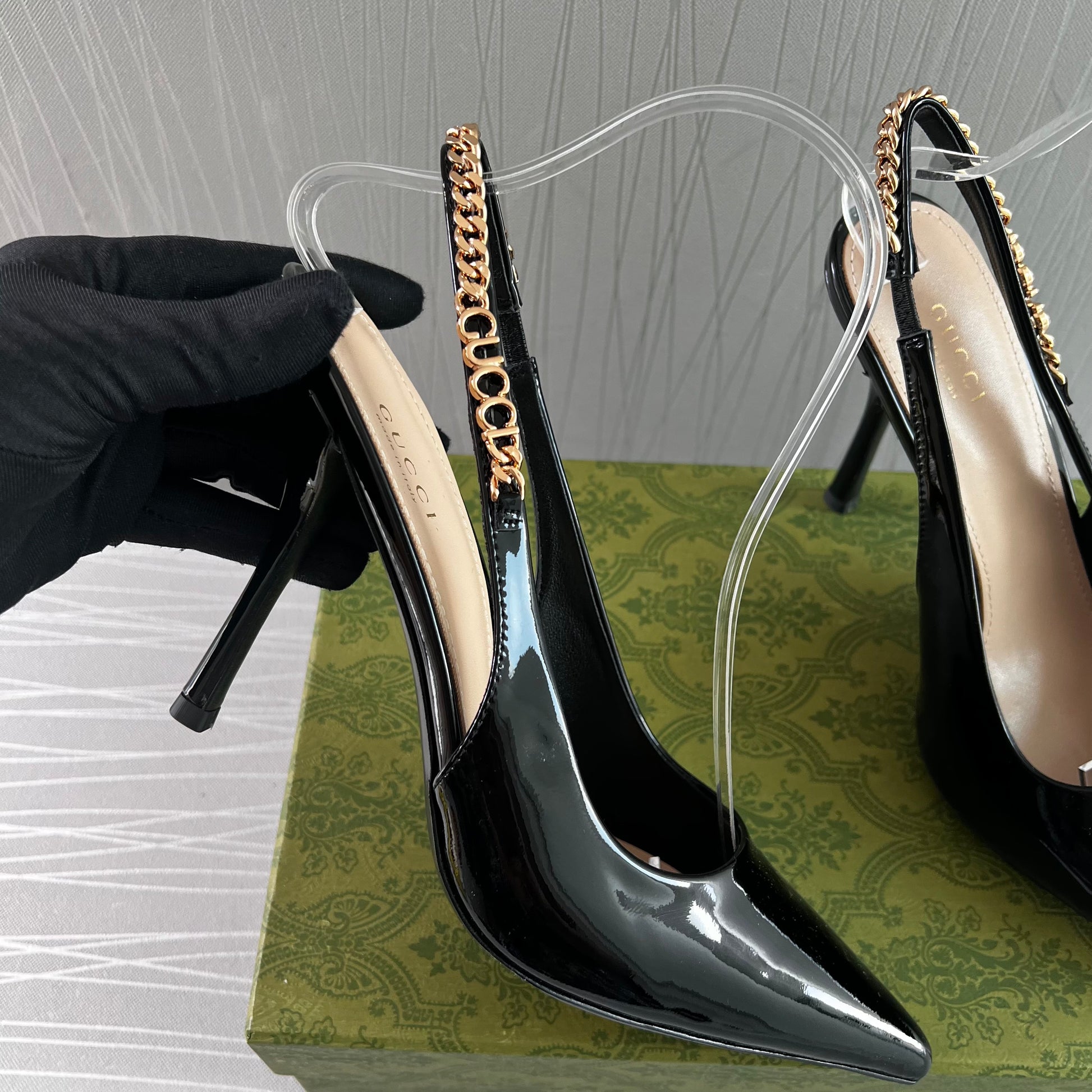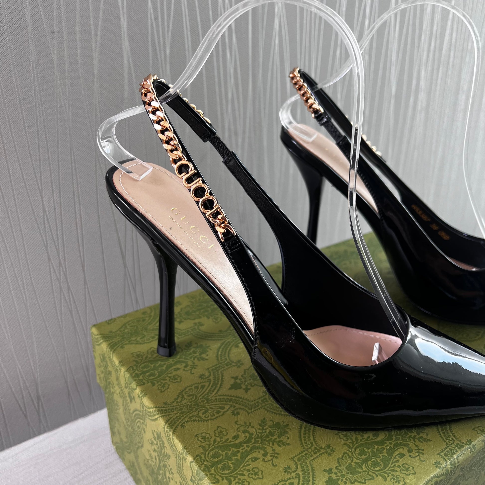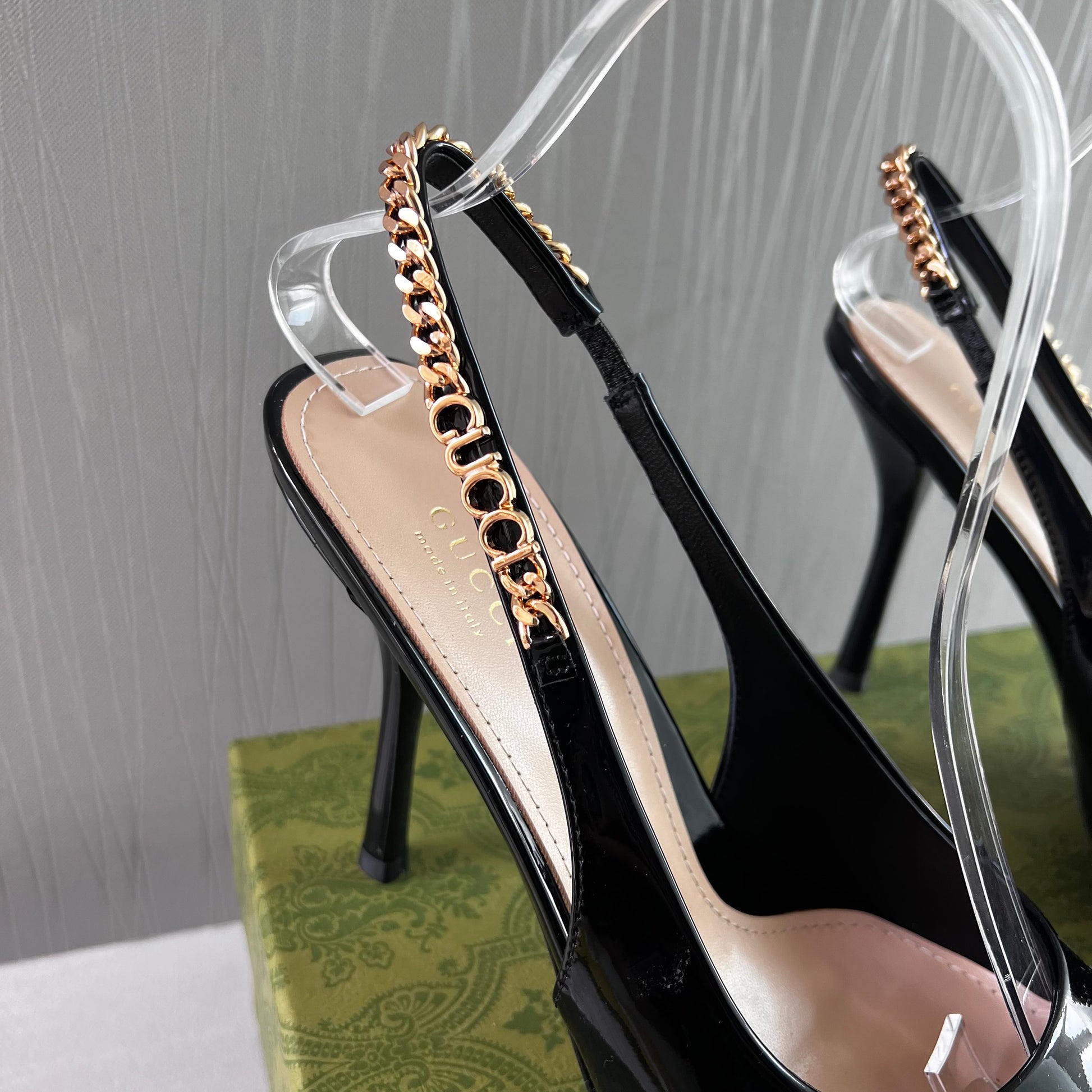 Zapatillas G charol negro, con herraje en color dorado. Tacón 10 cm. Incluye caja, cubrepolvo y Shopping bag.