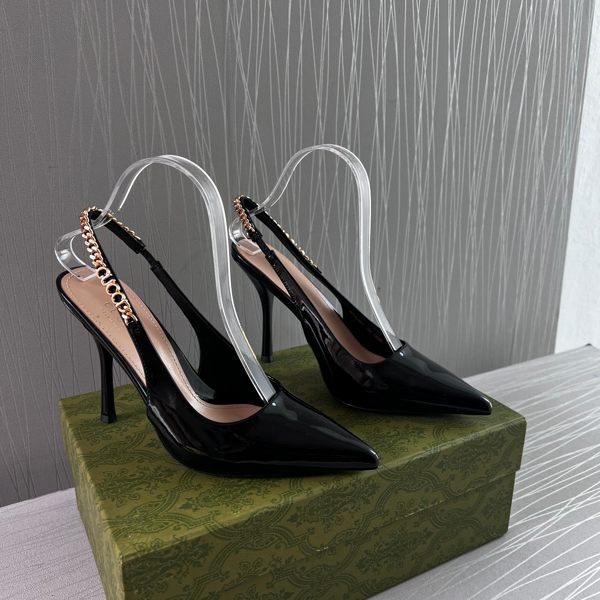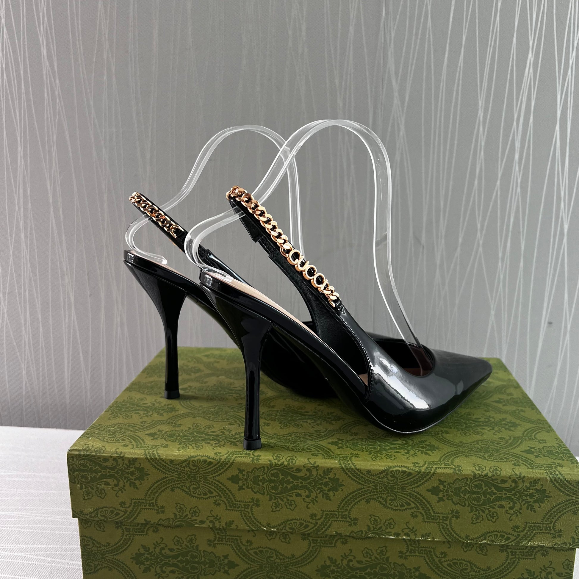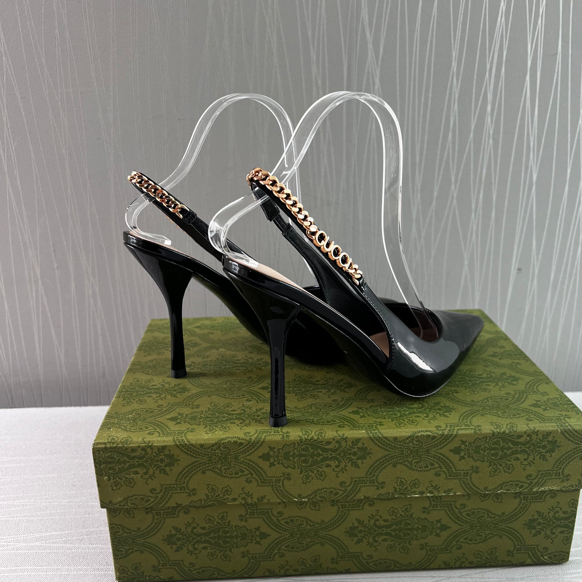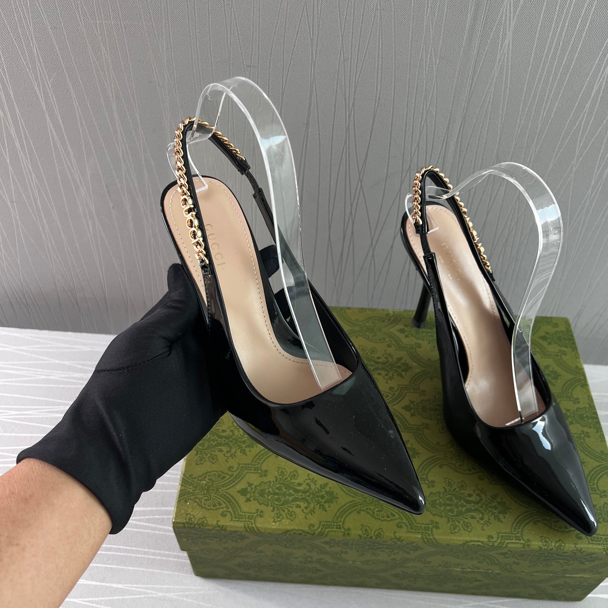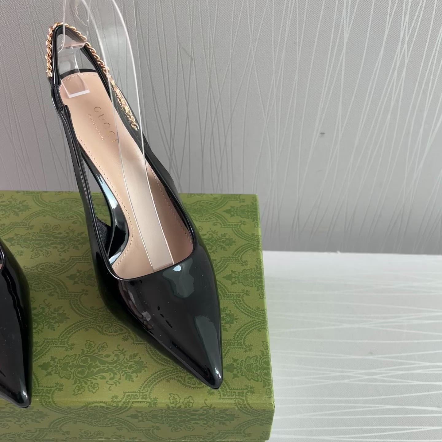 Zapatillas G charol negro, con herraje en color dorado. Tacón 10 cm. Incluye caja, cubrepolvo y Shopping bag.