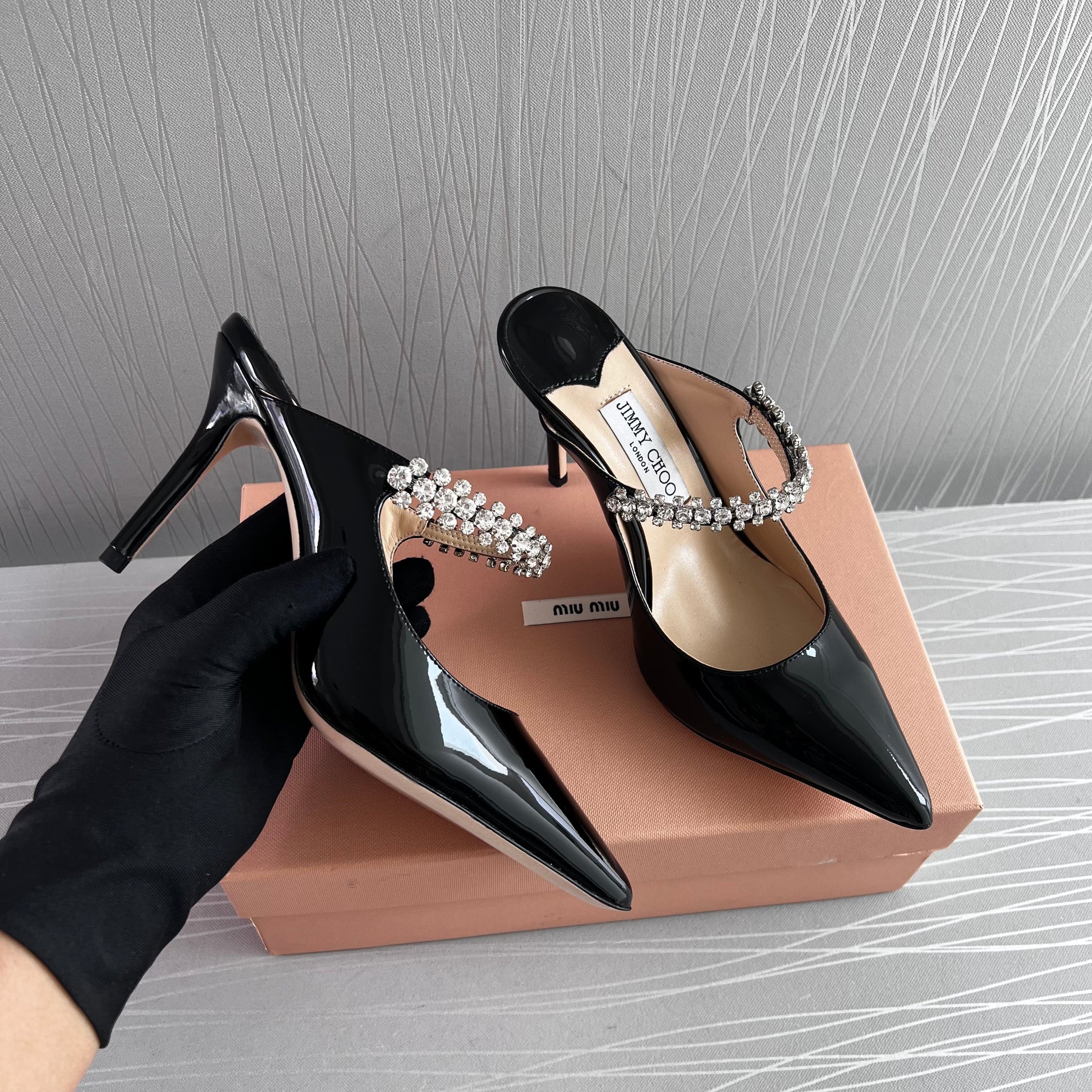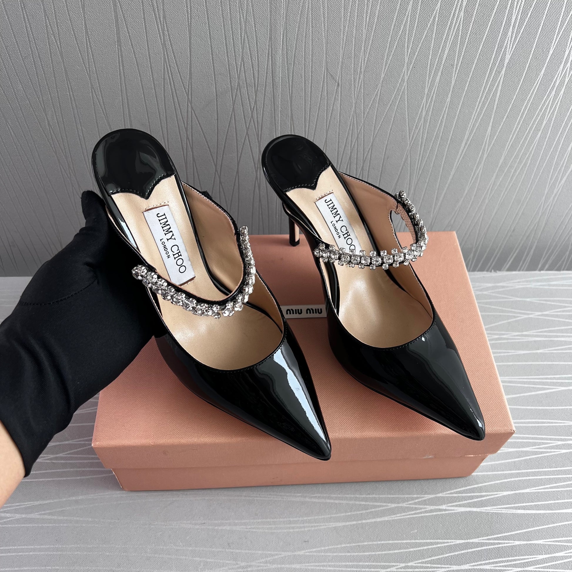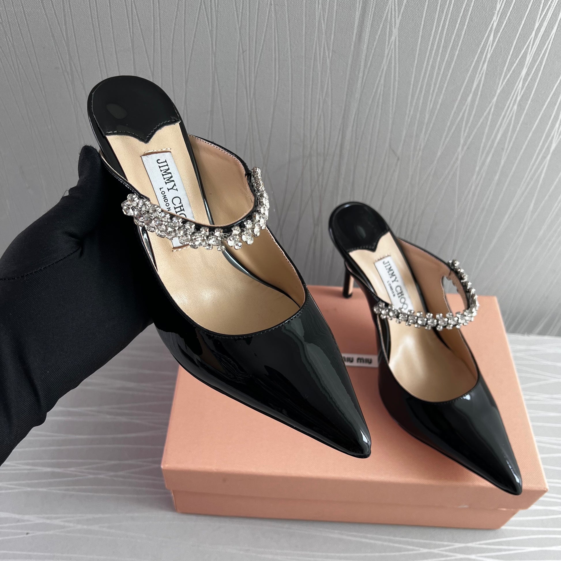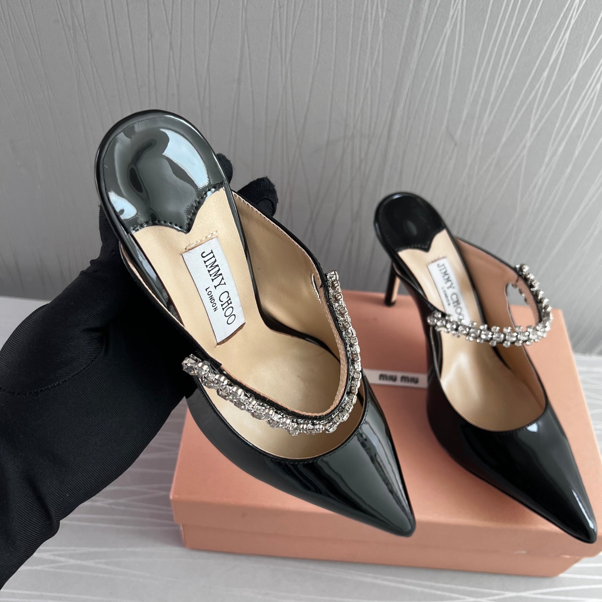 Zapatillas J charol negro con adorno de piedras en color plata. Tacón 10 cm. Incluye cubre polvos.