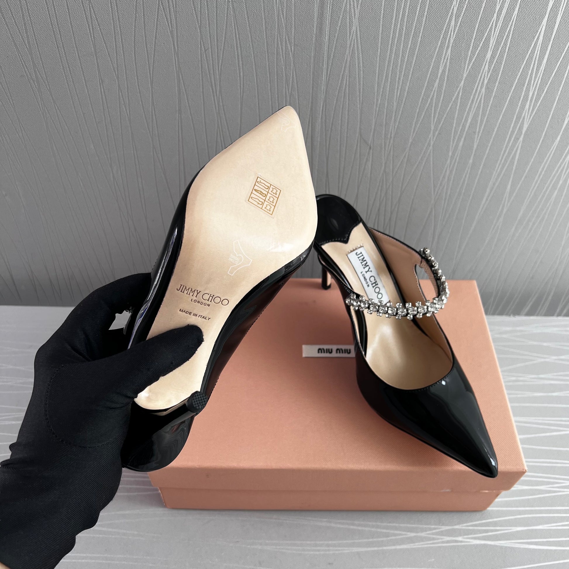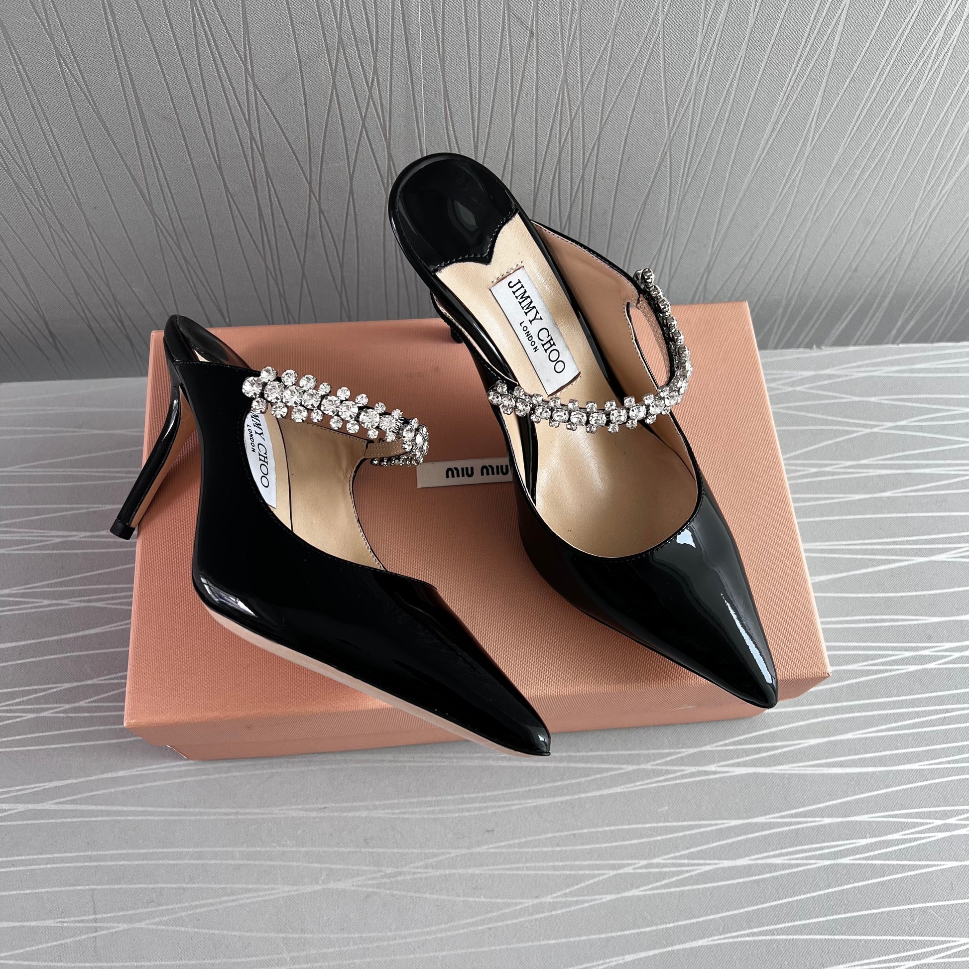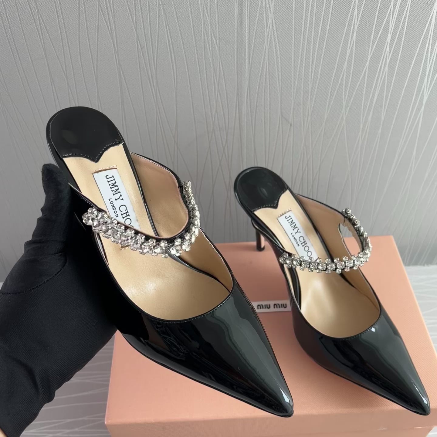 Zapatillas J charol negro con adorno de piedras en color plata. Tacón 10 cm. Incluye cubre polvos.