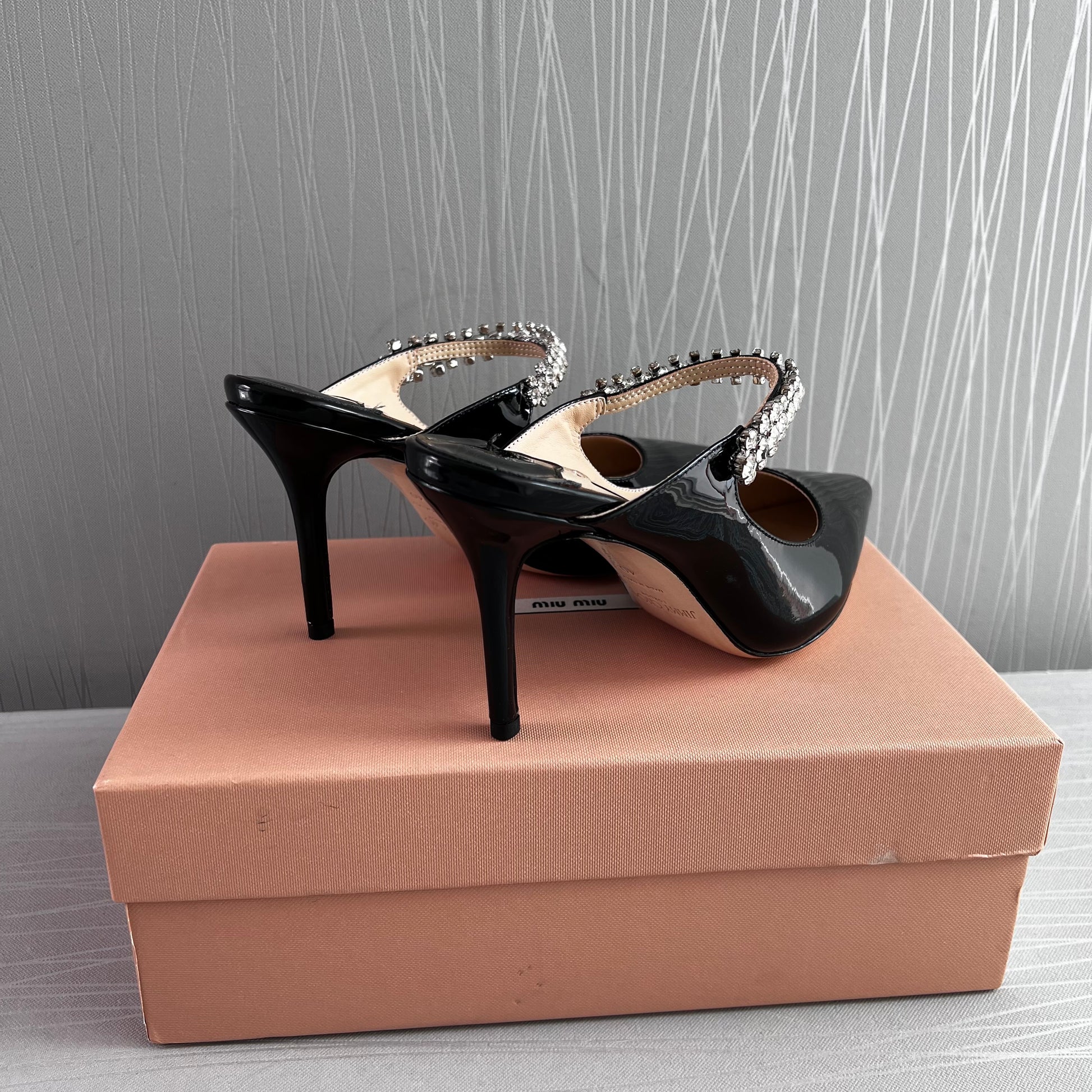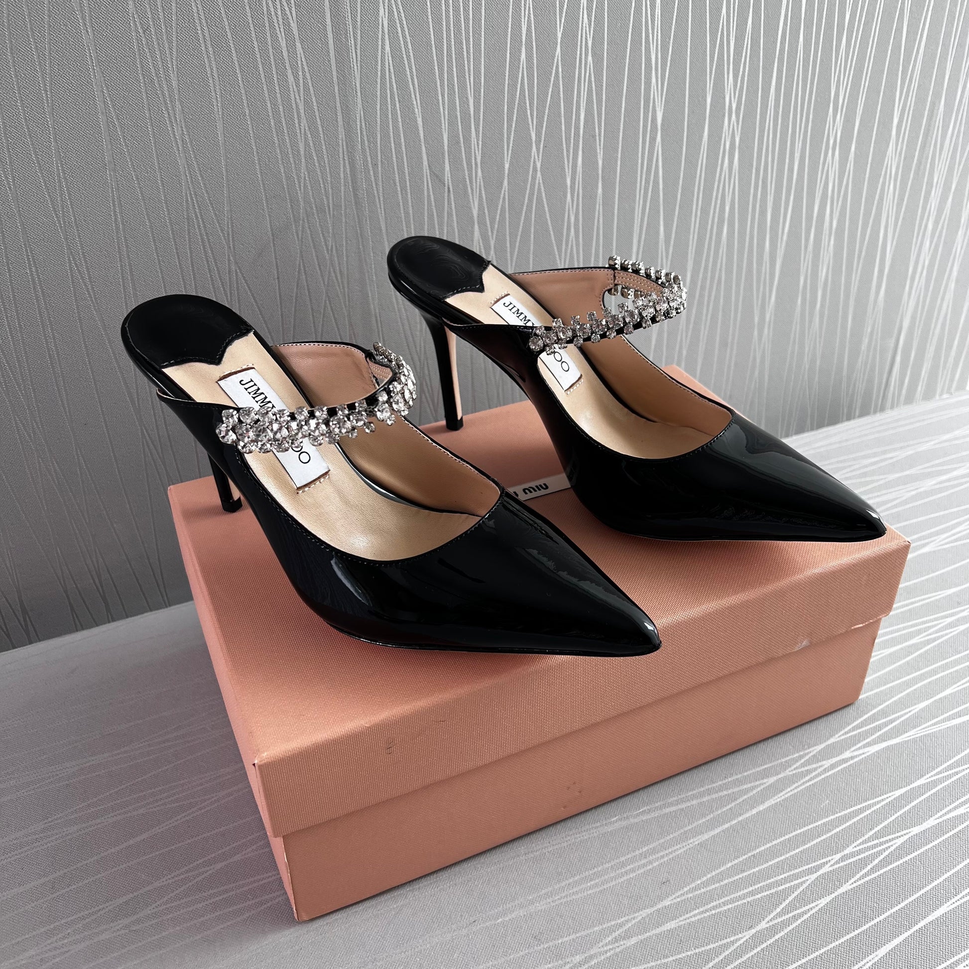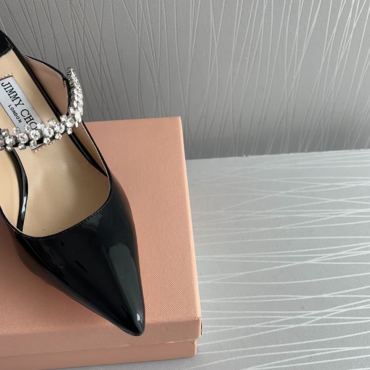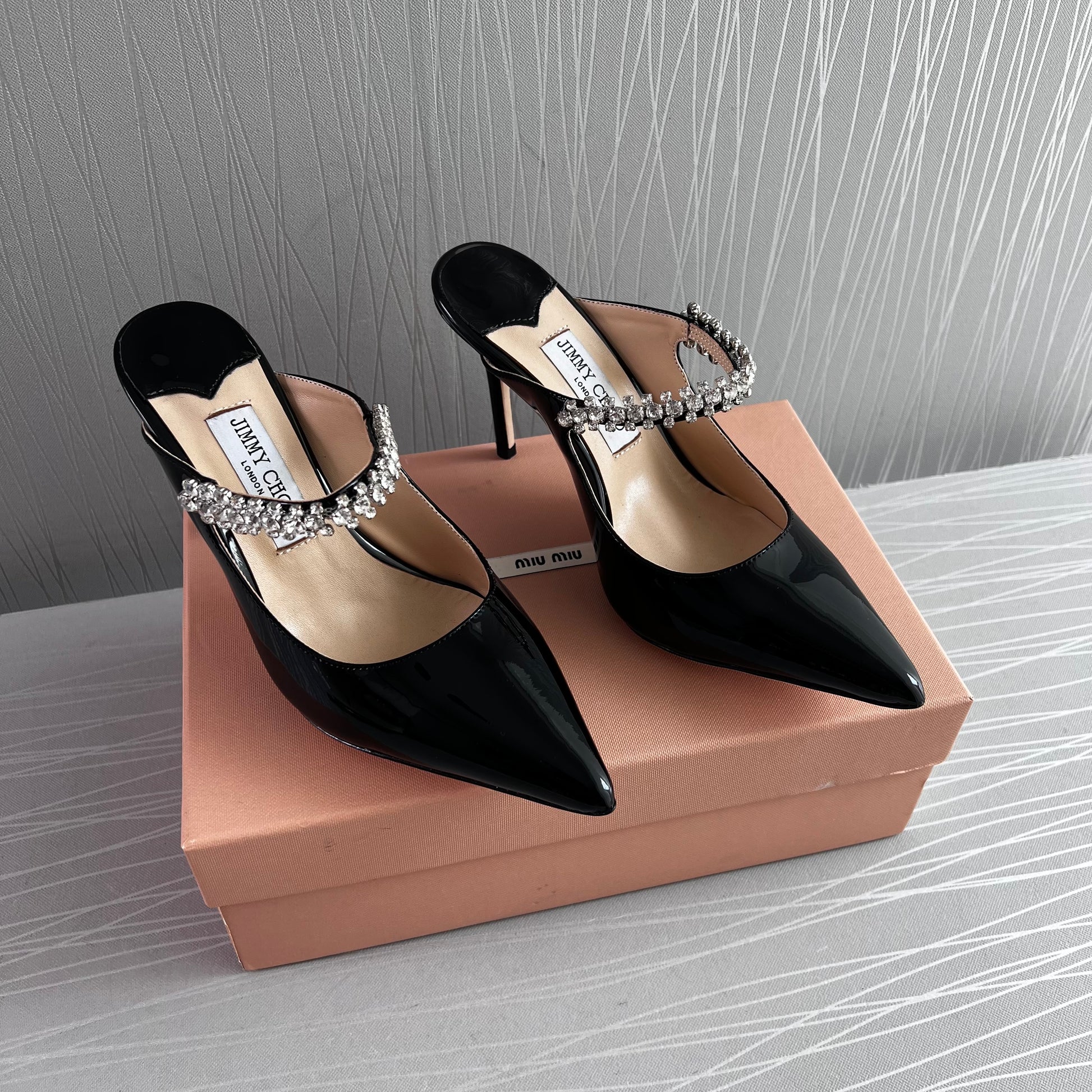 Zapatillas J charol negro con adorno de piedras en color plata. Tacón 10 cm. Incluye cubre polvos.